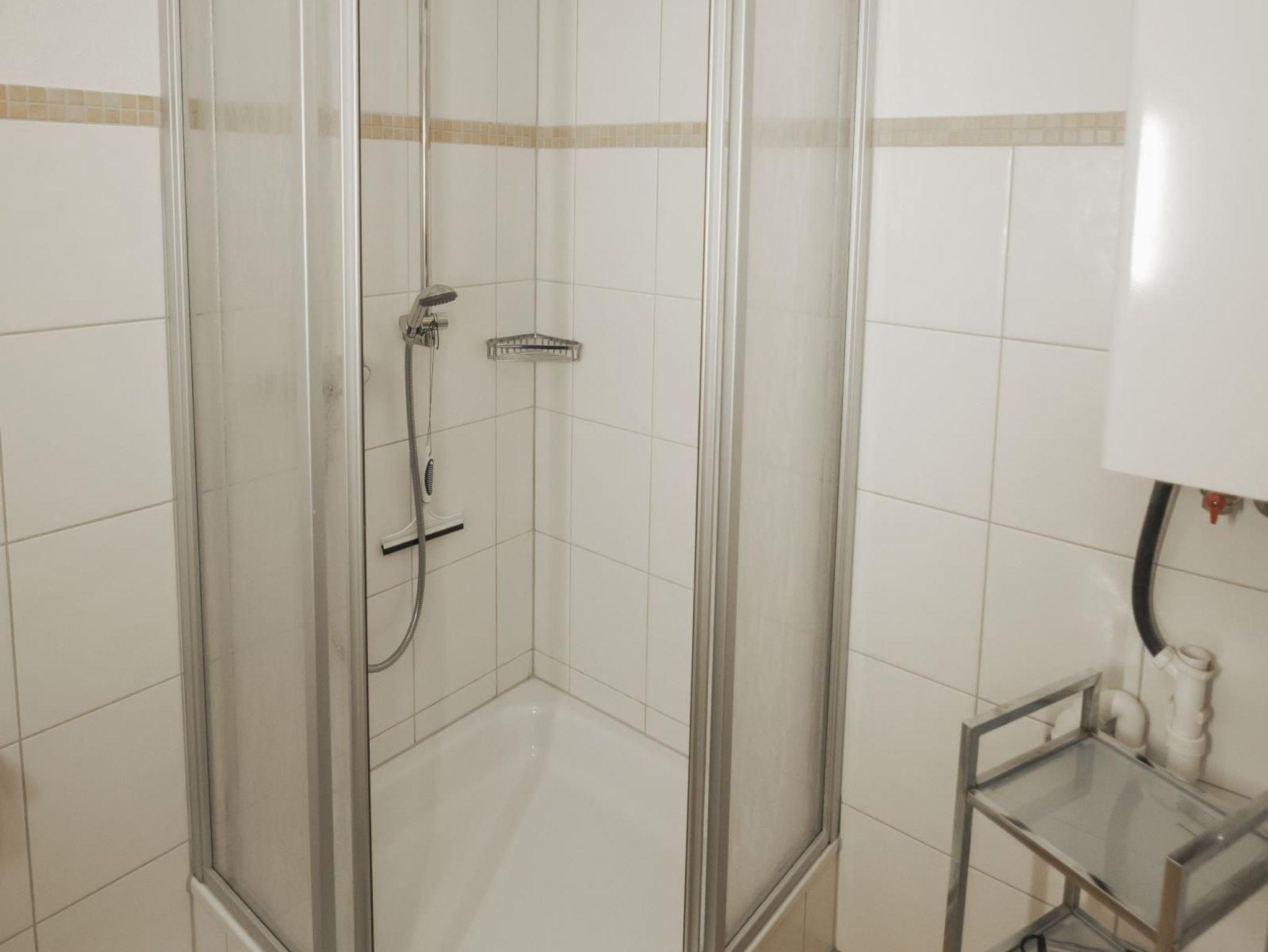 Bad mit Fenster im EG mit Dusche, Waschmaschine und Wäschetrockner.
