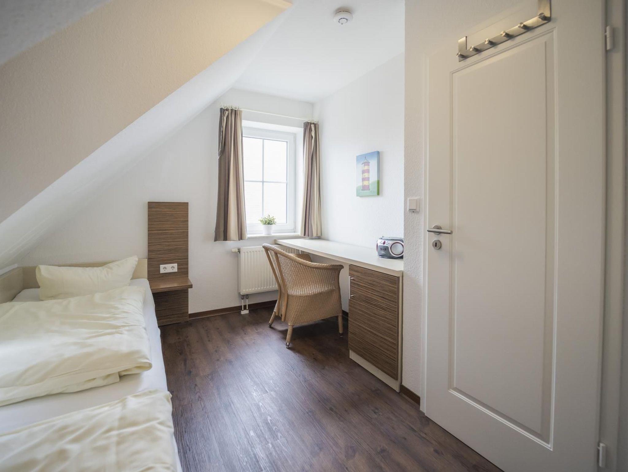 Weiterer Schlafraum mit zwei Einzelbetten, großem Kleiderschrank sowie Schreibtisch, Sitzgelegenheit und CD-Kassettenradio.