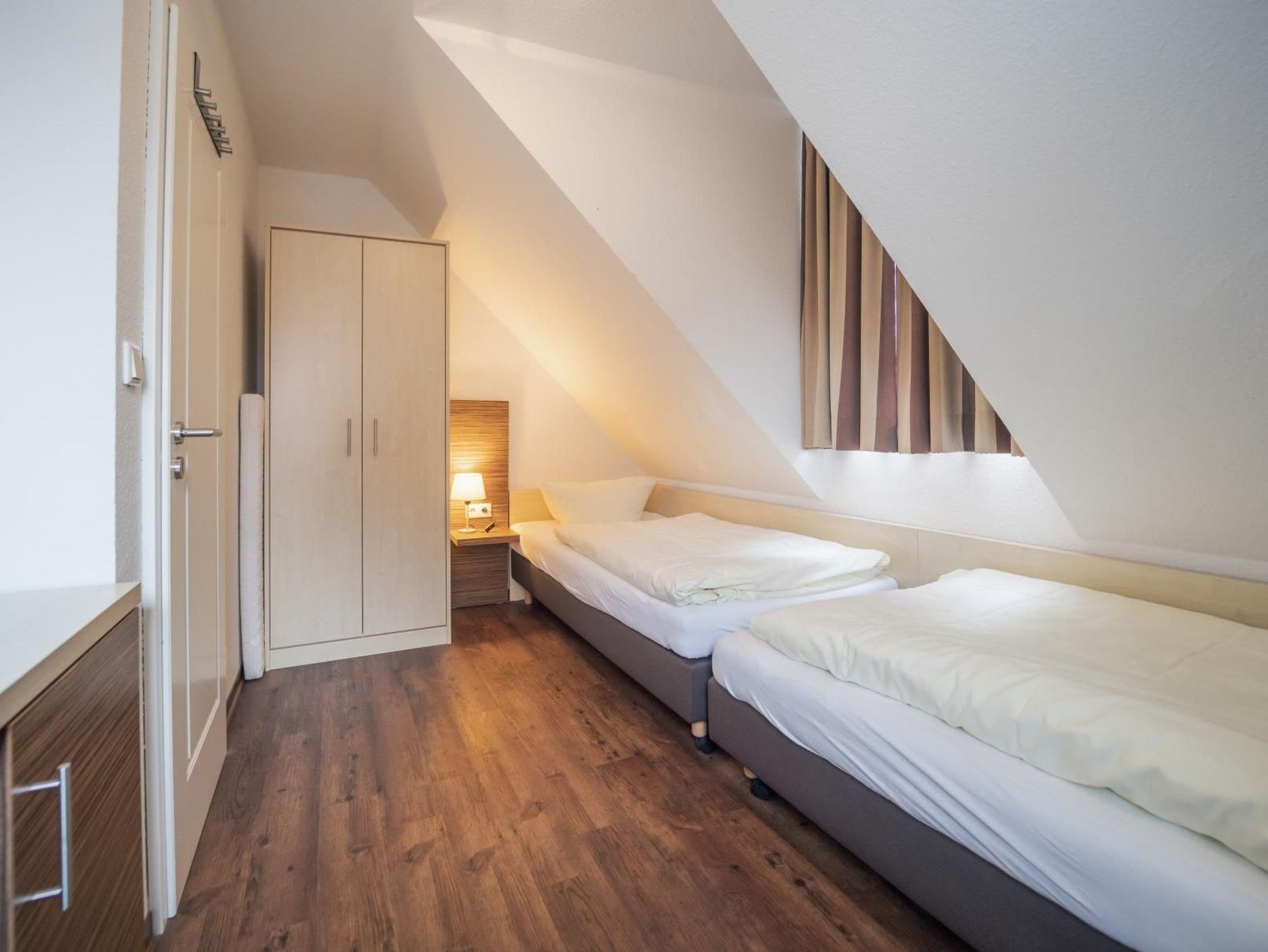 Schlafraum mit zwei Einzelbetten (auch als Doppelbett möglich), Kommode und Flachbildfernseher mit allen erforderlichen Anschlüssen für Spielekonsolen.