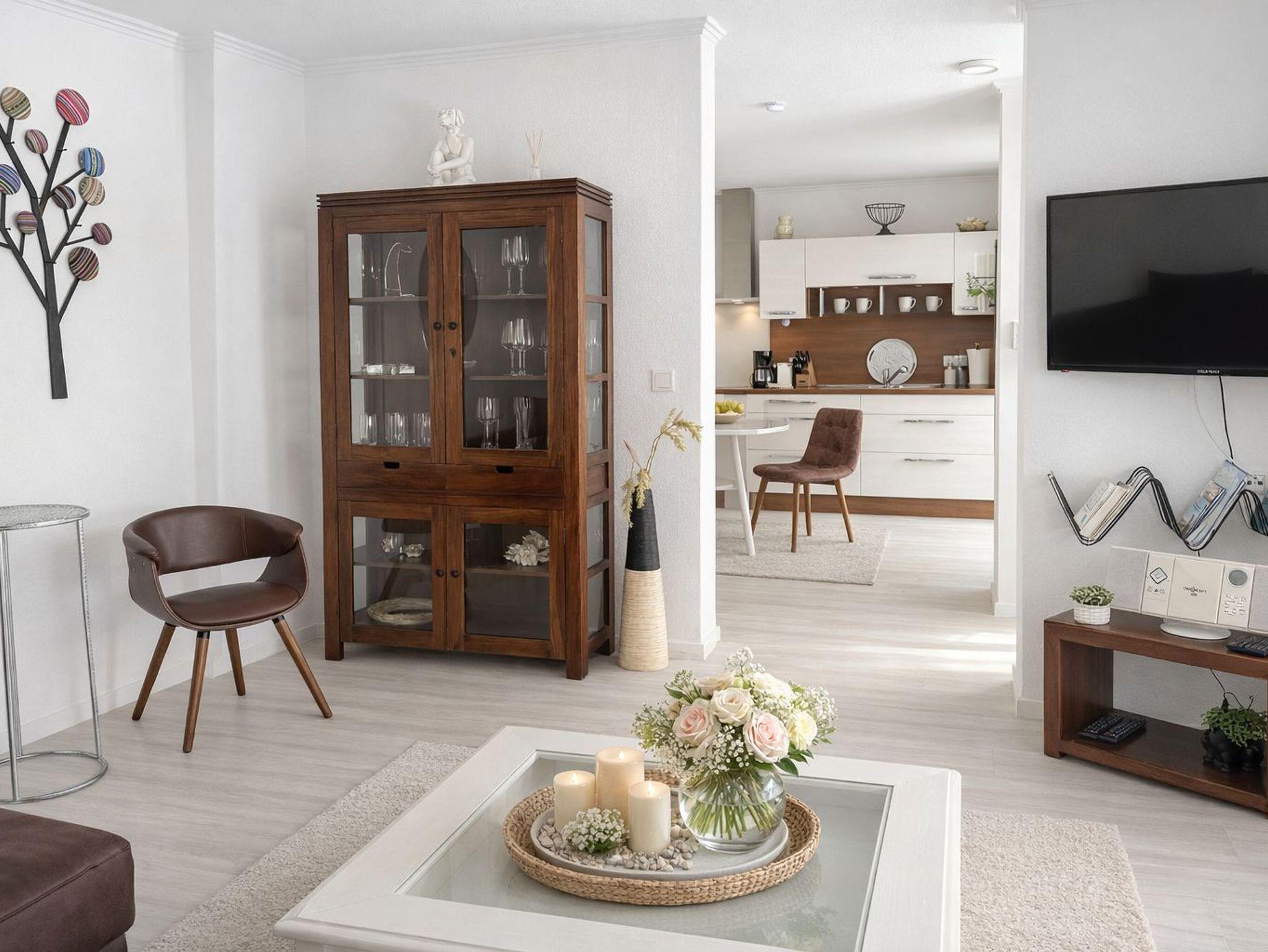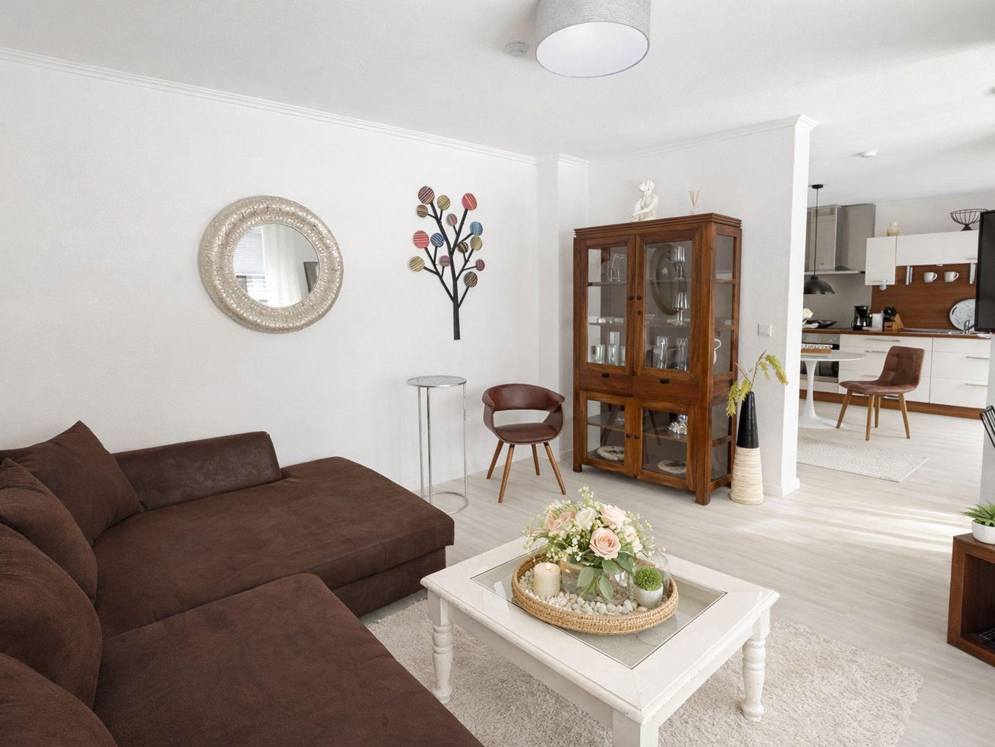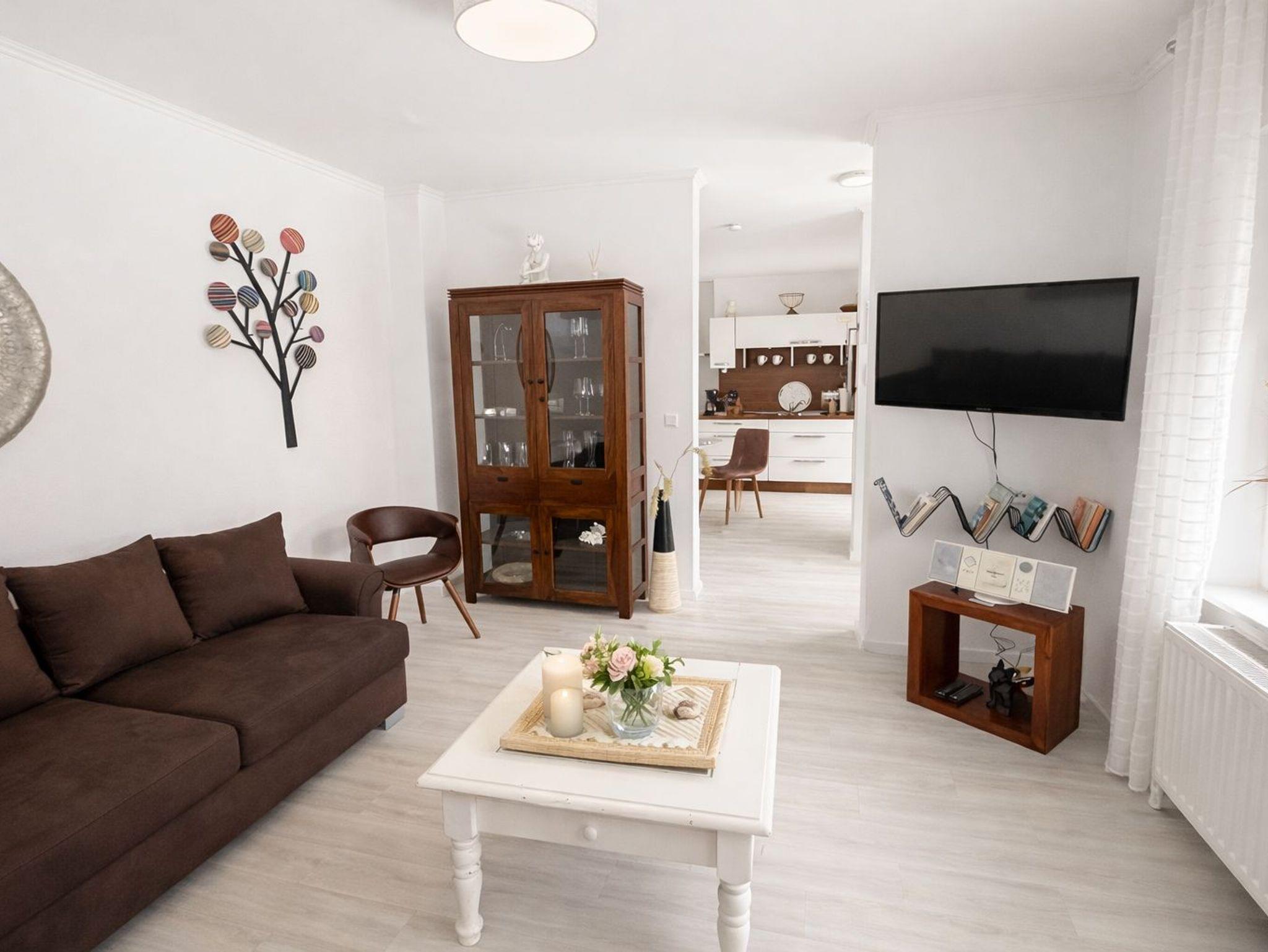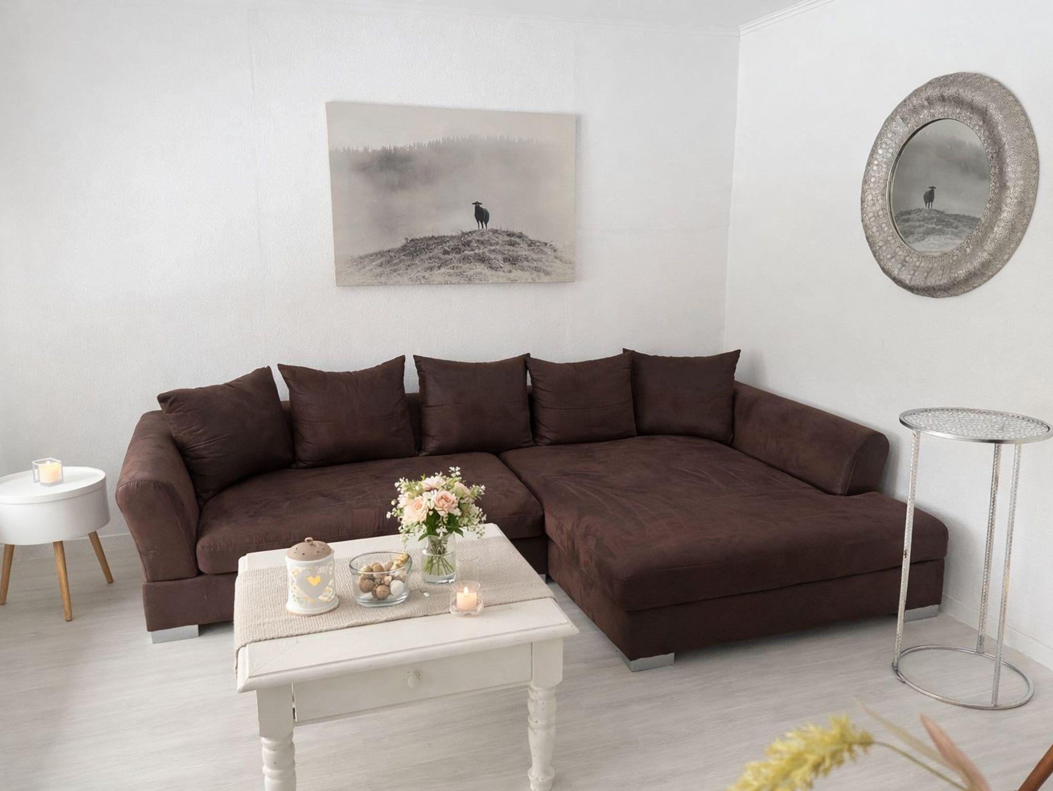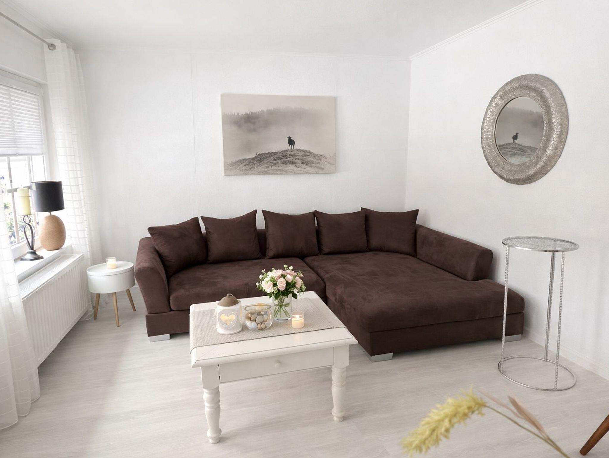 Das gemütliche und helle Wohnzimmer hat einen Smart-TV. Im Wohnzimmer relaxen Sie auf der gemütlichen Eckcouch.