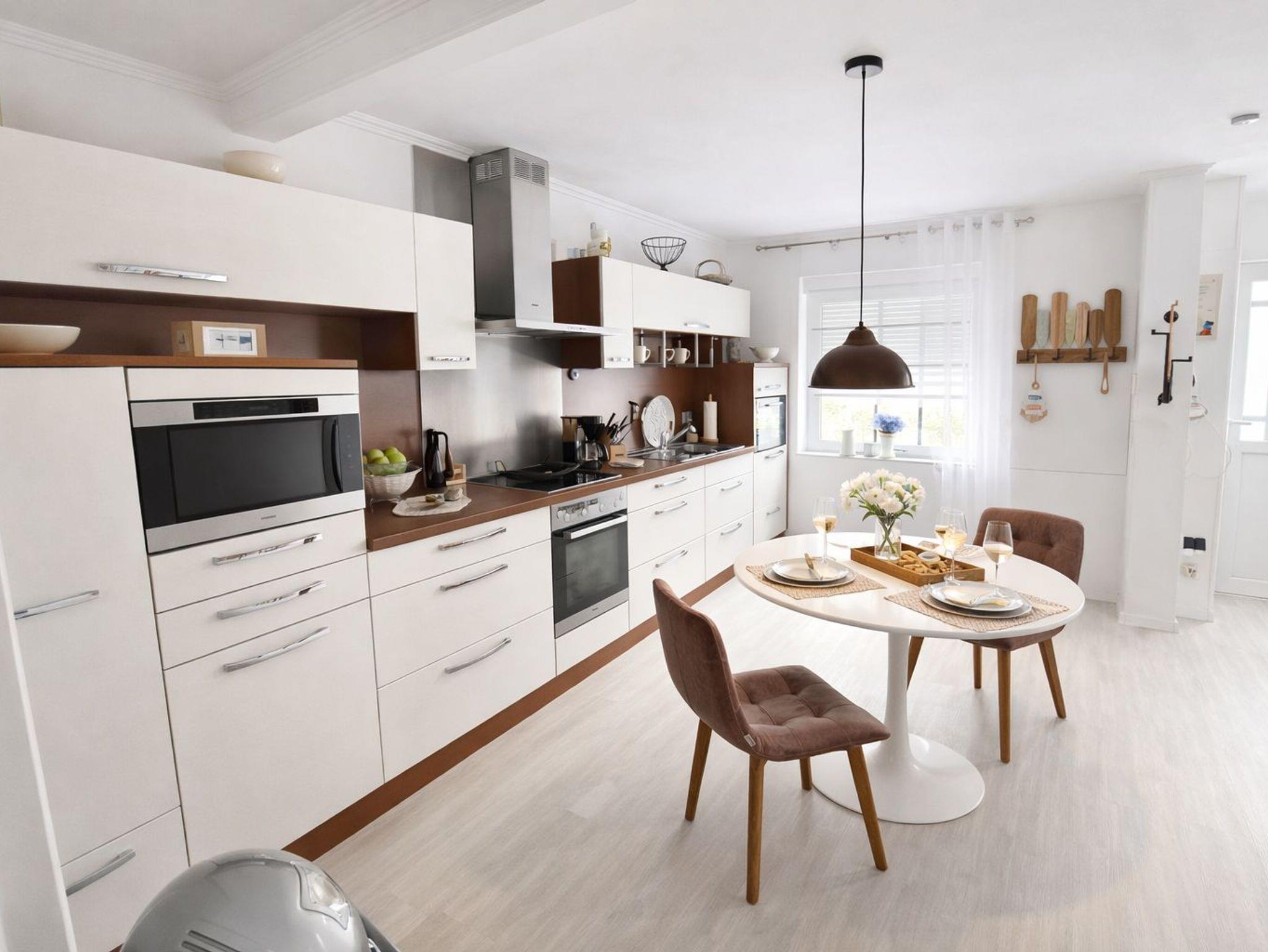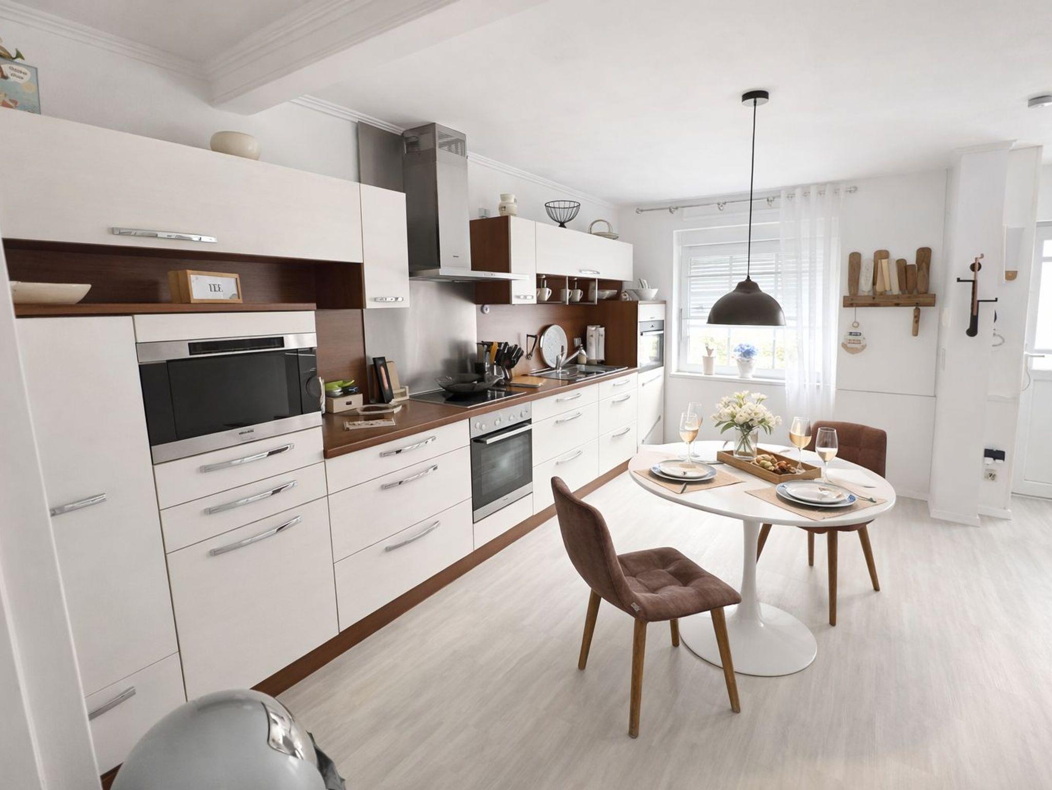 Die Wohnung mit Wohnzimmer, Schlafzimmer, Küche und Duschbad hat eine hochwertige Küche mit Miele-Geräten, Spülmaschine, Dampfgarer, Kühlschrank und Backofen. Hier macht das Frühstücken richtig Spaß.
