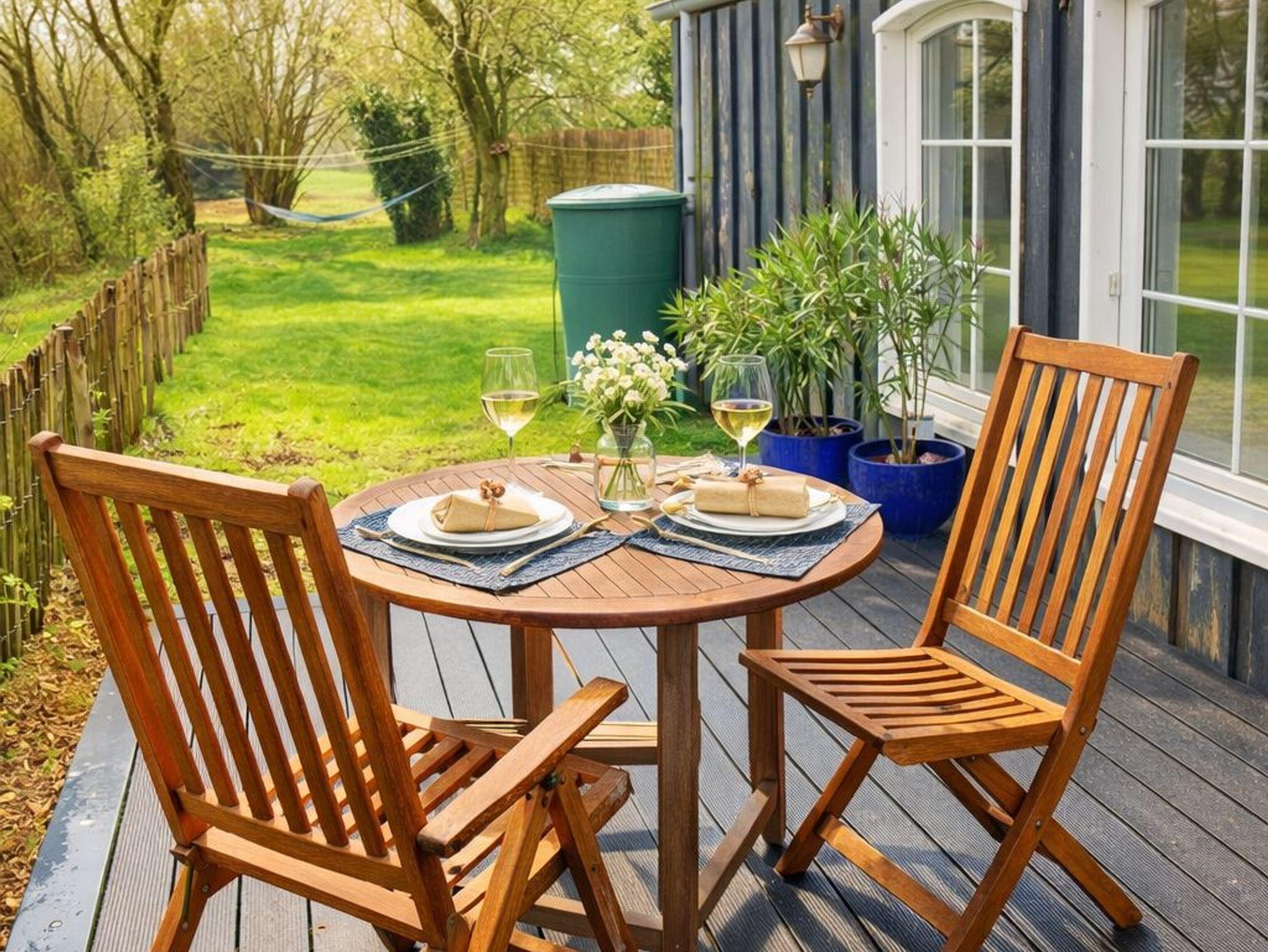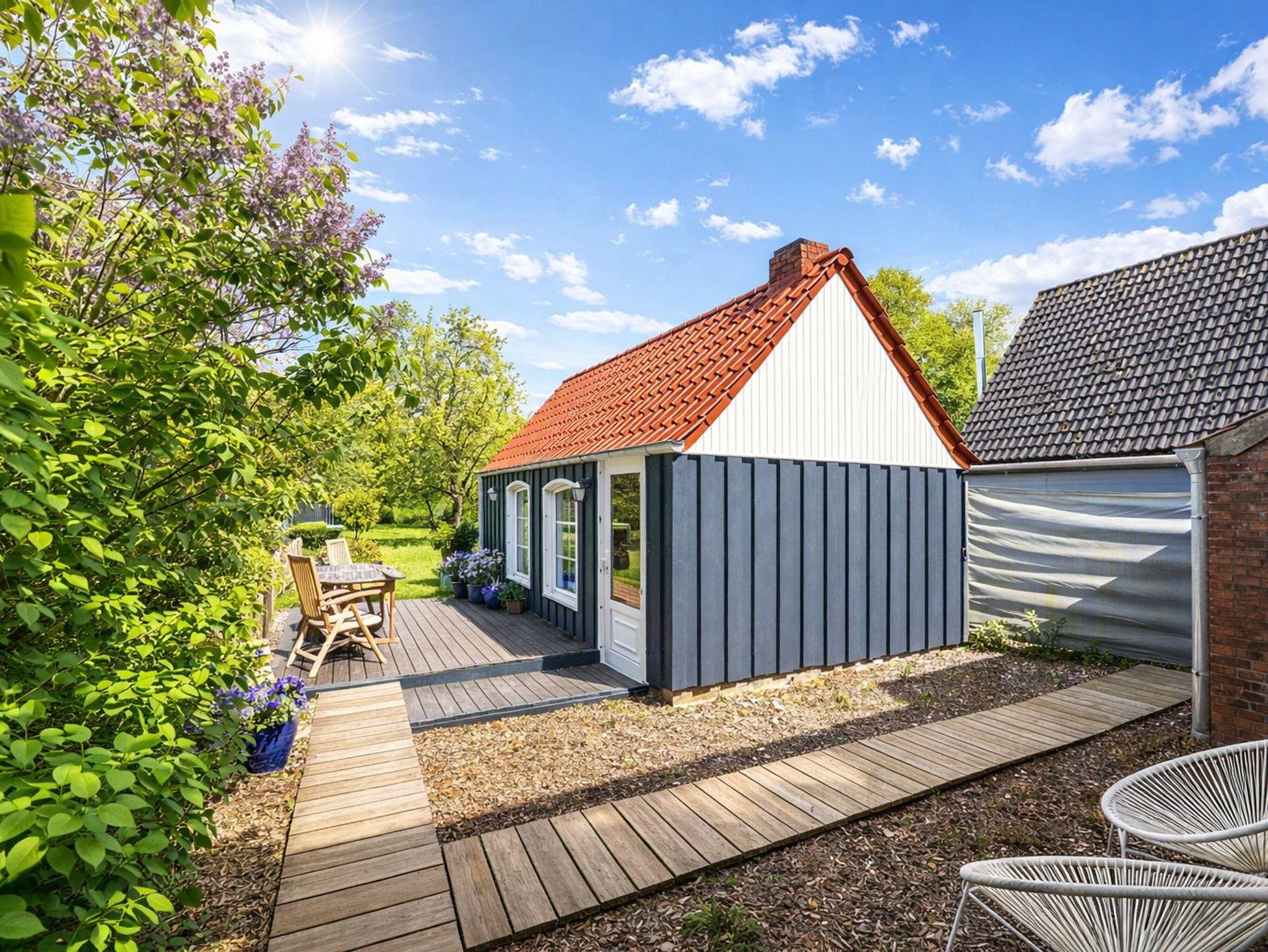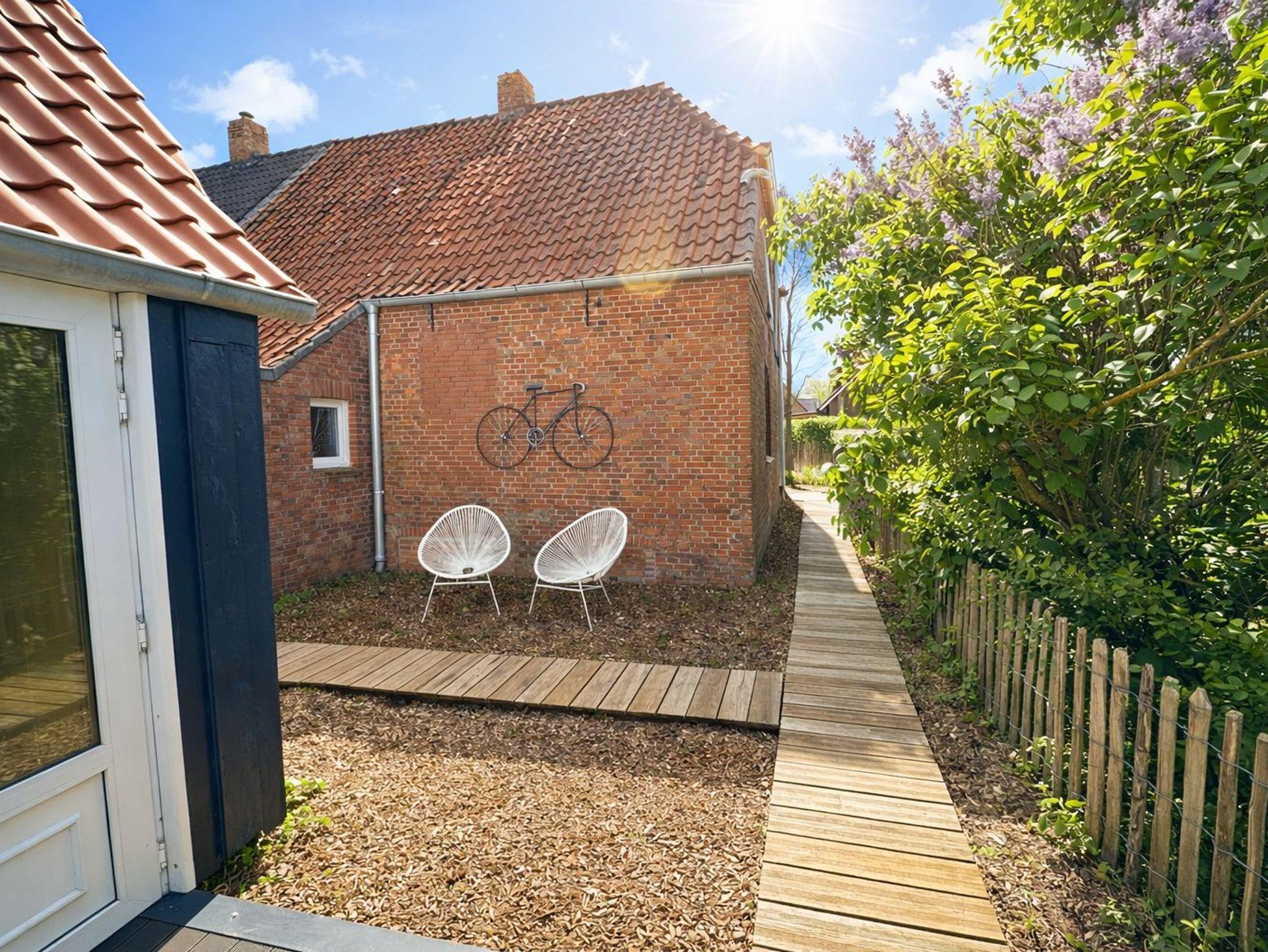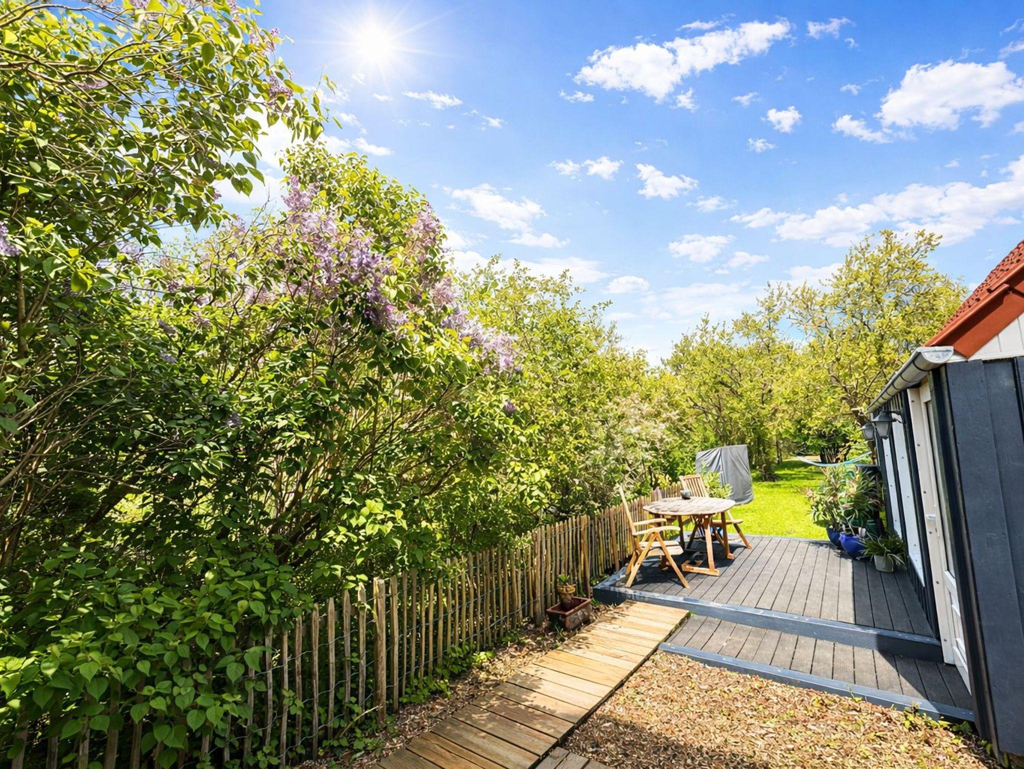 Der Garten hat einen Strandkorb, einen Grill und eine Gartentischgruppe, eine Terrasse und ein Gartenhaus mit Kamin.