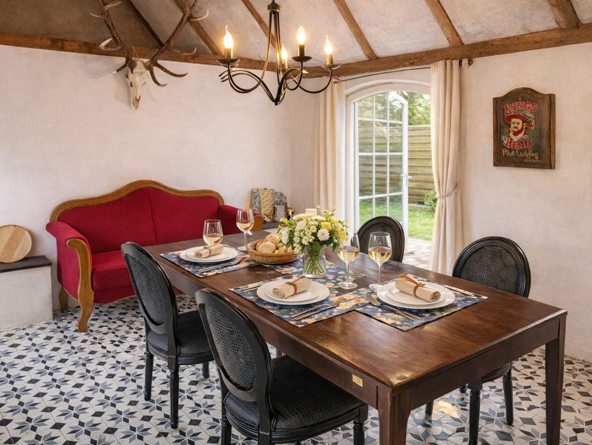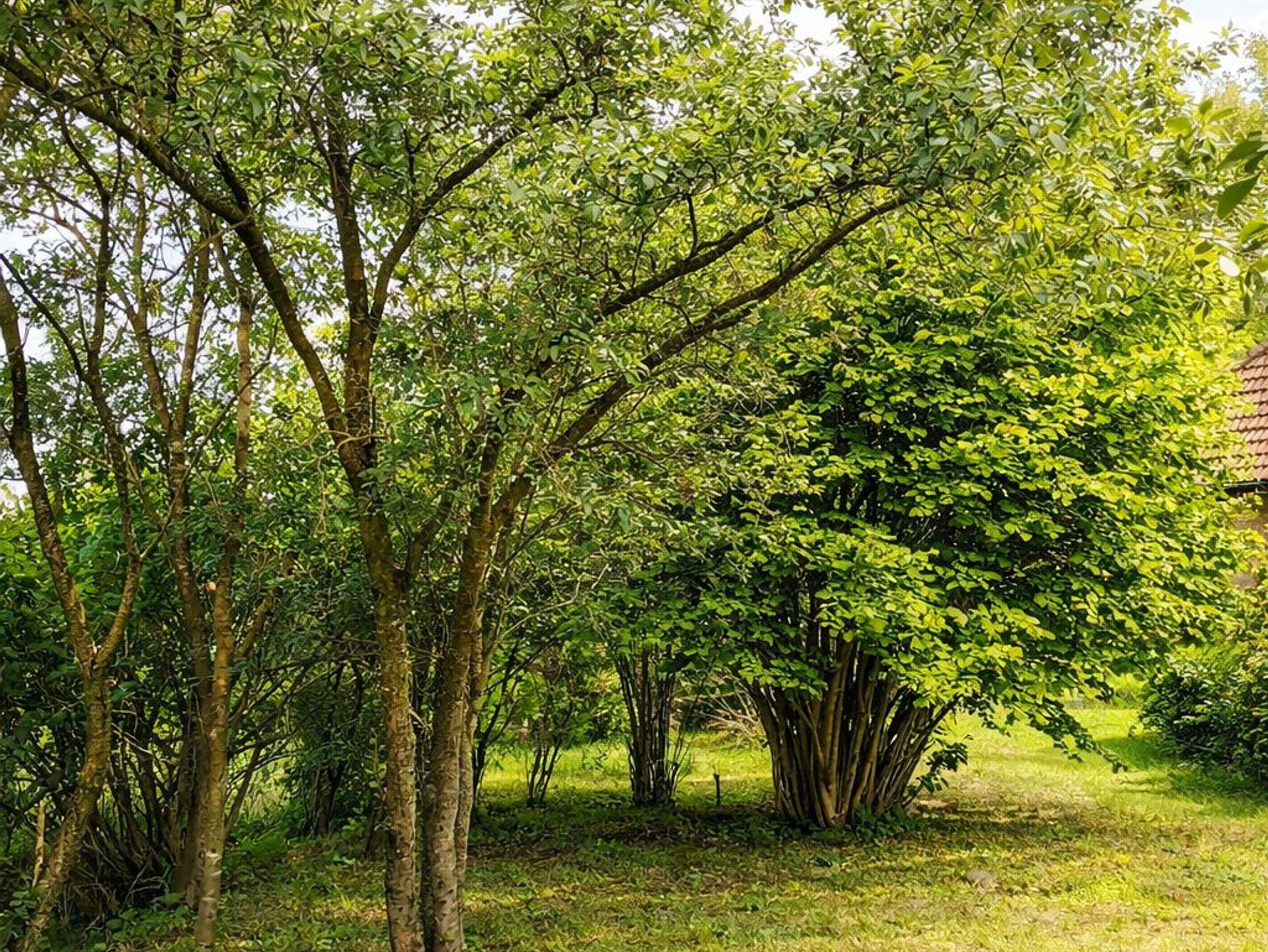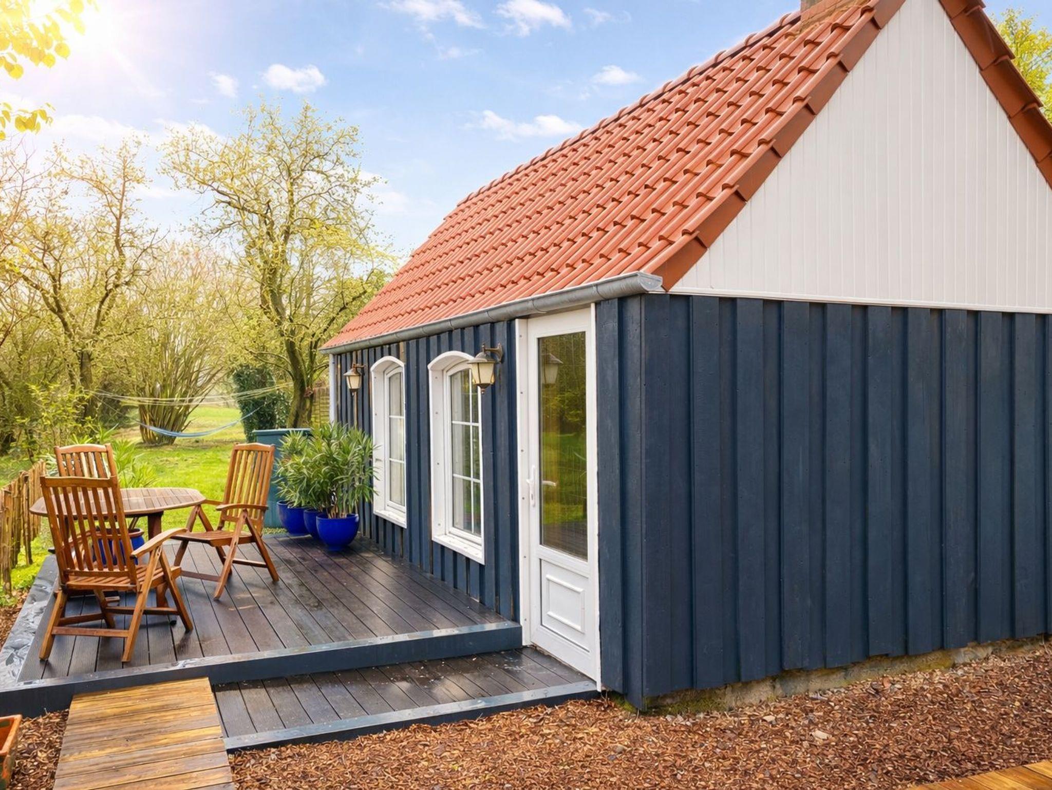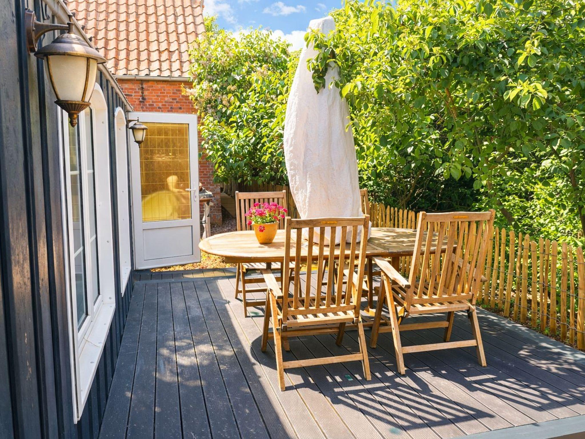 Der Garten hat einen Strandkorb, einen Grill und eine Gartentischgruppe, eine Terrasse und ein Gartenhaus mit Kamin.