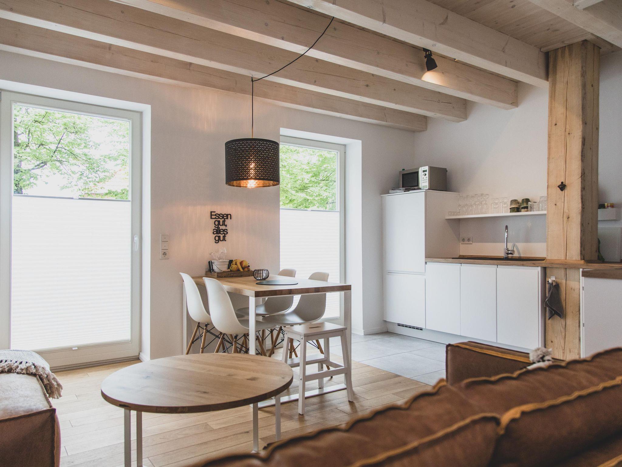 Ein denkmalgeschützter Träger des Ständerfachwerks, der auf beiden Wohnebenen sichtbar ist, verleiht der Wohnung besonderen Flair.