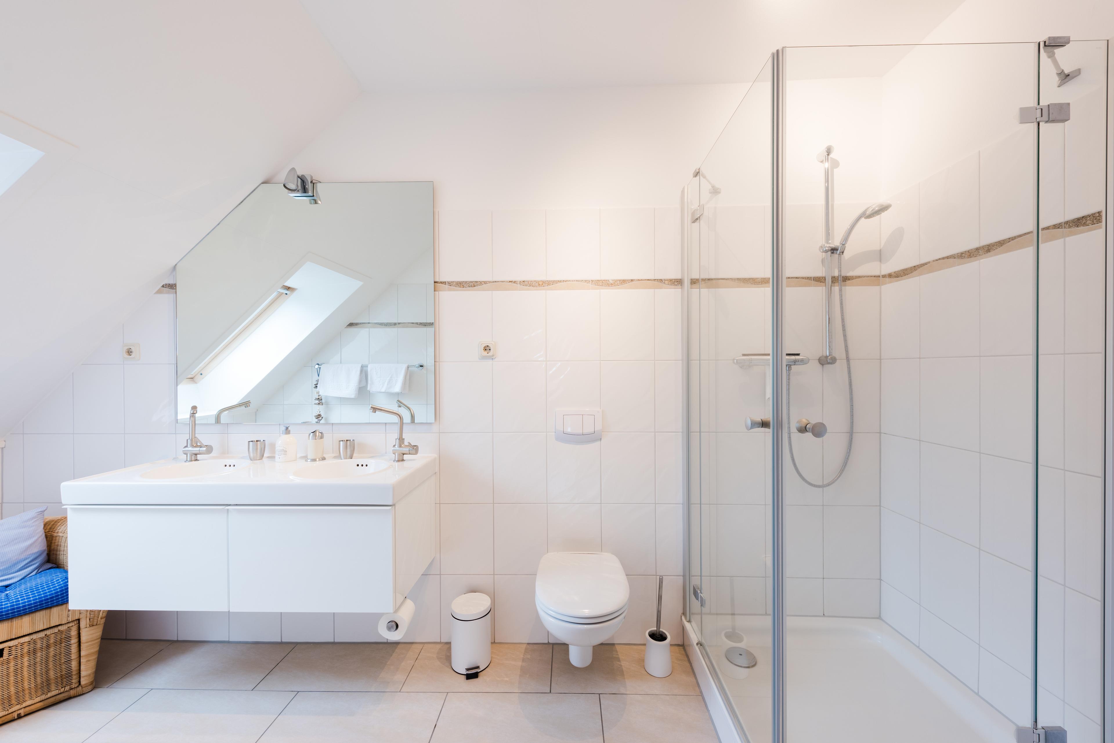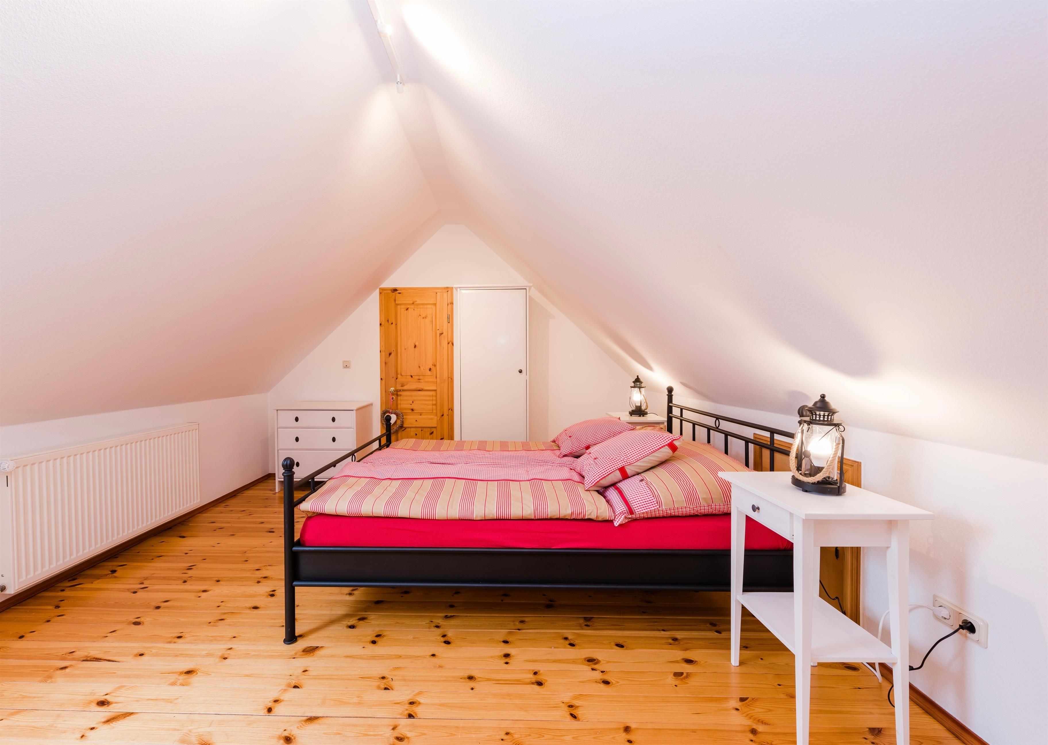 Die untere Etage (ca. 120 qm). umfasst großzügige Diele, Bad, Schlafzimmer und großen Wohnbereich. Die zweite Ebene der Wohnung im Dachgeschoss bietet einen zusätzlichem Wohnraum (mit Schlafcouch), ein zweites Schlafzimmer und ein weiteres Duschbad.