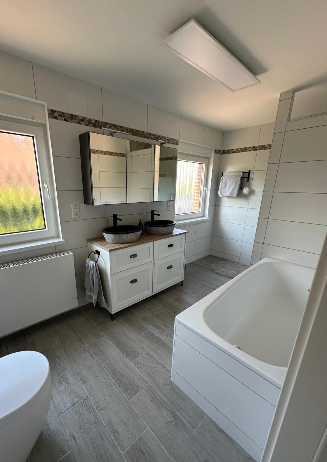 Badezimmer: WC, Badewanne, Dusche, Doppelwaschbecken, beleuchteter Spiegelschrank, 2 Fenster