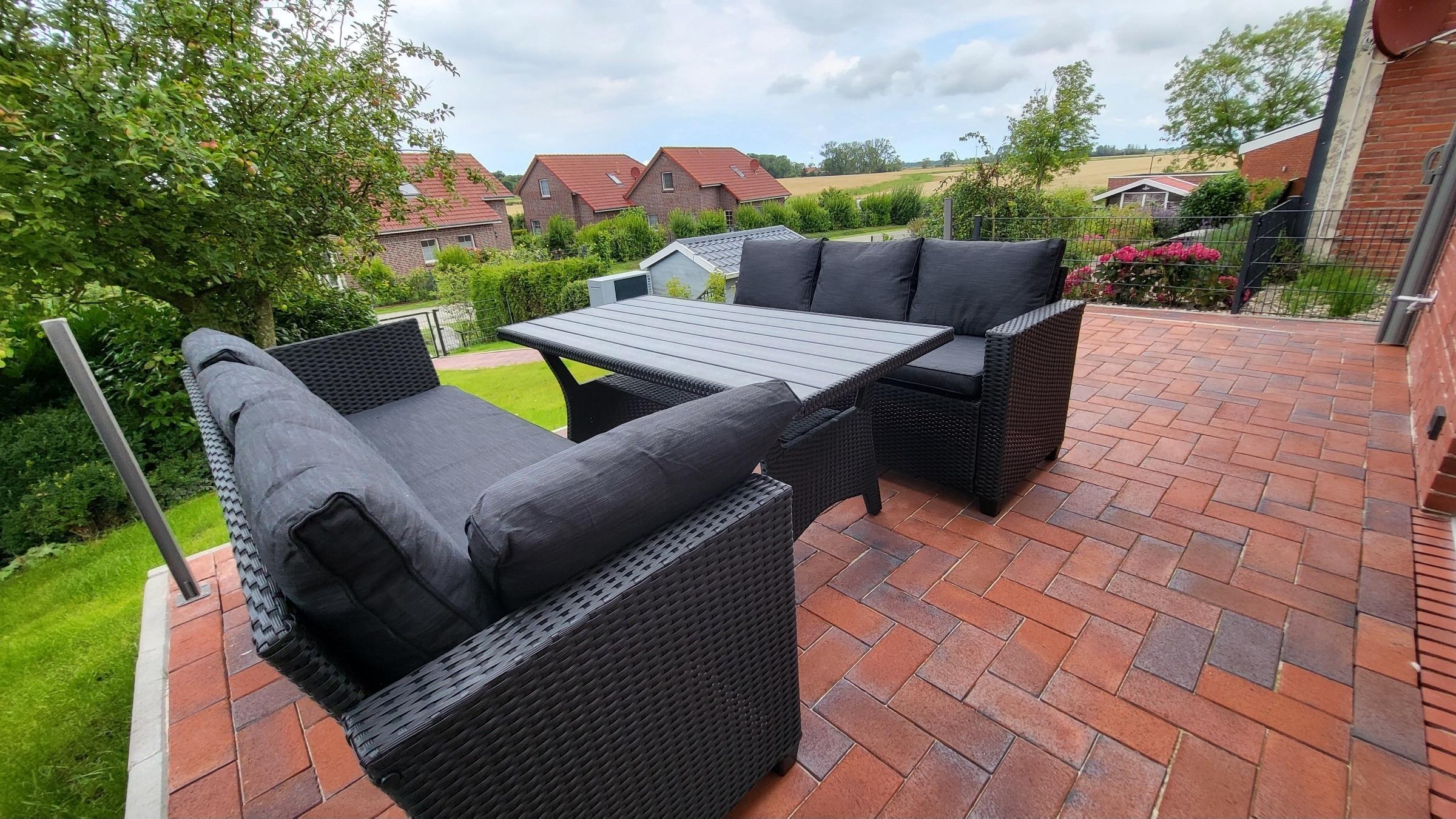 Die Terrasse befindet sich in einem eingezäunten Garten mit einer Lounge Sitzgruppe und angrenzendem Parkplatz.