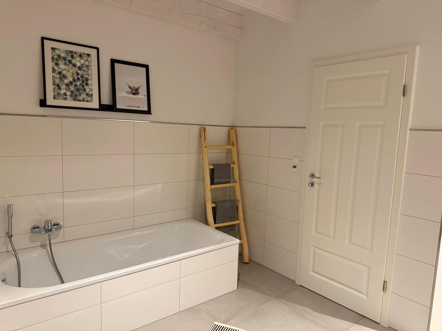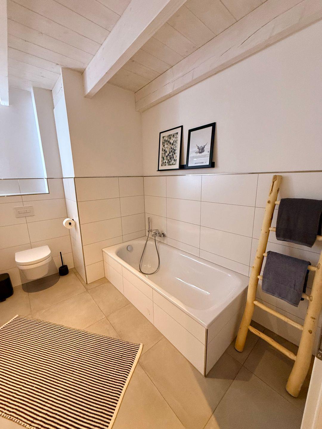 Des Weiteren findet sich in dieser Etage – mit Fenster zum Scheunenatrium – ein großes Badezimmer mit großzügiger, ebenerdig begehbarer Dusche und eine separate Badewanne.
