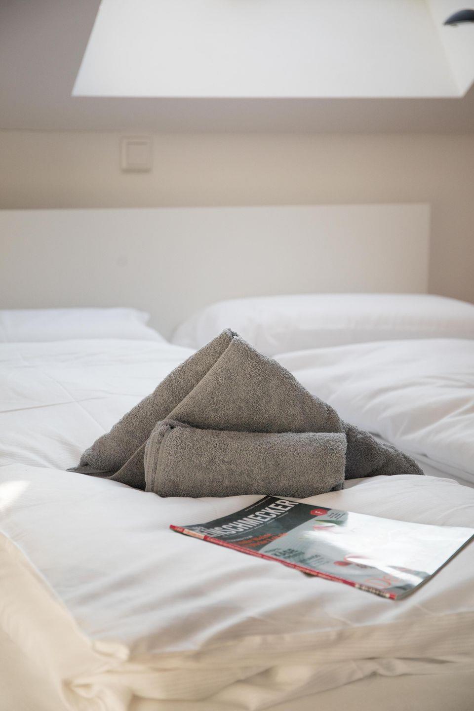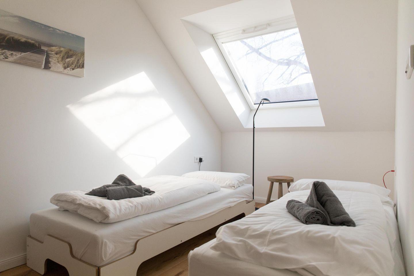 Im Dachgeschoss befinden sich 2 Schlafzimmer mit 1 Doppelbett und 2 Einzelbetten, 1 Kleiderständer und 1 Kleiderschrank im Flur. In beiden Schlafzimmern können die Fenster verdunkelt werden, Insektenschutzrollos bewahrt Sie vor lästigen Besuchern. Ein Kinderschutzgitter zur Treppe schützt Ihre Kleinen. Das Bad verfügt über eine bodengleiche Dusche, Haartrockner und Kosmetikspiegel.