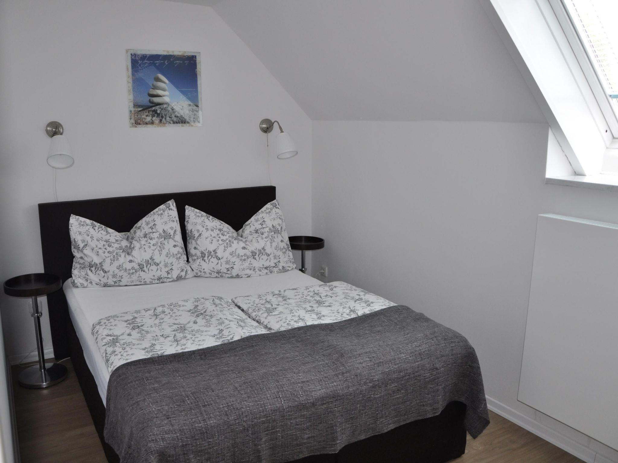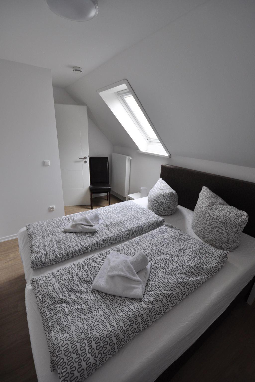 The maisonette has a living space of around 75 m² and is ideal for accommodating four adults. On the ground floor you will find a large, combined living and kitchen area with a cosy sofa corner, a modern dining area for four people and a fully equipped kitchen. There are two bedrooms on the upper floor under the sloping roof. Daylight enters through the built-in skylights. The first room has a 140 cm wide box-spring bed with a full-length mattress. The other bedroom also has a box-spring bed, but it is 160 cm wide and has a split mattress, each 80 cm wide. The flat also has a good-sized bathroom with shower, WC and natural light. All rooms can be heated.