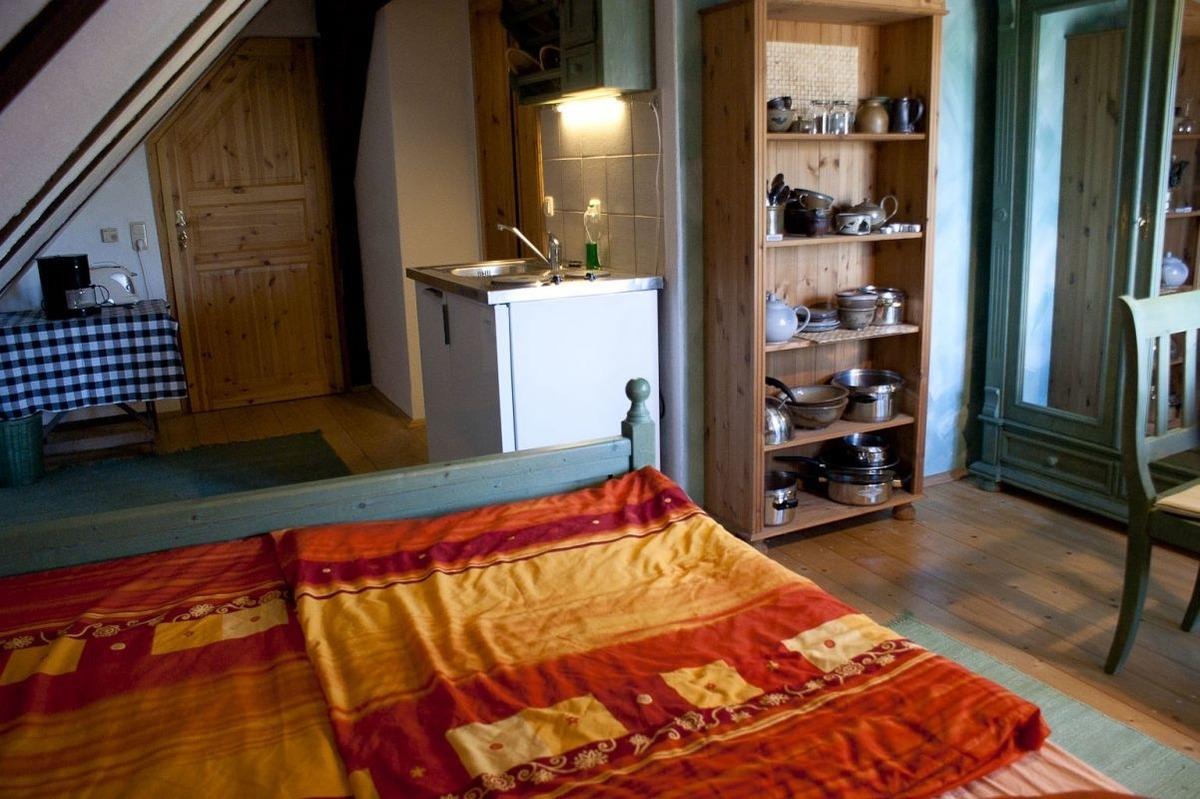 Unsere Zimmer liegen im Dachgeschoss über der Töpferei. Alle Zimmer sind mit Dusche/WC und Miniküche ausgestattet. Sie können sich also selbst verpflegen. Wenn Sie die Zimmer mit Frühstück buchen möchten, ist das aber auch möglich. Bettwäsche ist inklusive, Sie erhalten auch einen Satz Handtücher pro Woche. Es ist kein Fernseher und kein Radio da, auch kein Telefon auf dem Zimmer. Dafür aber viel Natur und ein eigener Seezugang. Genießen Sie unseren weiträumigen Garten und die Ruhe hier.