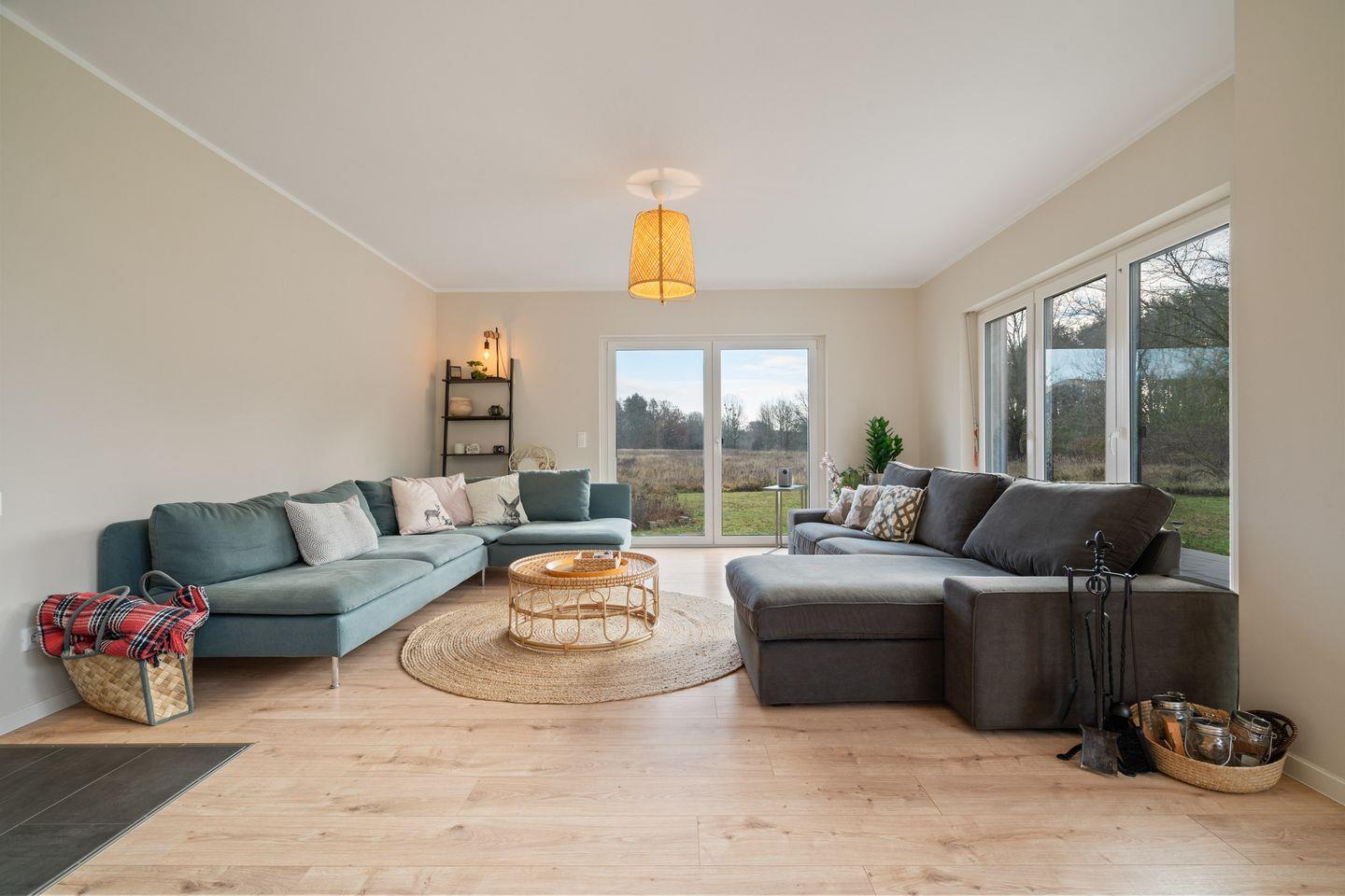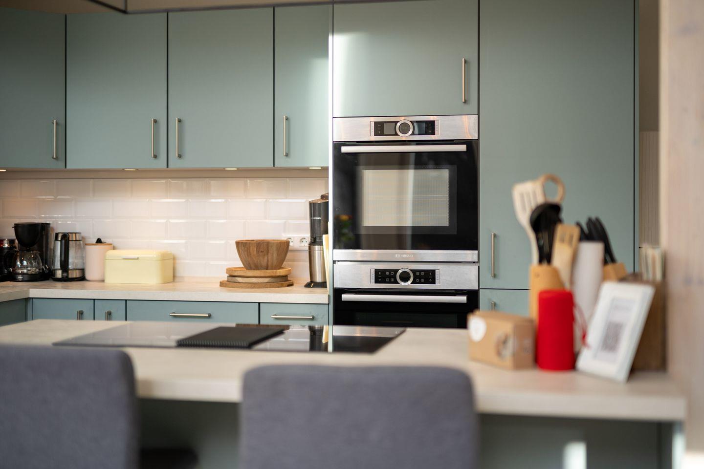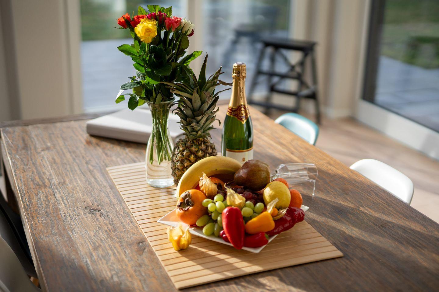 Das Herzstück des Hauses bildet der offene Wohnbereich mit einer modernen Sofaecke und gemütlichem Essbereich. Bodentiefe Fenster schaffen eine helle und freundliche Atmosphäre und eröffnen den Blick auf die umliegende Natur. Die offene, voll ausgestattete Küche, direkt angrenzend an das Wohnzimmer, ist hochwertig eingerichtet und umfasst unter anderem einen Induktionsherd, Backofen, Mikrowelle, extra Gefrierschrank, Kühlschrank, Geschirrspüler sowie umfangreiche Küchenutensilien, eine Küchenmaschine und einen Mixer. Für Kaffeeliebhaber stehen sowohl eine Kaffeemaschine als auch eine Nespresso-Espressomaschine bereit. Selbstverständlich sind Gewürze, Geschirr und Besteck sowie Reinigungsmittel vorhanden.