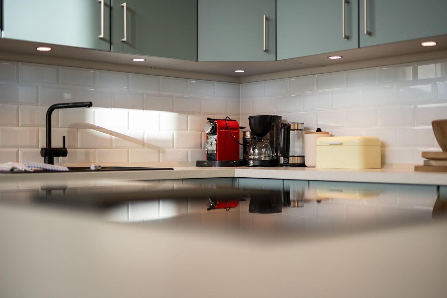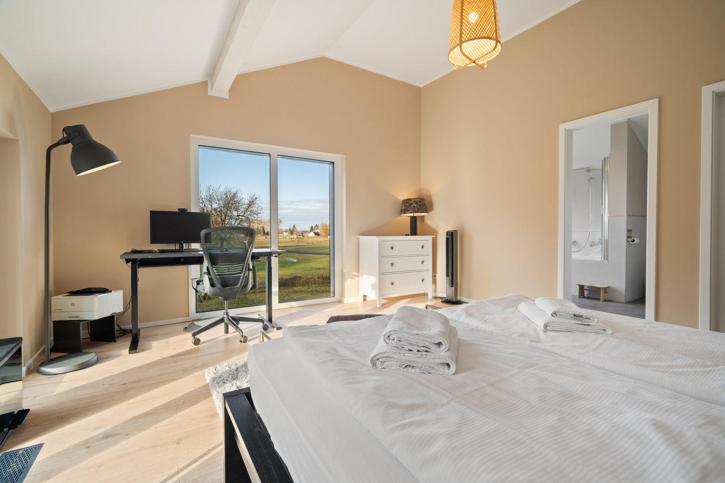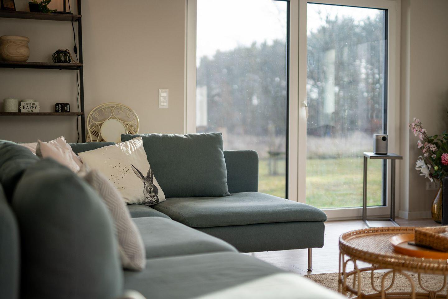 Das Herzstück des Hauses bildet der offene Wohnbereich mit einer modernen Sofaecke und gemütlichem Essbereich. Bodentiefe Fenster schaffen eine helle und freundliche Atmosphäre und eröffnen den Blick auf die umliegende Natur. Die offene, voll ausgestattete Küche, direkt angrenzend an das Wohnzimmer, ist hochwertig eingerichtet und umfasst unter anderem einen Induktionsherd, Backofen, Mikrowelle, extra Gefrierschrank, Kühlschrank, Geschirrspüler sowie umfangreiche Küchenutensilien, eine Küchenmaschine und einen Mixer. Für Kaffeeliebhaber stehen sowohl eine Kaffeemaschine als auch eine Nespresso-Espressomaschine bereit. Selbstverständlich sind Gewürze, Geschirr und Besteck sowie Reinigungsmittel vorhanden.
