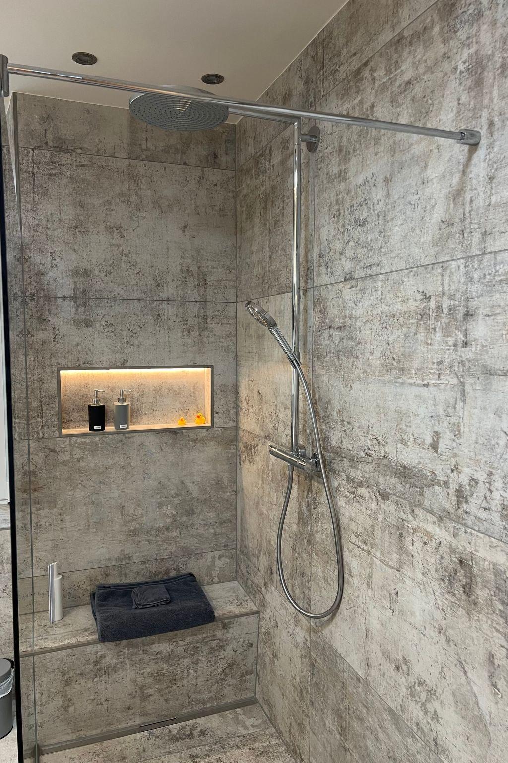 - Fans for warm days and underfloor heating in the bathroom for cooler nights