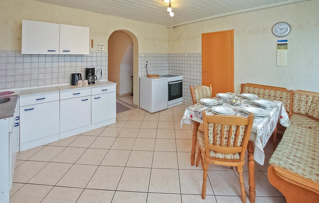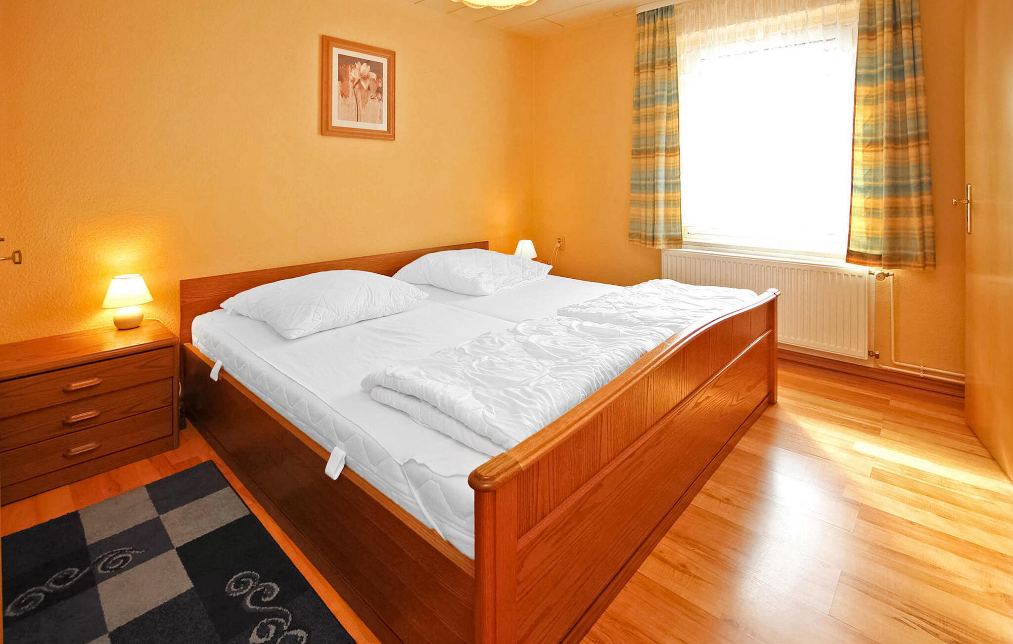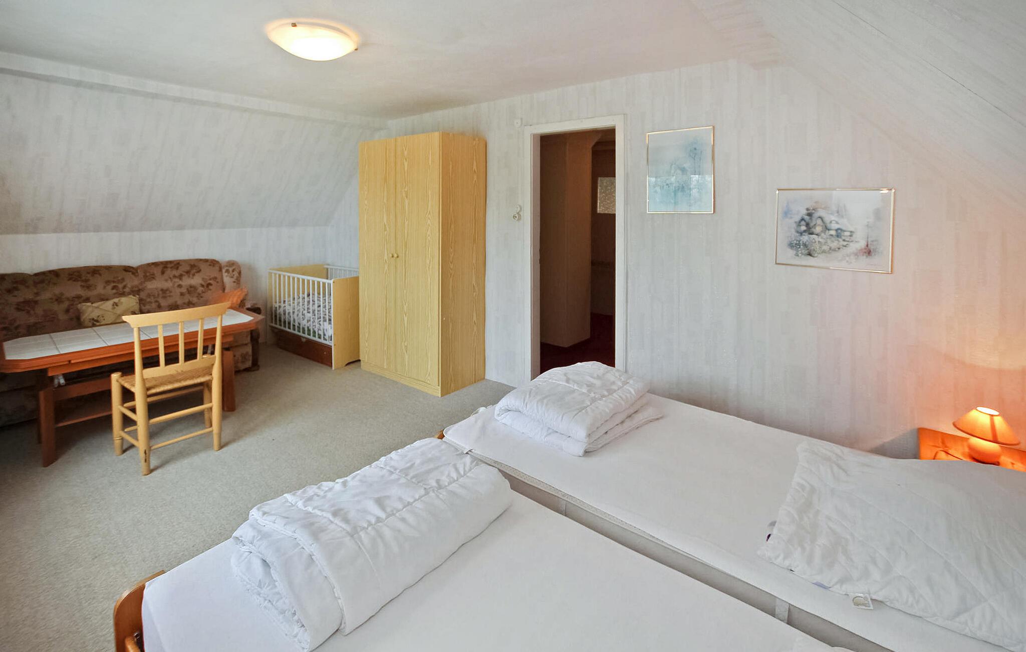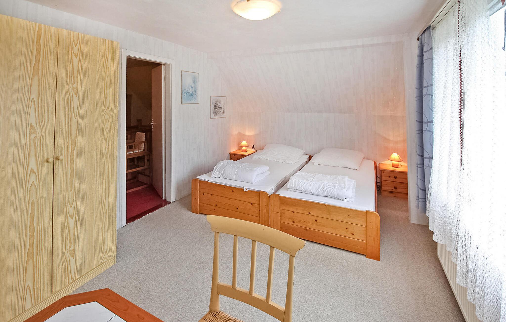 Denne frittliggende ferieboligen for opptil 6 voksne og 1 baby ligger rolig til i utkanten av landsbyen, i landlige omgivelser og med utsikt til Bodden, på en egen fritidstomt på ca. 2 000 m². Bade- og fiskemuligheter finner du på Bodden ca. 1 km unna, og shoppingmuligheter og restauranter i Gingst, ca. 4 km unna. Det ca. 100 m² store, sentraloppvarmede, røykfrie feriehuset har stue i første etasje (polstret suite, flatskjerm-TV, DVD-spiller, radio/CD-spiller), et romslig kjøkken (spiseplass, elektrisk komfyr med stekeovn, kjøleskap med fryser, mikrobølgeovn, diverse små kjøkkenapparater), to soverom (hvert med dobbeltseng, 1 x barneseng), en gang, en stor, møblert gang og et bad (dusj, WC). I øverste etasje er det et tredje soverom (2 enkeltsenger, 1 barneseng), som KUN er TILGJENGELIG FOR 5 PERSONER. Det er også en møblert terrasse (røyking tillatt), rikelig med parkering, grill og 2 barnestoler. Sluttrengjøring, vann- og energiforbruk er inkludert i totalprisen. Ta med eget sengetøy og håndklær.