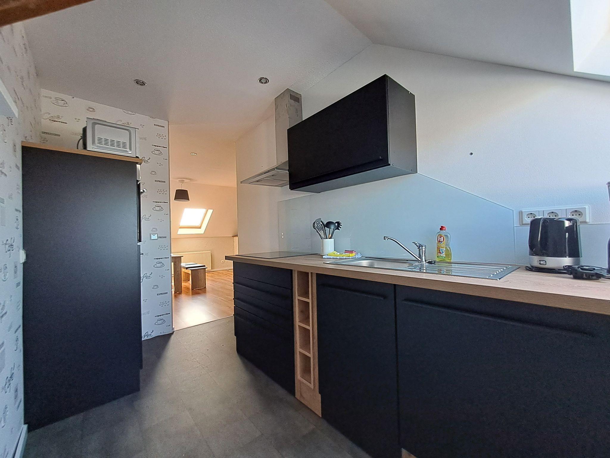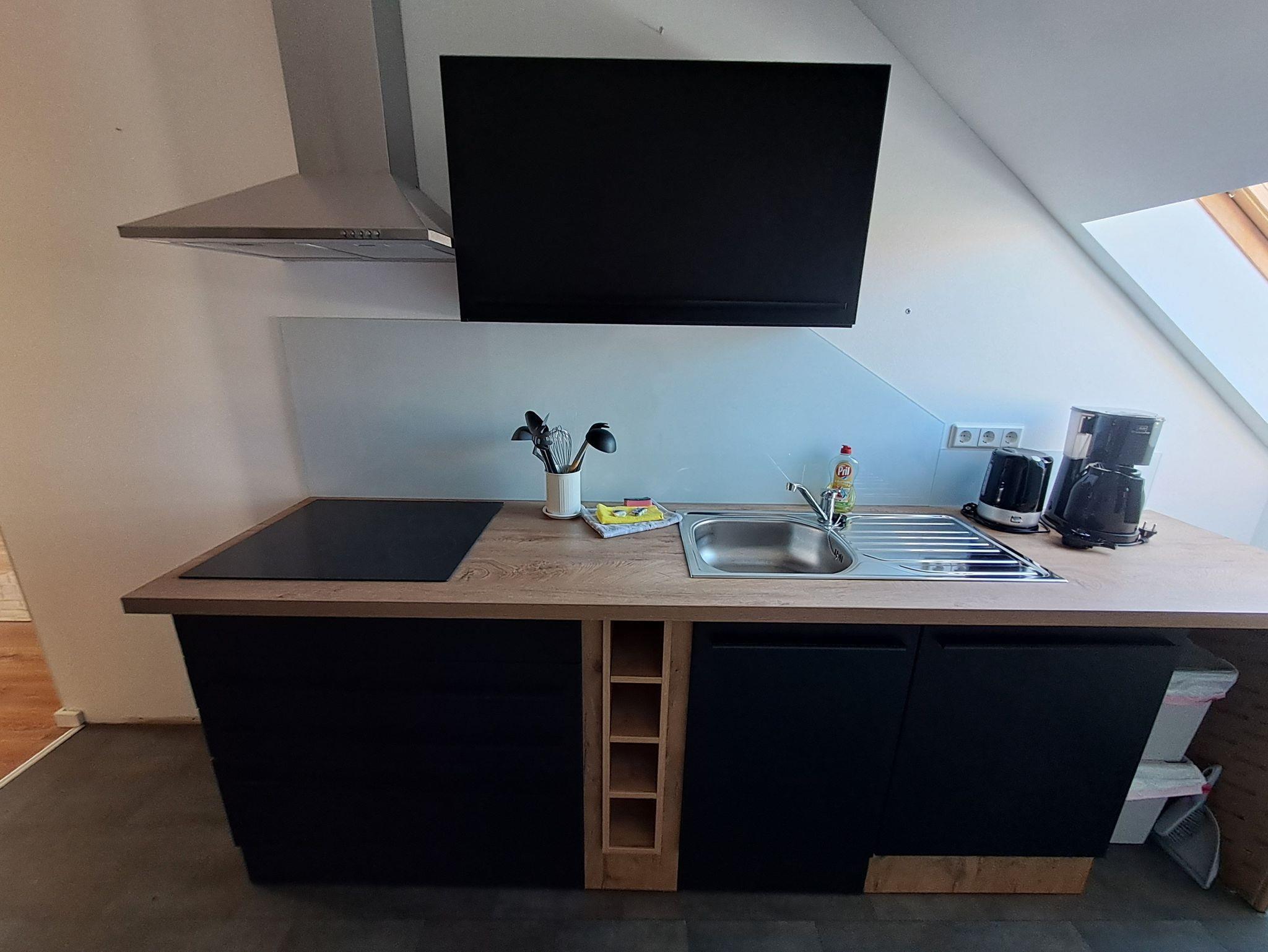 Nichtraucherwohnung mit Teppichboden im Schlafzimmer, Laminatboden im Wohn/Essbereich, Fliesen im Bad. Venylboden in der Küche, Küche ist voll ausgestattet (Backofen, Ceranfeld, Geschirrspüler, Mikrowelle, Toaster, Kaffeemaschine, Wasserkocher)
