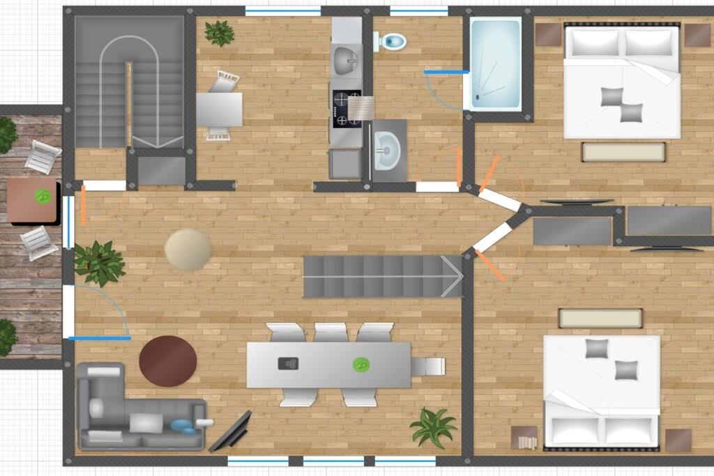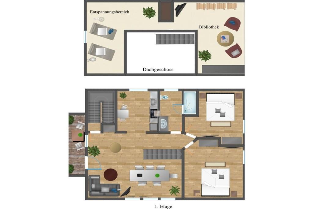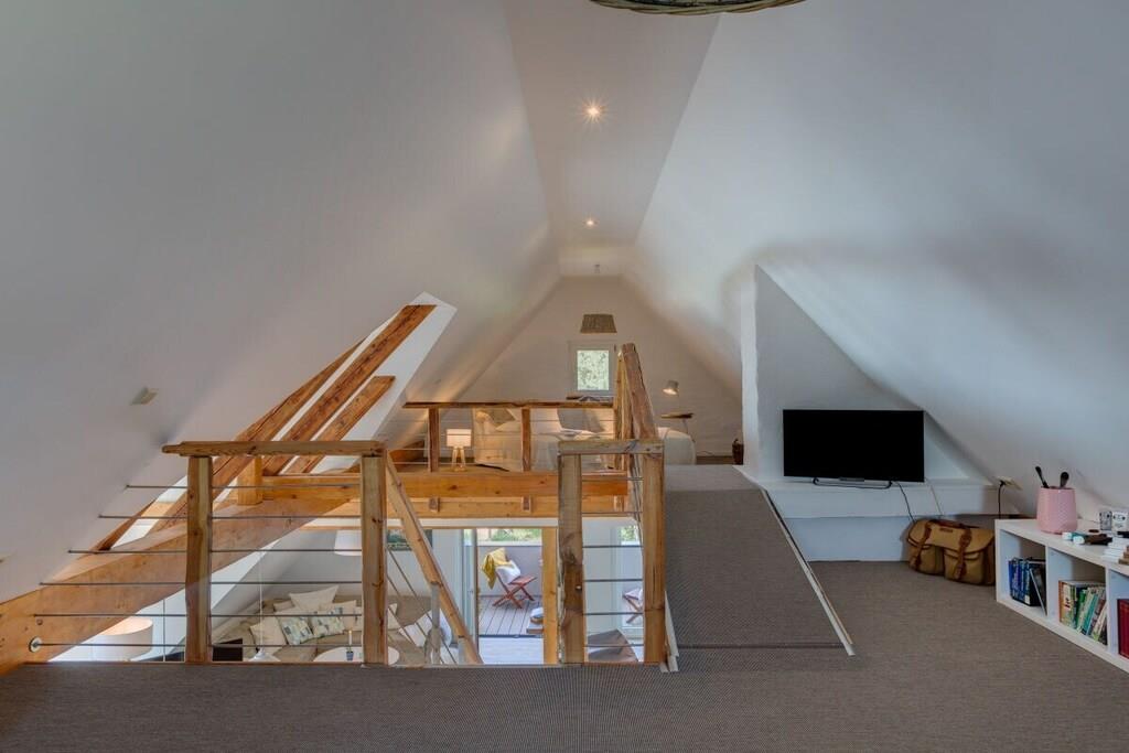 Loftet: (bibliotek(bibliotek)) , , Stue(1 persons sovesofa, TV), spisestue(TV, spisebord), Kjøkken(komfyr med kokeplater, komfyr, stekovn, oppvaskmaskin, kjøleskap), soveværelse(, , dobbeltseng, dobbeltseng, TV), soveværelse(, , dobbeltseng, dobbeltseng, TV), bad(, WC, dusj, håndvask), Internett-tilgang, Internett-tilgang, balkon(hagemøbler), oppvarming, parkering