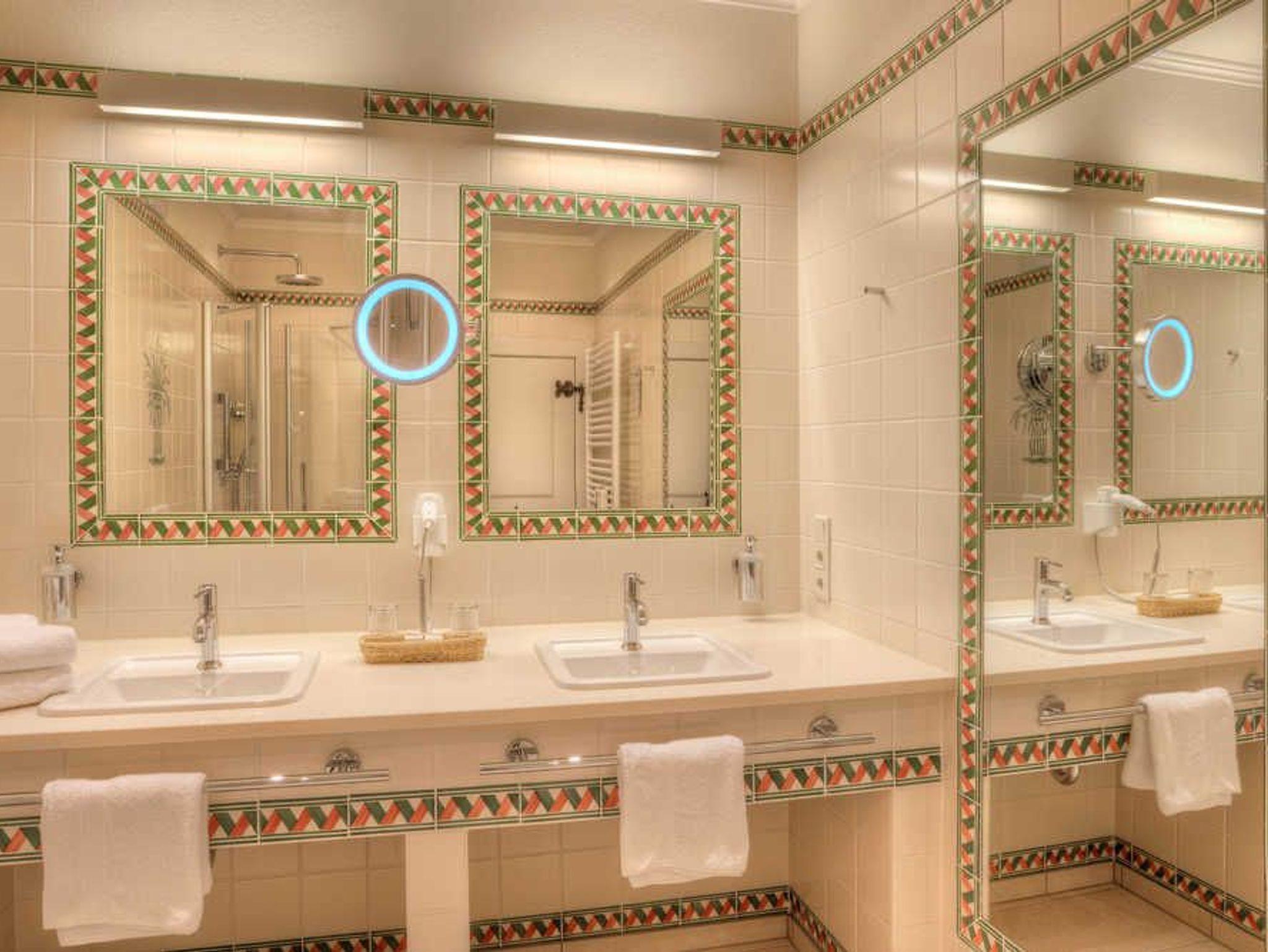 Wohnzimmer mit Sitzecke, Schreibtisch und Sofabett als Aufbettungsmöglichkeit sowie Flatscreen und Minibar. Separates Schlafzimmer. Bad mit Dusche, Handtuchwärmer, reichlich Ablagefläche.