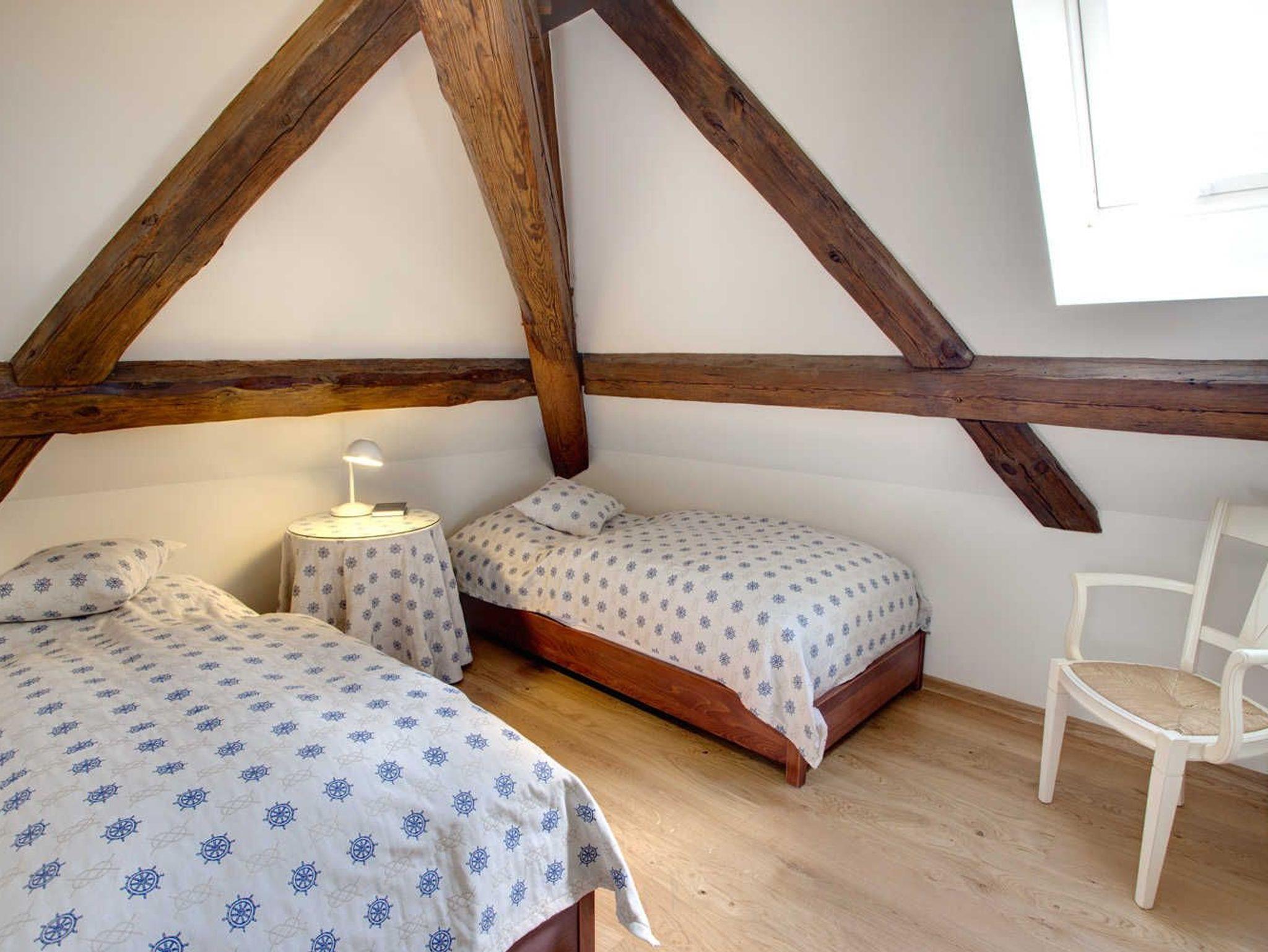 Charmantes Dach-Apartment auf 87 Quadratmetern mit historischem Gebälk aus dem 18. Jahrhundert. Eingerichtet im Landhausstil. Wohn- und Essbereich mit Sitzecke, Sofa und Esstisch sowie Flatscreen. Zwei Schlafkammern mit Doppel- bzw. Einzelbetten. Die Küche ist mit Kaffeemaschine, Toaster, Wasserkocher, Mikrowelle, Kühlschrank mit Gefrierfach, Herd mit Backofen, Geschirrspüler, ausreichend Geschirr und Kochutensilien komplett eingerichtet. Großes Bad mit Duschbadewanne, Handtuchwärmer, reichlich Ablagefläche.