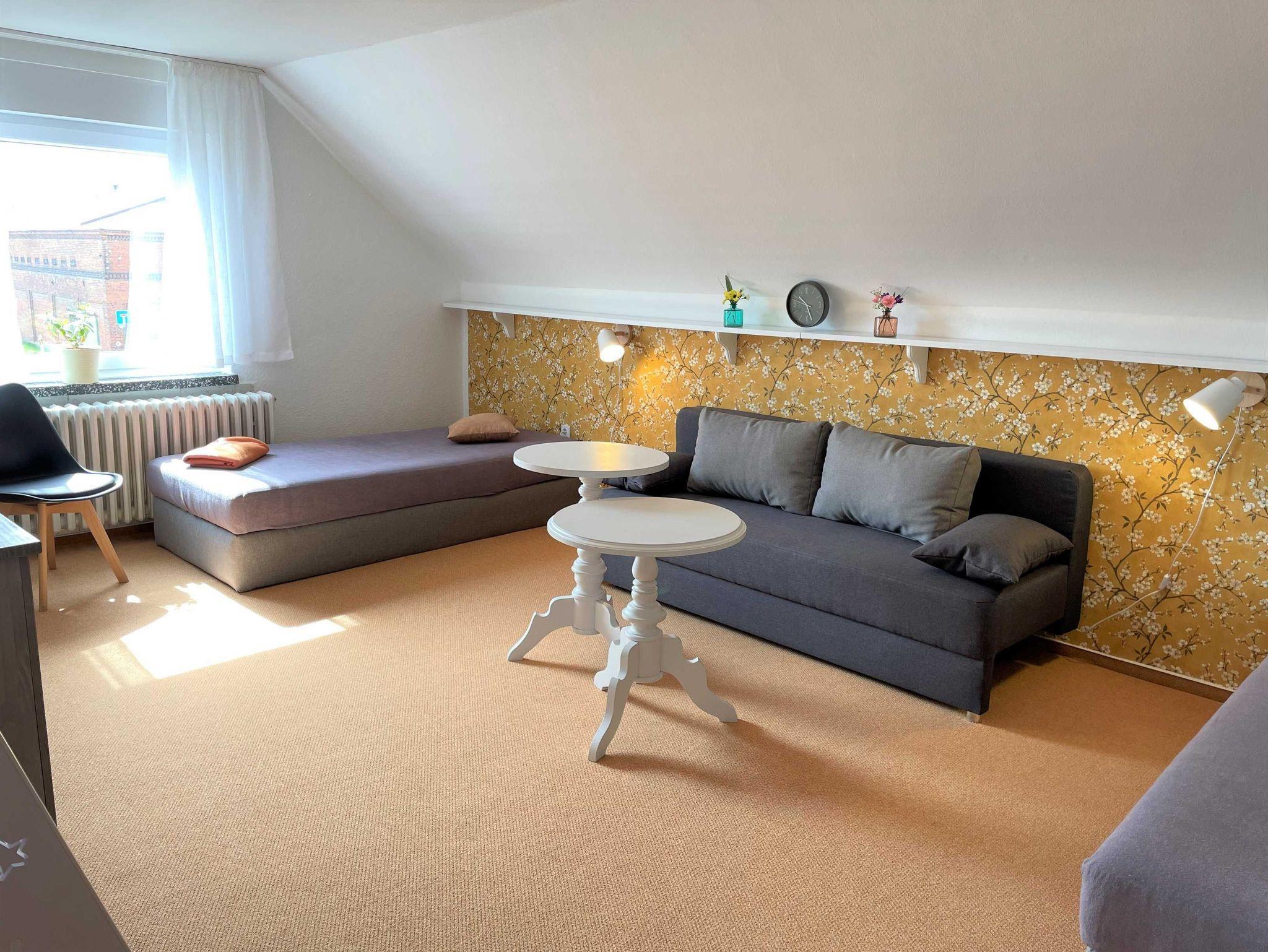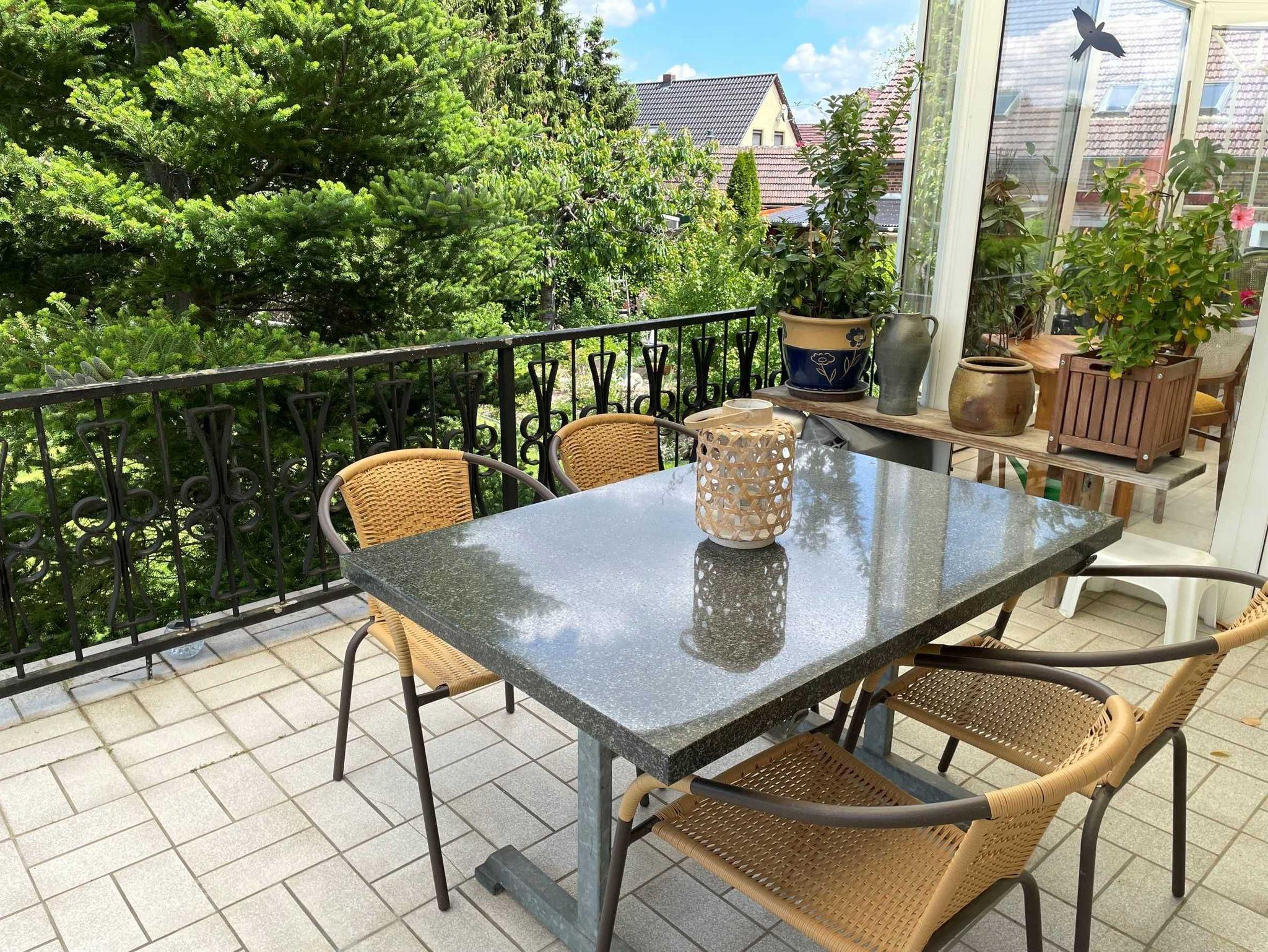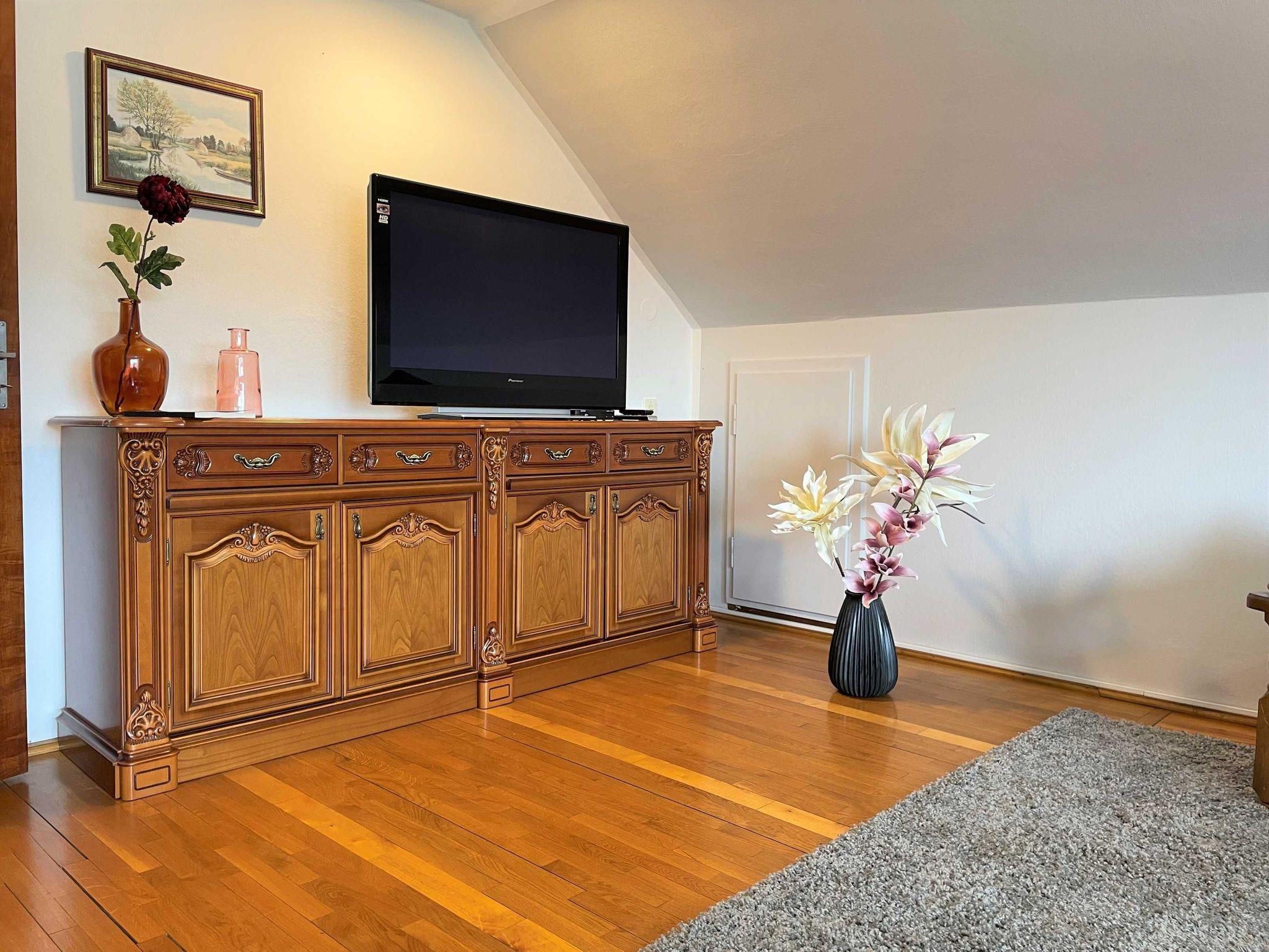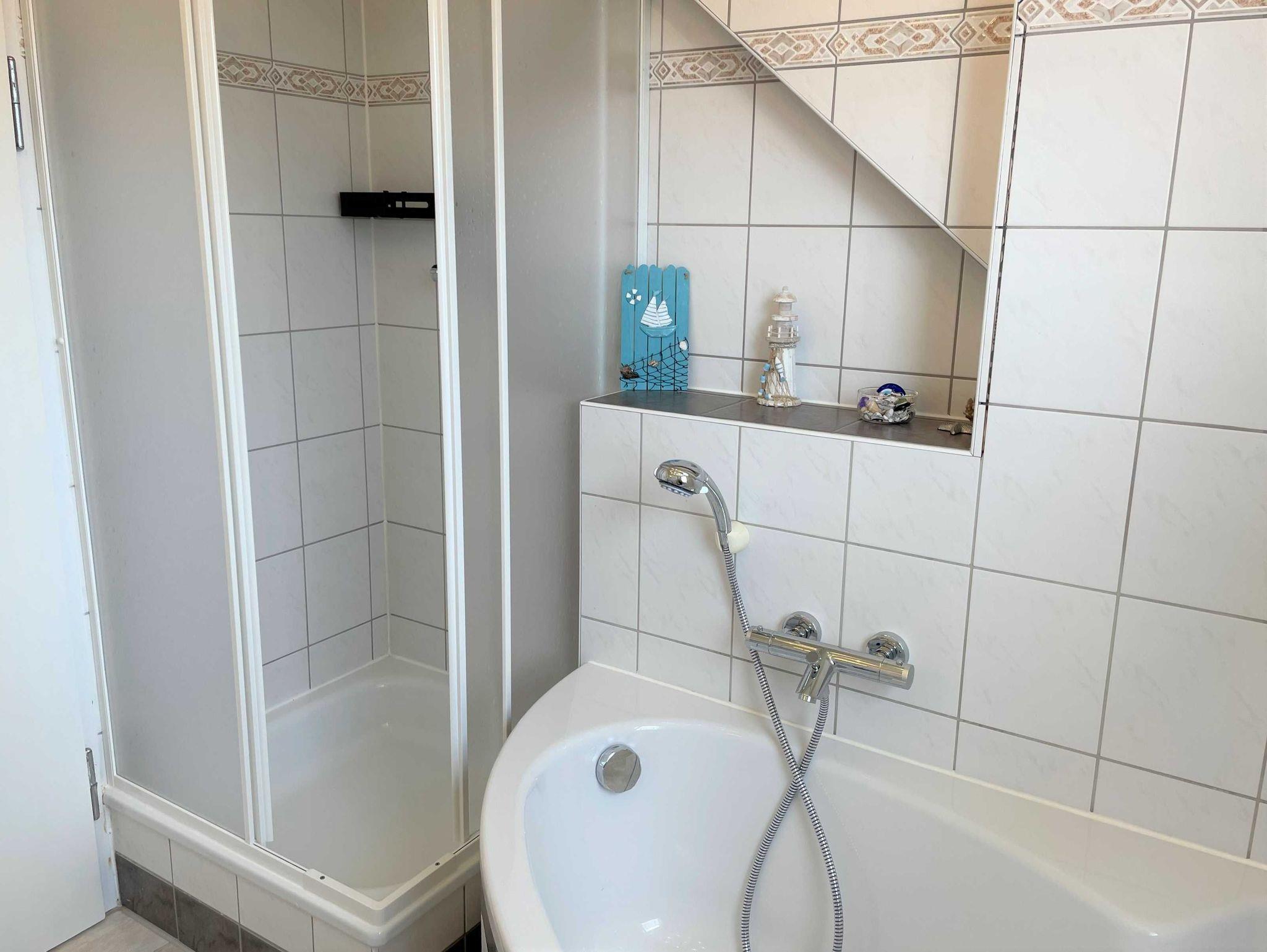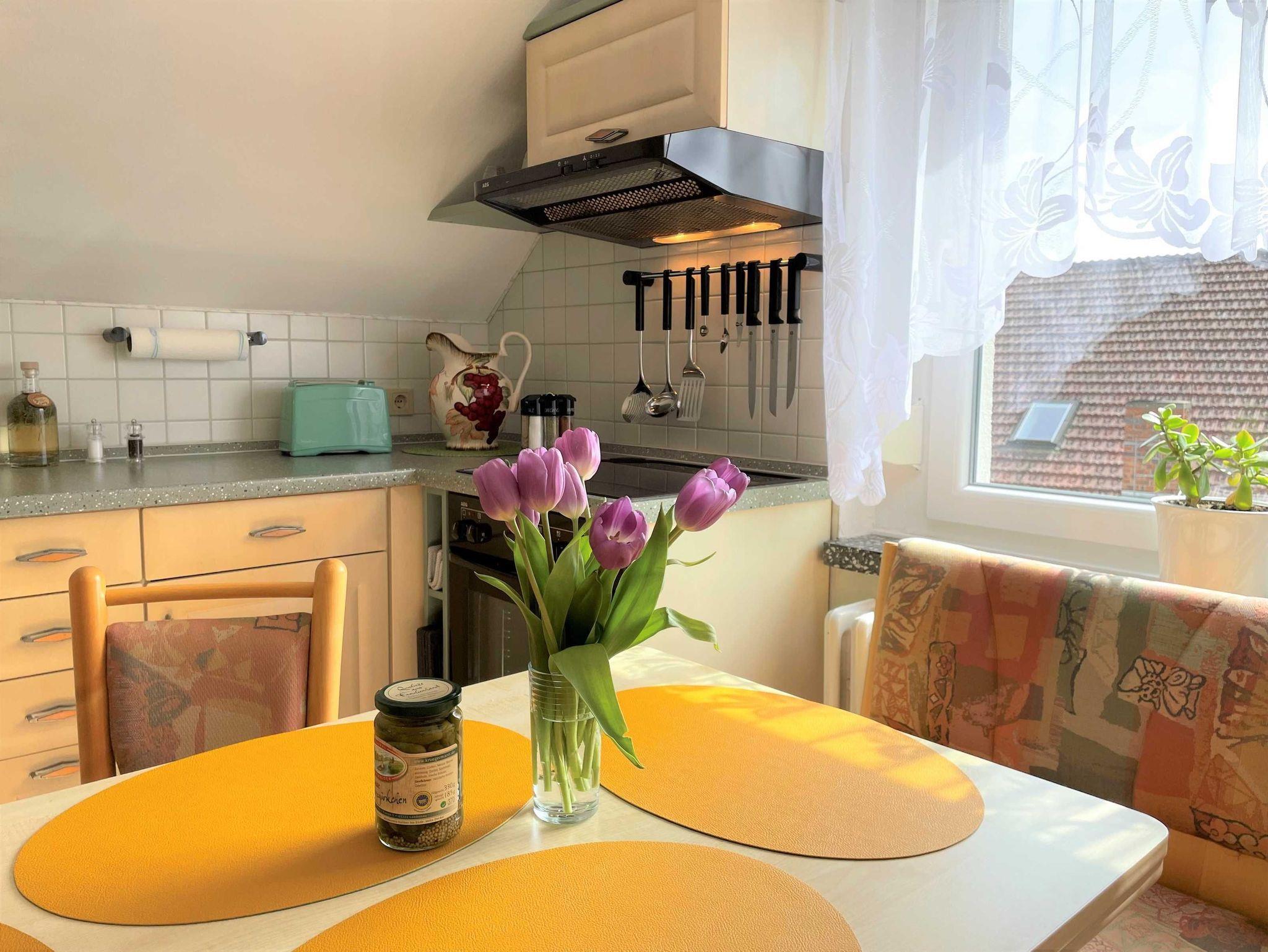 Über den Seiteneingang Veranda gelangen Sie zum Hauseingang. Sie gehen rechts die Treppe hoch zu Ihrer Ferienwohnung. Sie befindet sich im Obergeschoss. Der kleine Flur ist der Zugang zu allen Räumen. Somit ist jeder Wohnbereich separat. Im großzügigen Wohn- und Schlafzimmer haben Sie viel Platz und Ruhe. Jeder findet ein Plätzchen zum Ausruhen auf dem Sofa und können Fernsehen auf dem Flachbild-TV. Im Schlafbereich befindet sich ein Doppelbett (1,80 m x 2,00 m ). Im Kinderzimmer dürfen sich die kleinen Mitreisenden sich so richtig wohl fühlen. Das Zimmer bietet viel Platz, mit Spielsachen, Büchern, einer Couch, Flachbild-TV und zahlreiche Kinderbücher. Die Küche ist vollkommen ausgestattet mit allen Utensilien und Geräten, die Sie zum Kochen und Essen zubereiten brauchen. In der Sitzecke können Sie alle Mahlzeiten einnehmen. Das Bad bietet Ihnen eine Badewanne, Dusche und WC.