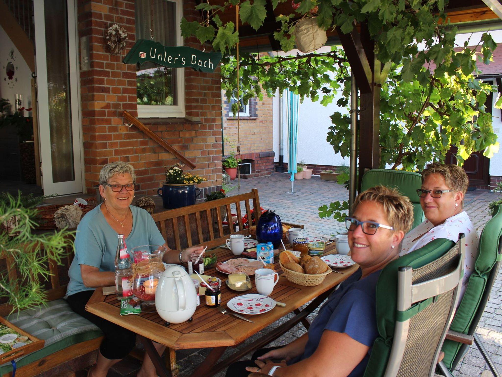 Vor der Ferienwohnung ist eine nicht einsehbare Terrasse zum Frühstücken, Entspannen, für eine Tasse Kaffee oder ein Gläschen Wein. Bereiten Sie hier Ihre neuen Pläne vor oder entspannen Sie von den Erlebnissen des Tages.