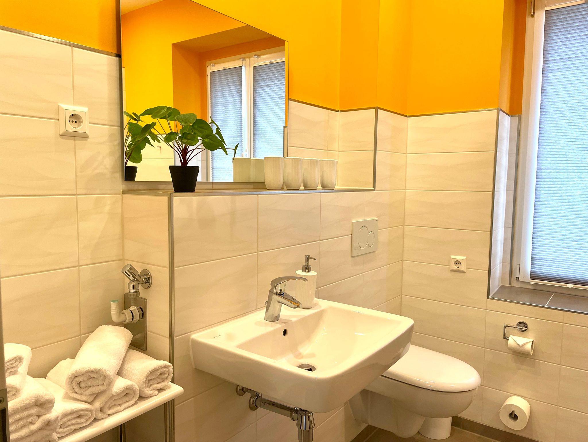 Das separate Bad mit Dusche/ WC schließt sich dem Flur an und hat eine ebenerdige große Dusche. Das helle Badezimmer hält Handtücher, Gästehandtücher, einen Föhn und Seife für Sie bereit. Es hat ein Fenster und ist verdunkelbar.