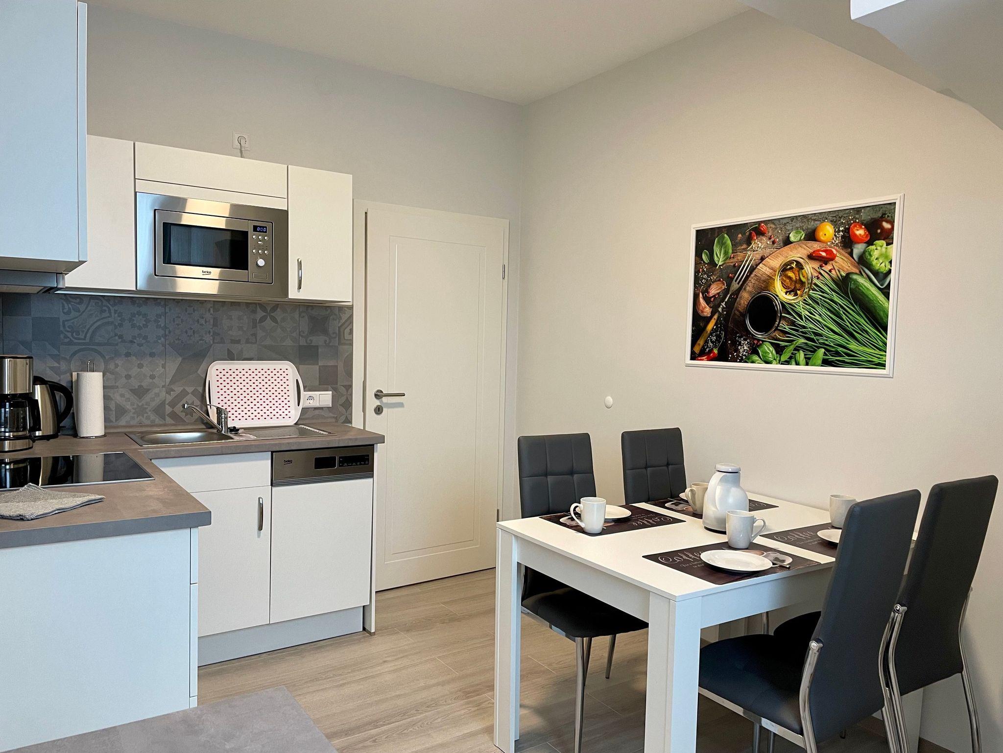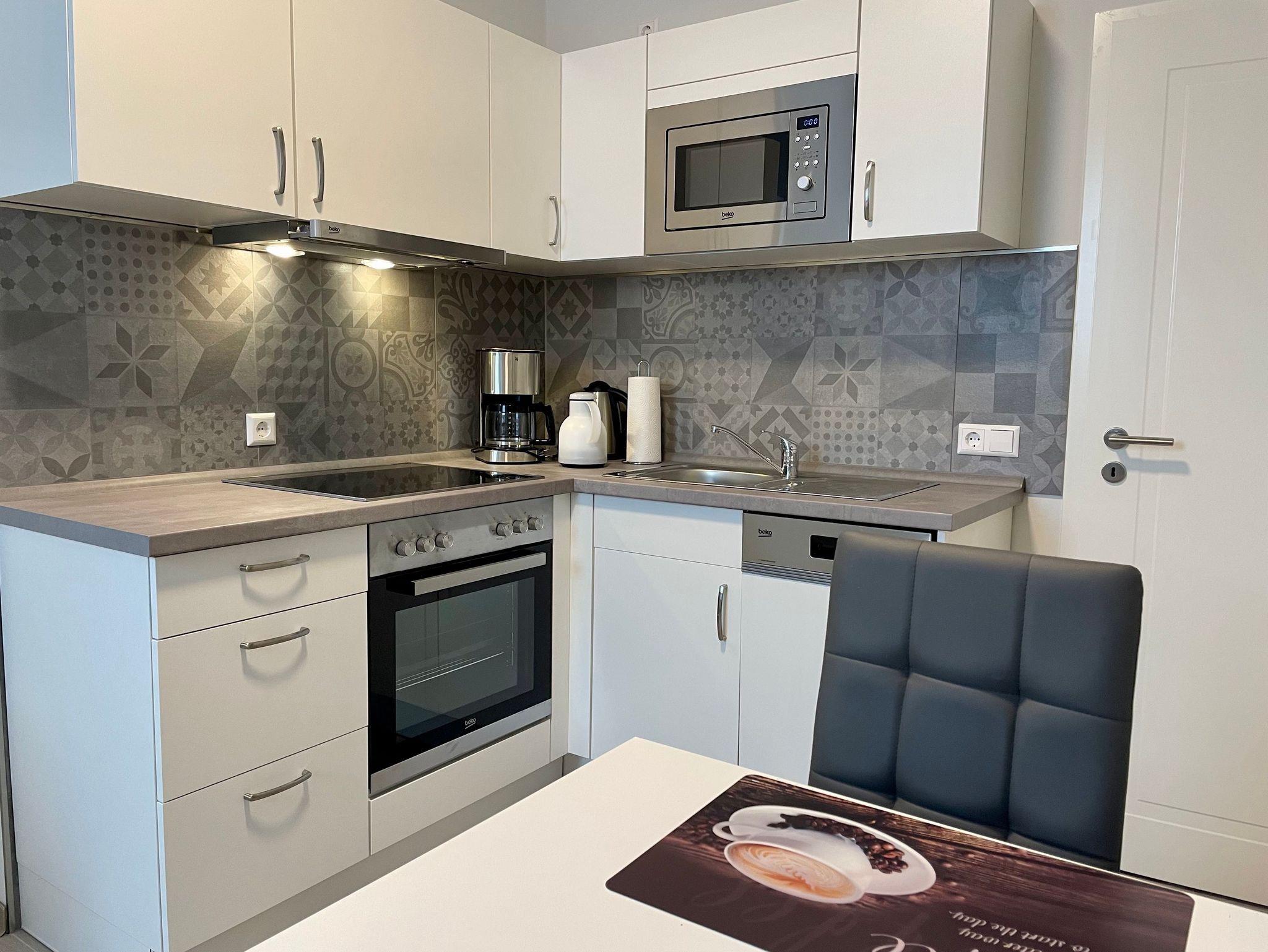 Vom Flur kommen Sie in die separate Küche. Diese ist voll ausgestattet mit dem Geschirr-Equipment für bis zu vier Personen. Ein Esstisch und Stühle laden auf ein gemütliches Essen ein. Die helle und moderne Küche verfügt über eine Kaffeemaschine, Toaster, einer Mikrowelle und einem Koch/- und Backofen. Ein moderner Geschirrspüler ist als Küchenhelfer dienlich.