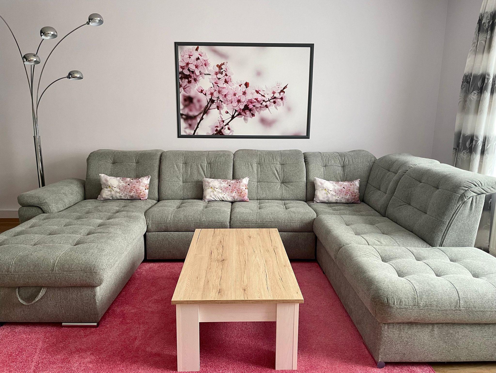 Das große Wohnzimmer ist mit einer komfortablen großen Wohnlandschaft ausgestattet und dient bei Bedarf als Aufbettung für zwei Personen. Im Wohnbereich befindet sich ein Sideboard mit einem großen Flachbildschirm sowie ein Schreibtisch. Der Schreibtisch steht am Fenster und ist für eine Workation optimal nutzbar.