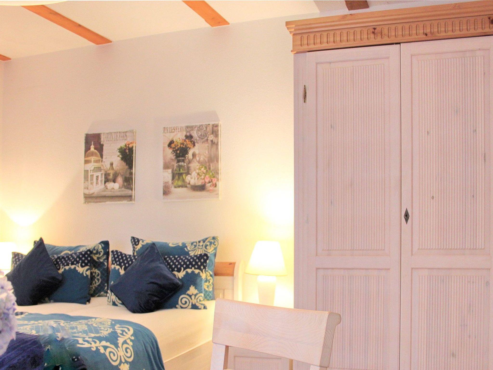 Die Ferienwohnung Himmelblau befindet sich im Erdgeschoss des Hinterhauses. Sie haben direkten Zugang zum Garten, welcher liebevoll mit kleinen Sitzecken zum Verweilen ausgestattet ist. Die 25 qm große 1-Raum-Wohnung ist ideal ausgestattet für zwei Personen.