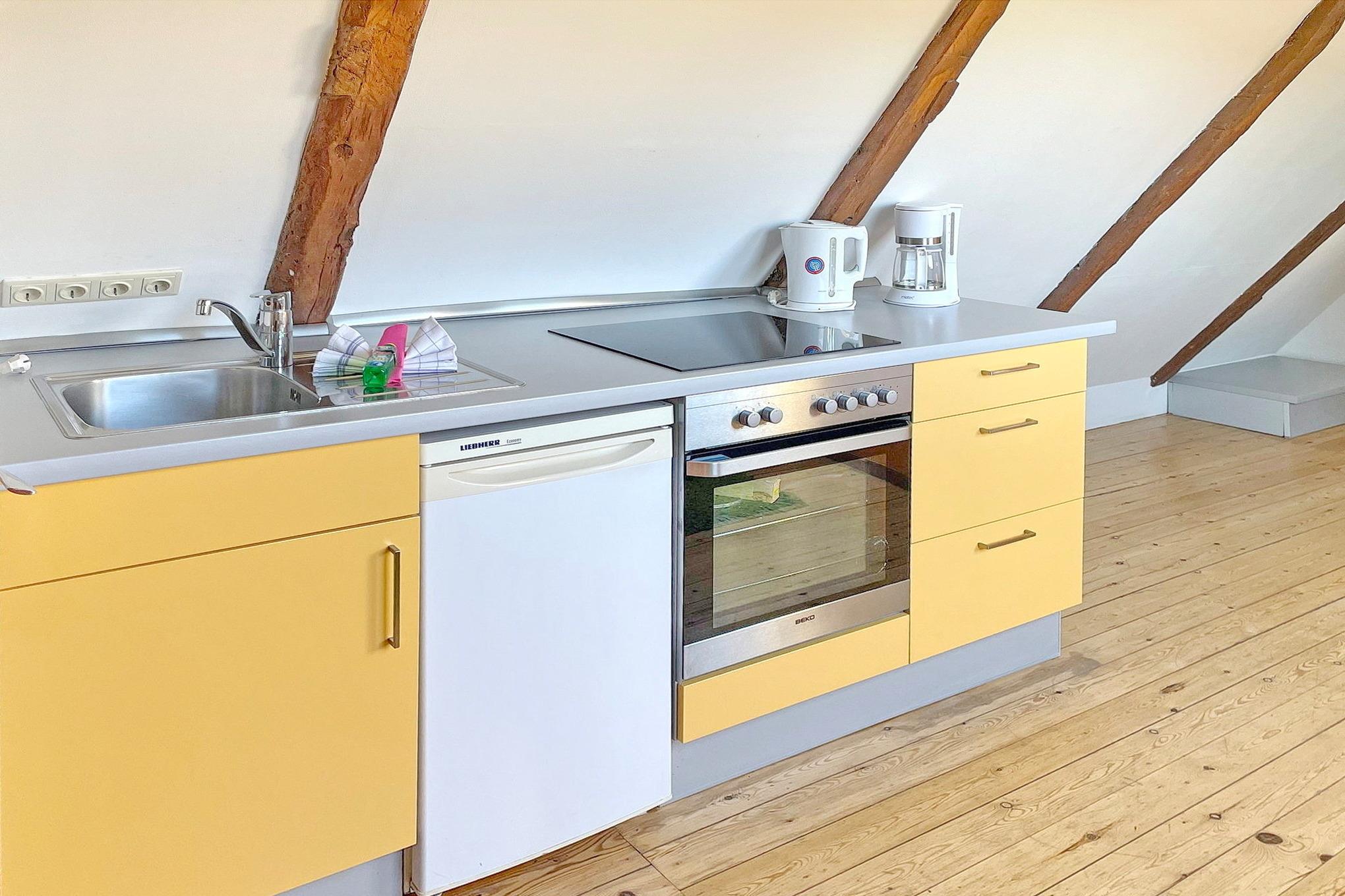Die Wohnung 2 Monde befindet sich im Dachgeschoss. Sie gleicht einem Studioapartment mit Schlaf-, Wohn-, Küchenbereich. Das Bad ist separat mit Dusche und WC.
