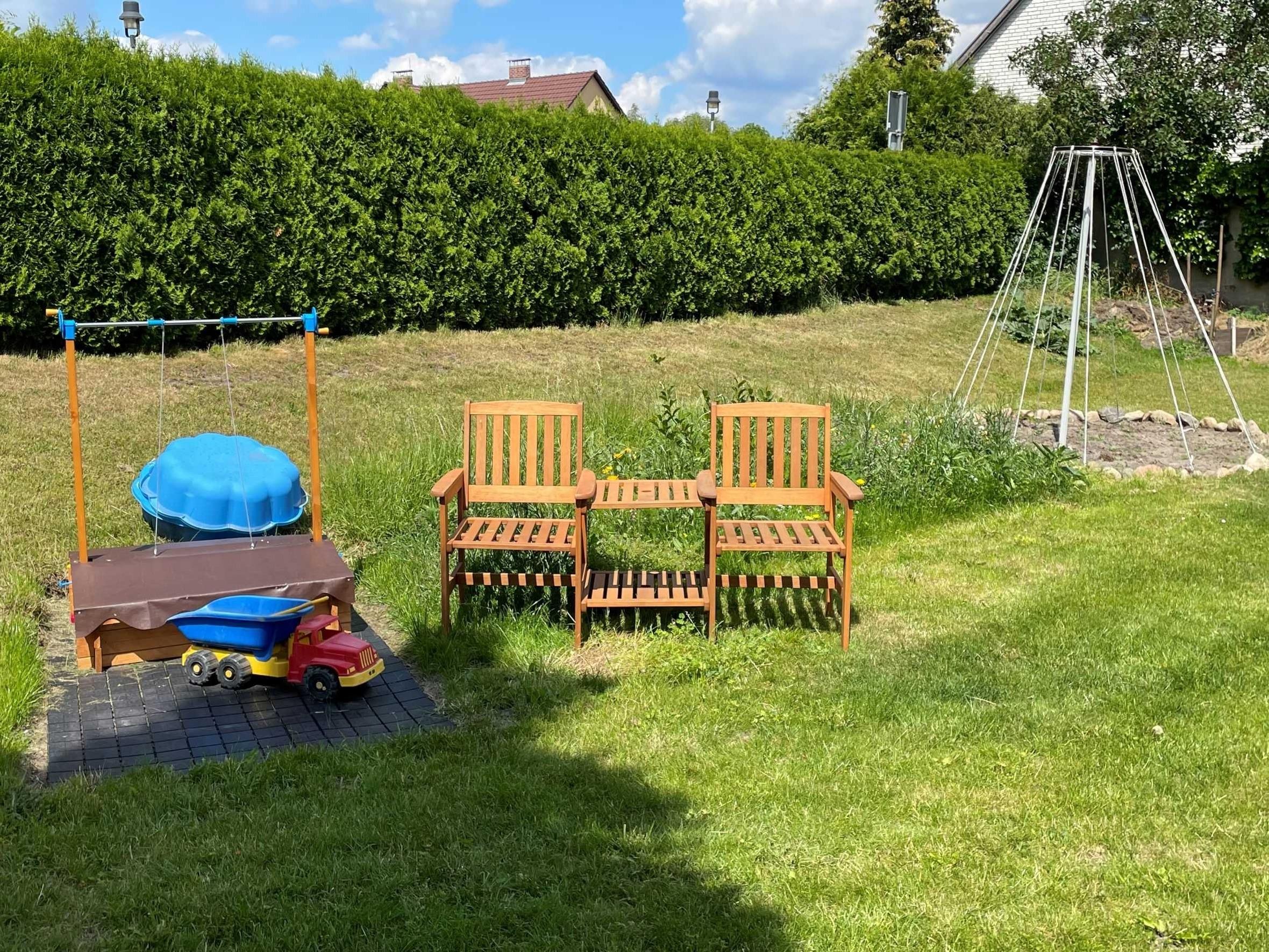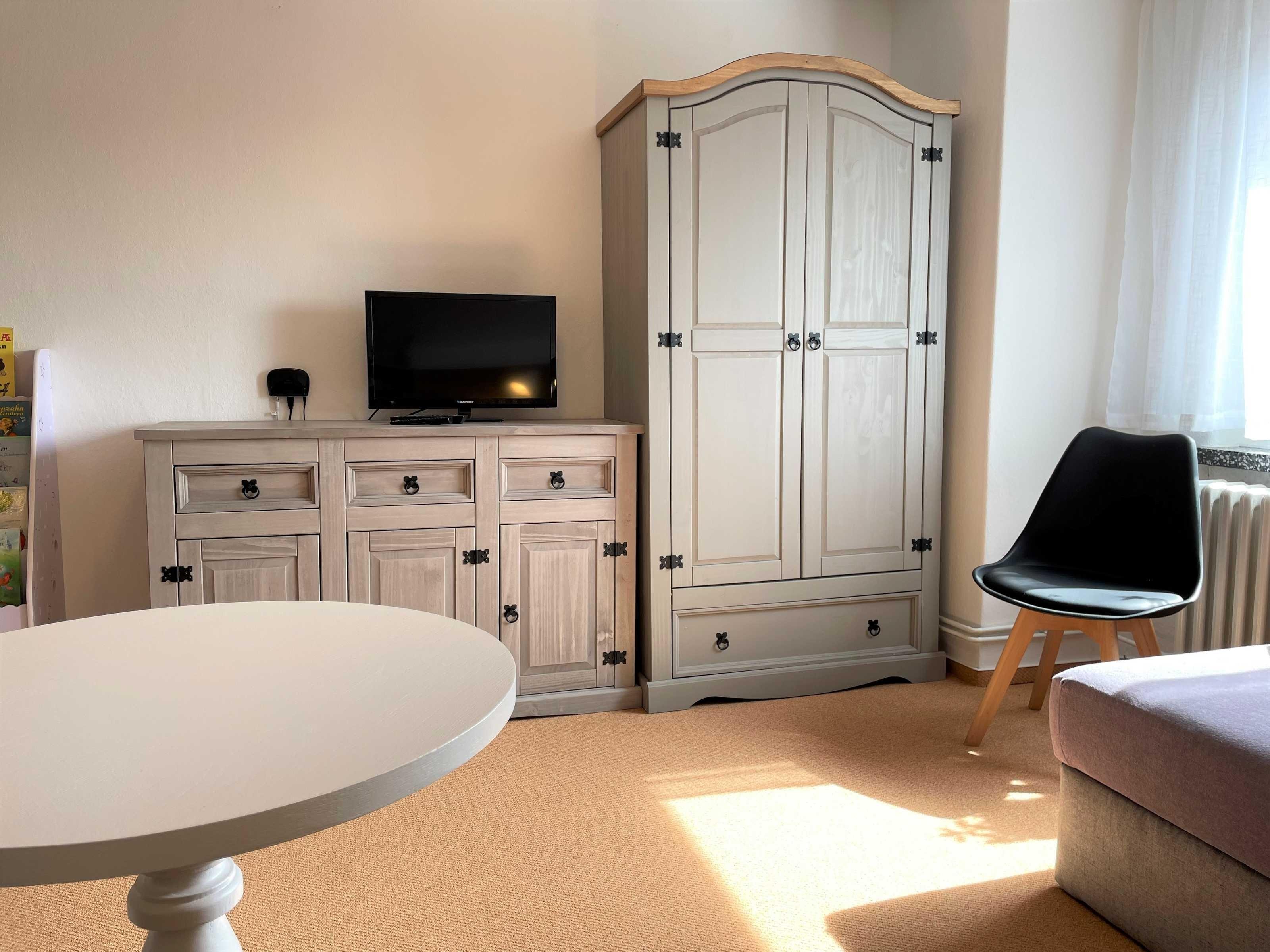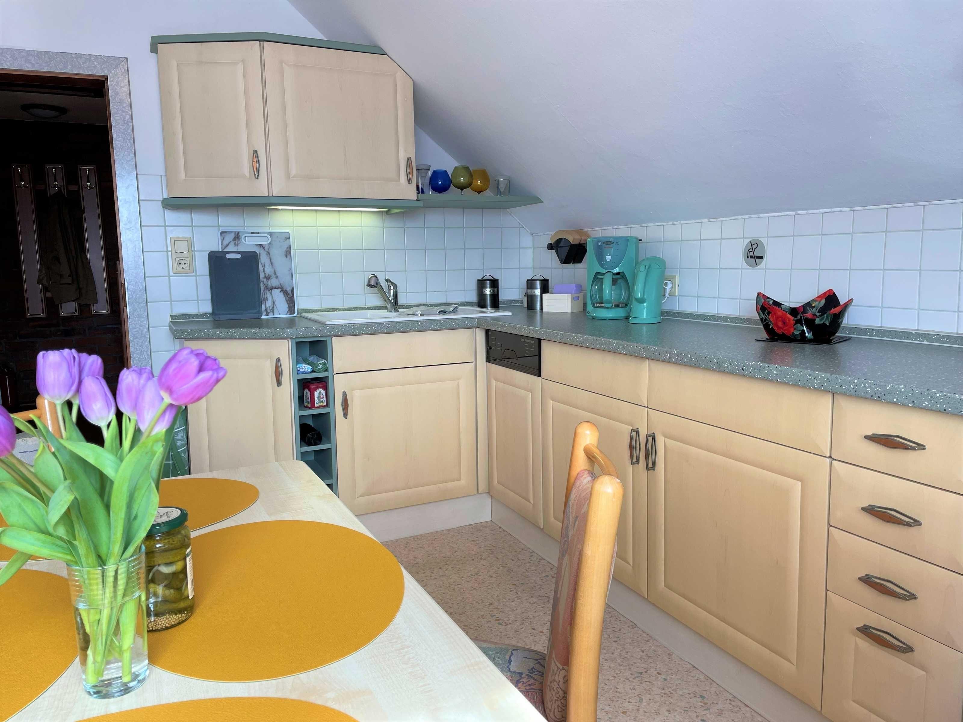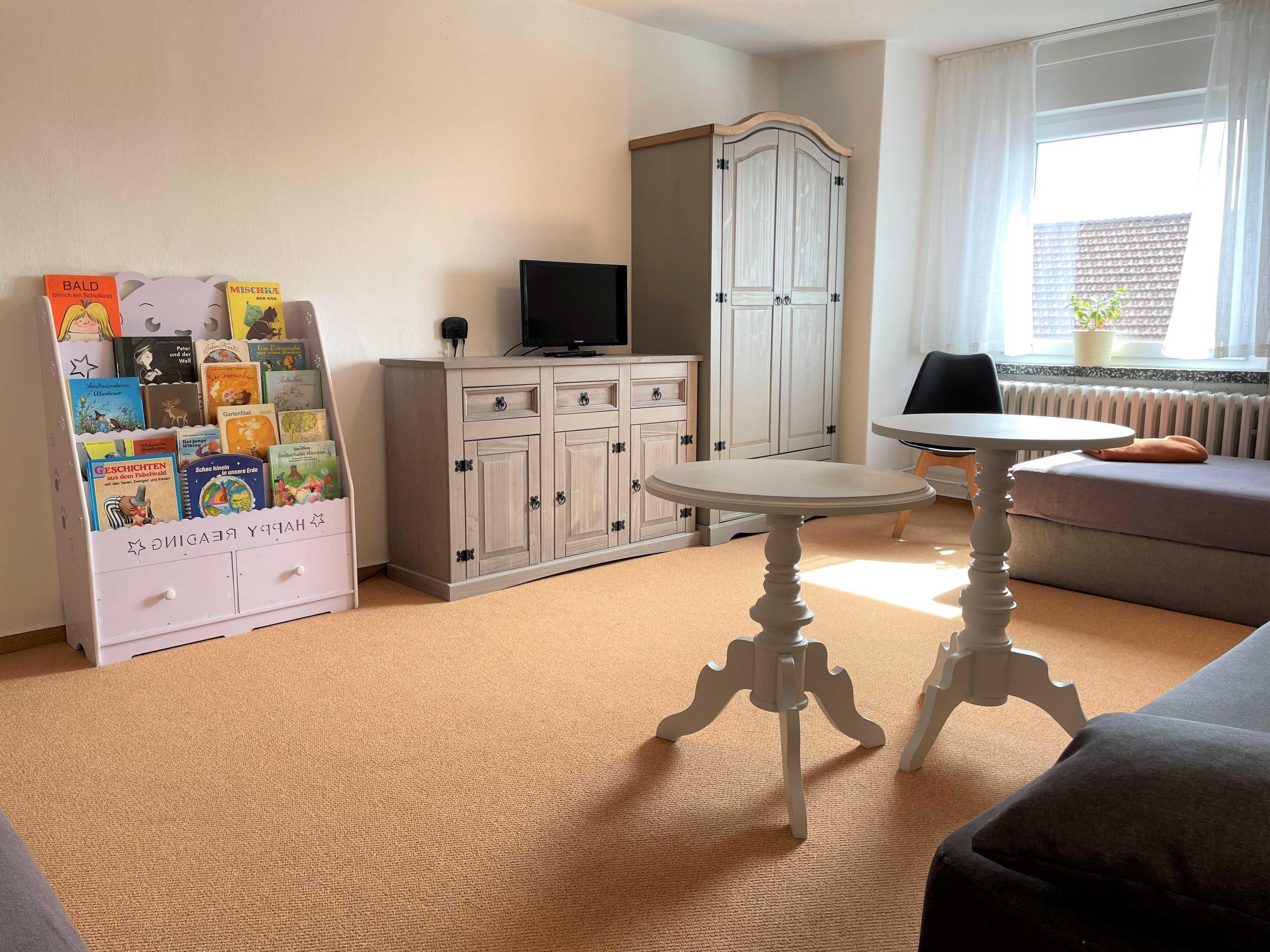 Über den Seiteneingang Veranda gelangen Sie zum Hauseingang. Sie gehen rechts die Treppe hoch zu Ihrer Ferienwohnung. Sie befindet sich im Obergeschoss. Der kleine Flur ist der Zugang zu allen Räumen. Somit ist jeder Wohnbereich separat. Im großzügigen Wohn- und Schlafzimmer haben Sie viel Platz und Ruhe. Jeder findet ein Plätzchen zum Ausruhen auf dem Sofa und können Fernsehen auf dem Flachbild-TV. Im Schlafbereich befindet sich ein Doppelbett (1,80 m x 2,00 m ). Im Kinderzimmer dürfen sich die kleinen Mitreisenden sich so richtig wohl fühlen. Das Zimmer bietet viel Platz, mit Spielsachen, Büchern, einer Couch, Flachbild-TV und zahlreiche Kinderbücher. Die Küche ist vollkommen ausgestattet mit allen Utensilien und Geräten, die Sie zum Kochen und Essen zubereiten brauchen. In der Sitzecke können Sie alle Mahlzeiten einnehmen. Das Bad bietet Ihnen eine Badewanne, Dusche und WC.