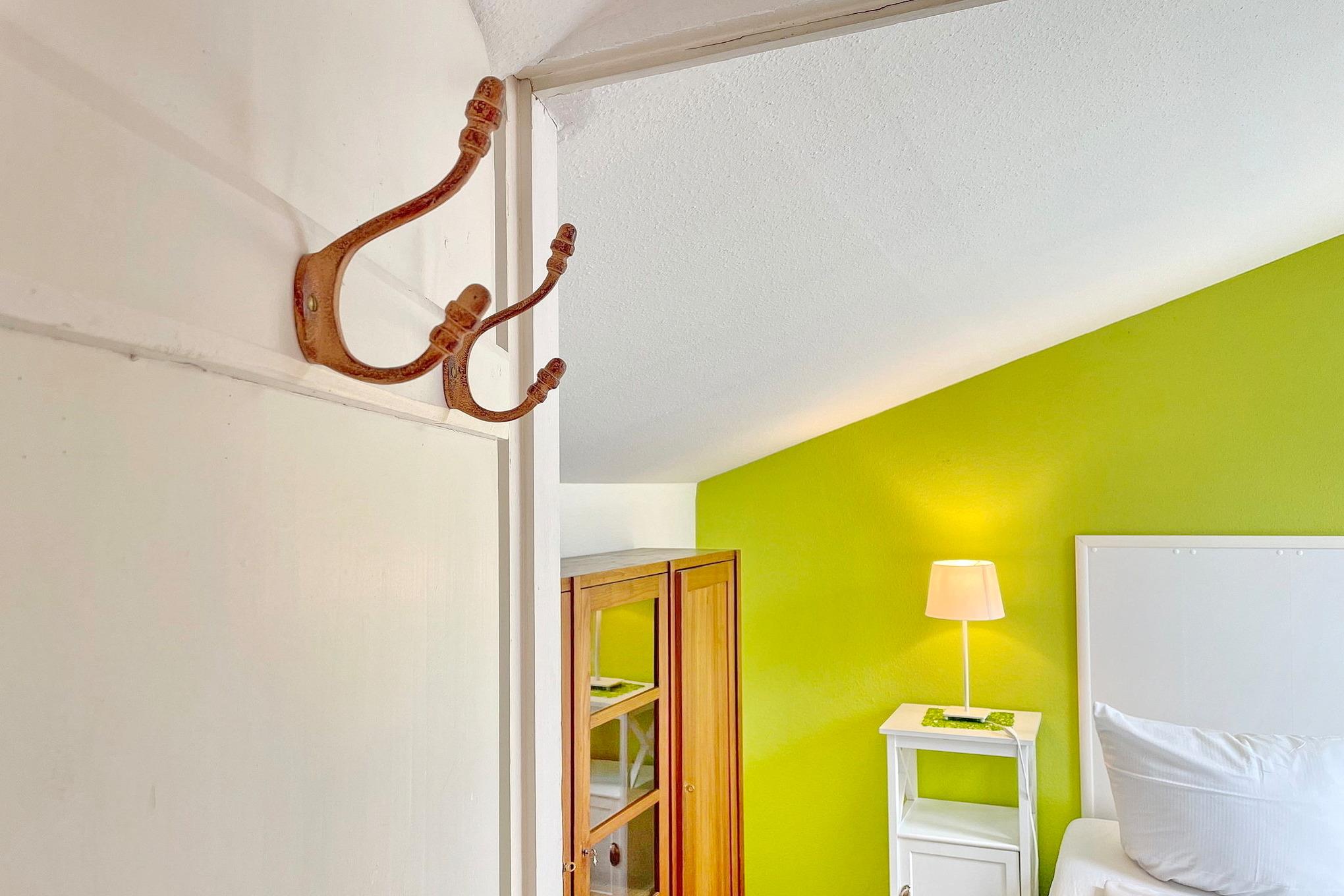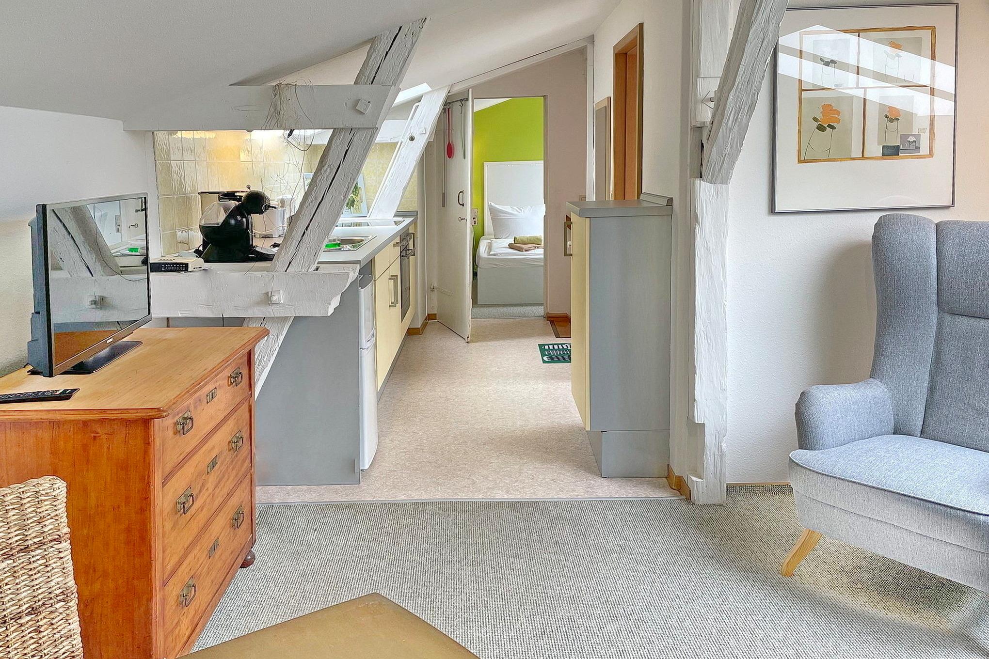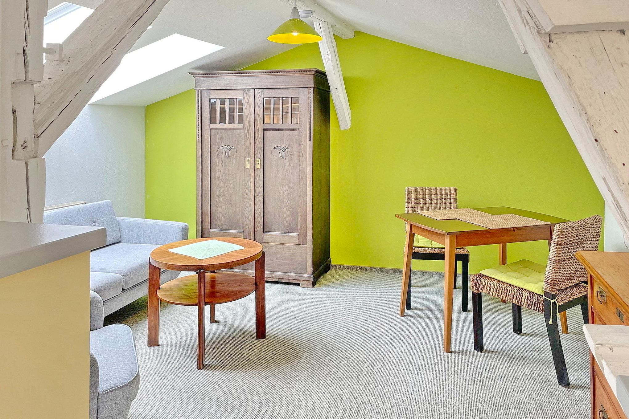 Die Wohnung Lindenblüte befindet sich im Dachgeschoss. Sie hat einen kombinerten Wohn- und Küchenbereich. Im sepraraten Schlafzimmer befindet sich ein Doppelbett. Das Bad ist separat mit Dusche und WC.