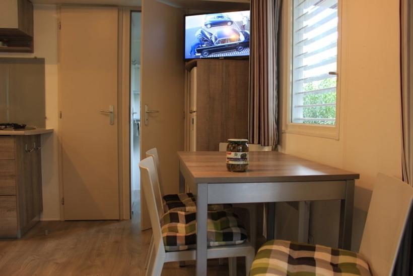 Aufgeteilt ist das Mobilehome auf zwei Schlafräume. Darunter ein Zimmer mit einem Doppelbett und ein Zimmer mit zwei Einzel- und einem Hochbett. Die Konstellation ist besonders Familien mit Kindern zu empfehlen, da hier drei Kinder platz finden.