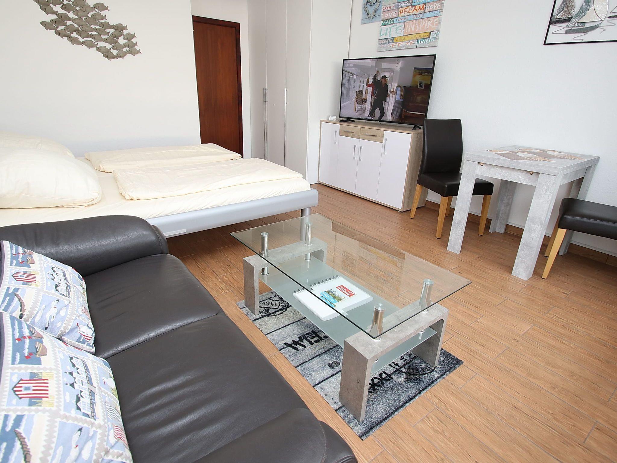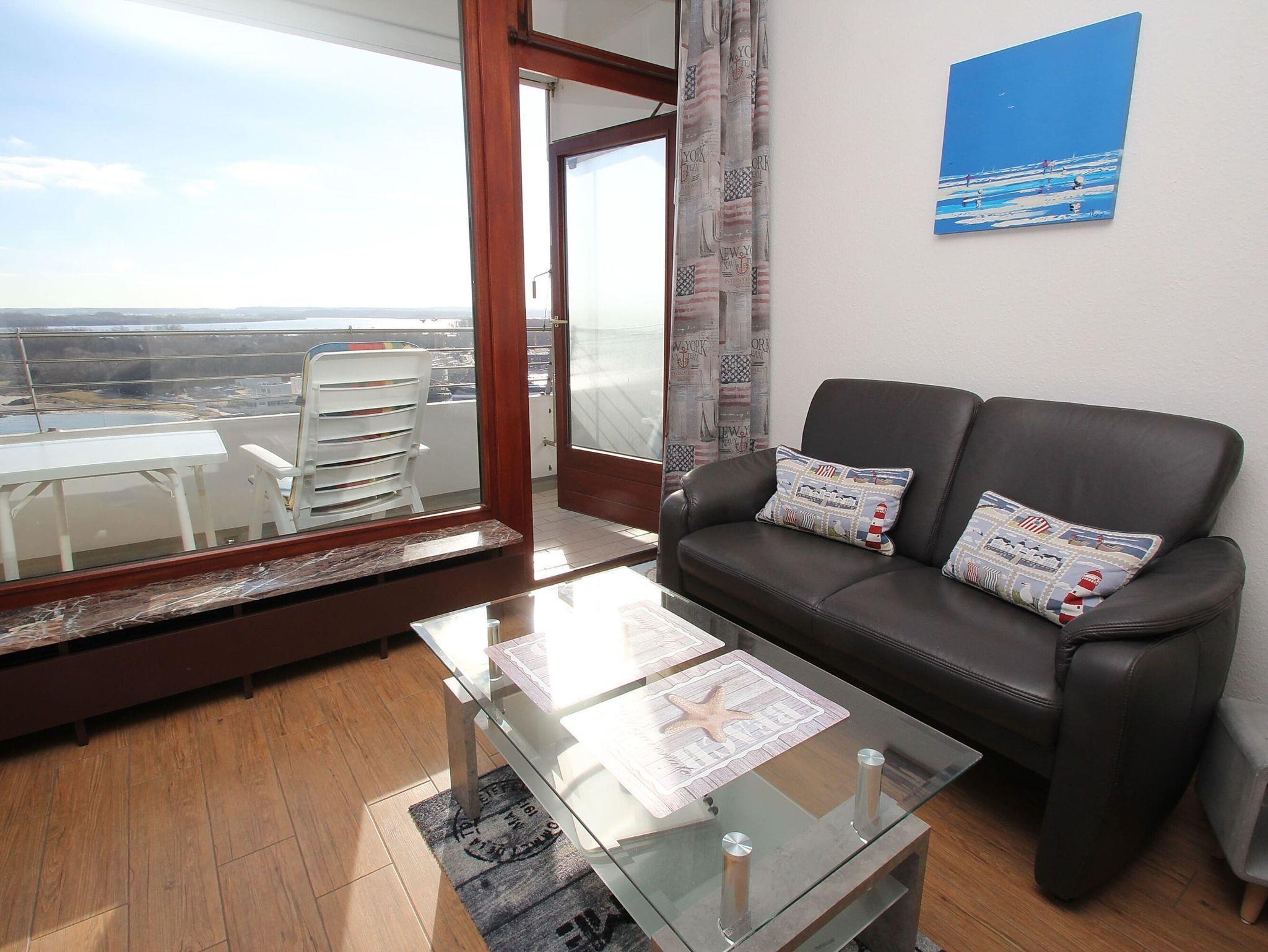 Dieses hochwertige Appartement entspricht allen Ansprüchen und lädt von Anfang an zum Wohlfühlen ein. Der helle Wohnraum besteht aus einem komfortablen Doppelbett (2x 90 cm x 200 cm) und einer bequemen Ledercouch mit Tisch. Des Weiteren gehören zu der geschmackvollen Einrichtung eine Essecke mit Stühlen und ein Kleiderschrank. Der gesamte Wohnbereich ist mit Designerfliesen in Holzoptik ausgestattet. Die moderne Küche ist im Eingangsbereich integriert. Das neue, luxuriöse Duschbad erreichen Sie vom Flur. Diese fantastische Wohnung hat die besten Voraussetzungen für einen erholsamen Urlaub. Vom Balkon genießen Sie einen traumhaften Blick auf die Mecklenburger Bucht und zur Trave mit ein- und ausfahrendem Schiffsverkehr.