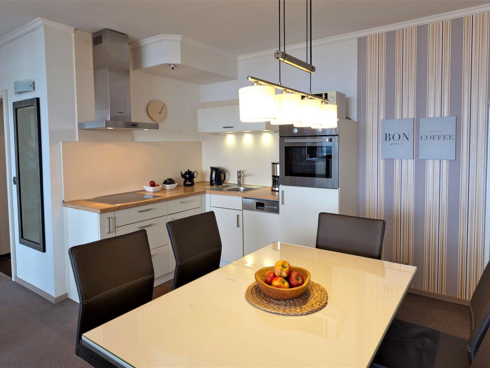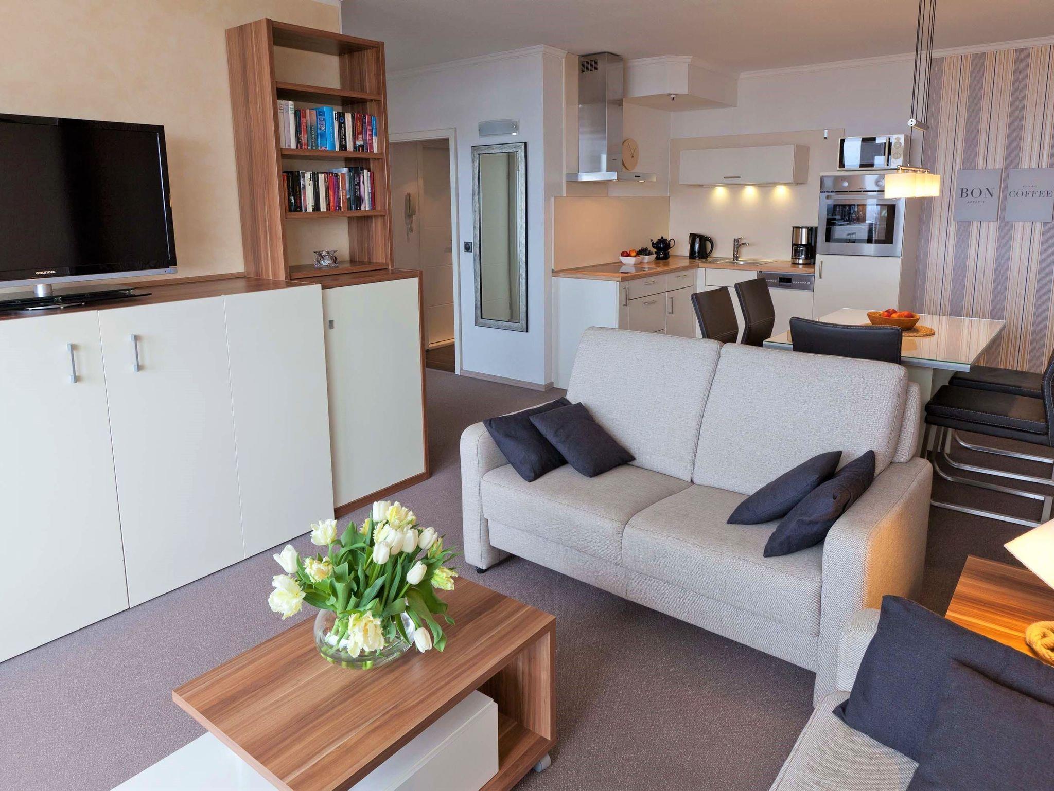 Dieses Appartement hat einen besonderen Erholungswert an Ausstattung und Bequemlichkeit. Es wurde im Jahr 2025 frisch renoviert, was zusätzlich zur modernen Atmosphäre beiträgt. Von der Eingangstür erreichen Sie den Flur, von dem das moderne Duschbad abgeht. Durch eine Glastür gelangen Sie in den schönen Wohnraum, der in warmen Erdtönen gehalten ist. Dieser ist mit einer zweiteiligen Couchgarnitur mit Tisch, einer Schrankwand mit integriertem Schrankbett (145 cm x 190 cm) sowie mit einer gemütlichen Essecke neben der offenen Einbauküche eingerichtet. Vom Wohnzimmer erreichen Sie ein kleines, zusätzliches Zimmer (ähnlich einer Kajüte) mit einem Einzelbett (80 cm x 190 cm). Das lichtdurchflutete Schlafzimmer besteht aus einem bequemen Doppelbett (2x 90 cm x 200 cm) und einem großzügigen Kleiderschrank. Vom Wohn- und Schlafraum erreichen Sie den großen Balkon, um den traumhaften Ausblick auf die Ostsee, die Strandpromenade und die Lübecker Bucht zu genießen.