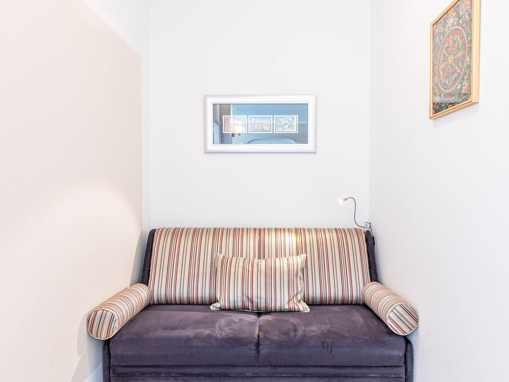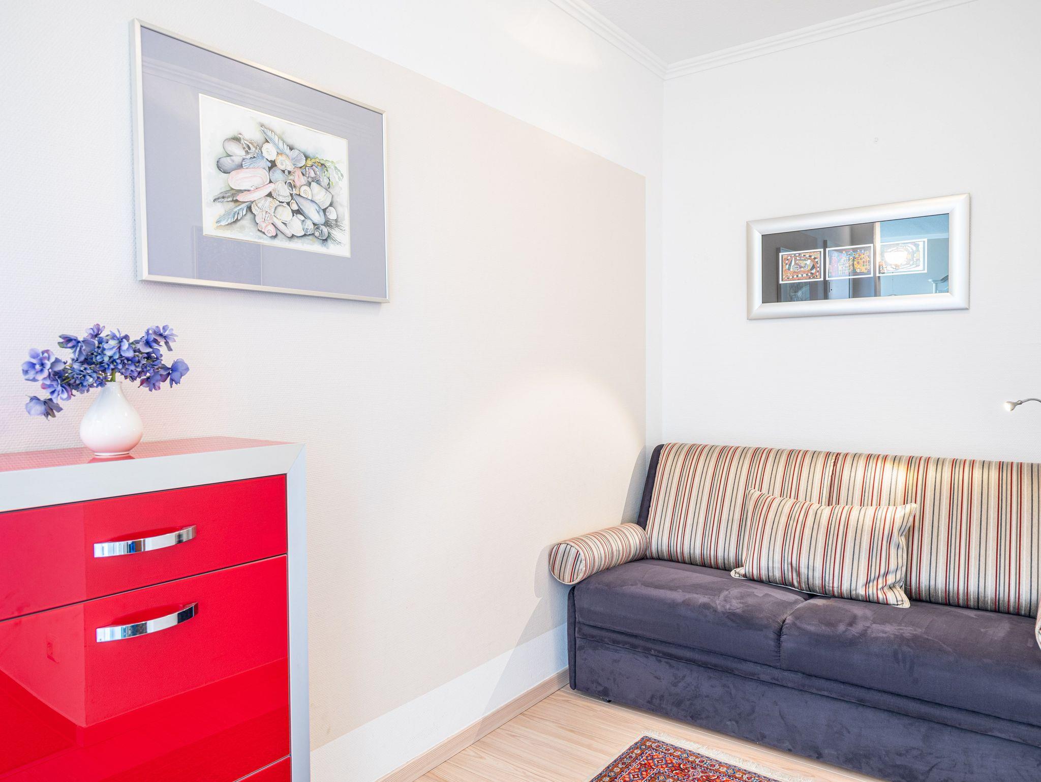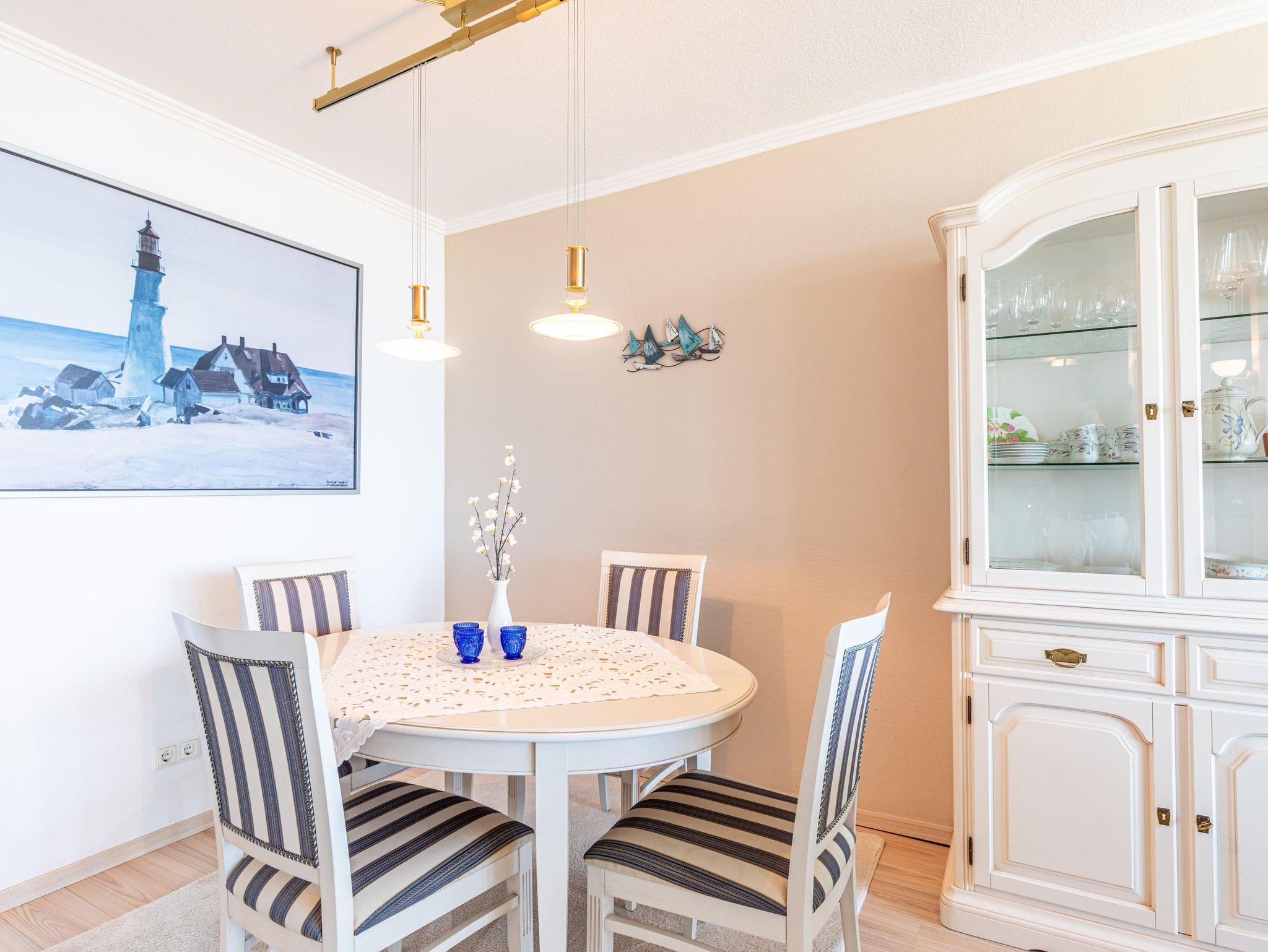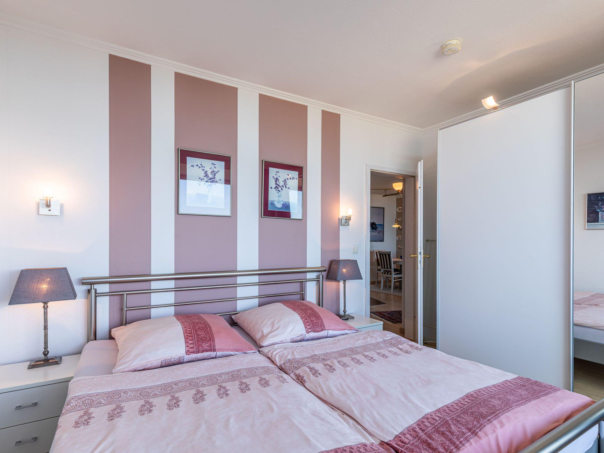 Direkt am Strand erwartet Sie hier ein modernes, im maritimen Stil möbliertes 2-Zimmer-Appartement mit allem Komfort zum Wohlfühlen. Im Wohnraum befinden sich ein gemütlicher Dreisitzer und ein Sessel mit einem Couchtisch sowie ein Esstisch mit vier Stühlen. Dank der gut ausgestatteten Küchenzeile, die sich ebenfalls im Wohnraum befindet, können Sie entscheiden, ob Sie selber kochen oder sich durch die kulinarische Küche Travemündes schlemmen möchten. Im Schlafzimmer stehen ein bequemes Doppelbett (180cm x 200 cm) und ein Kleiderschrank.In der Wohnzimmernische befindet sich eine Sitz-/Schlafcouch (140 cm x 200 cm). Das Duschbad, das Sie vom Flur erreichen, ist in warmen Farben gehalten. Die sehr geschmackvoll eingerichtete Wohneinheit lässt keine Wünsche offen und lädt zu einem wunderschönen Urlaub an der Ostsee ein. Den großen Balkon erreichen Sie von beiden Zimmern. Hier genießen Sie einen fantastischen Blick auf den Strand und die Lübecker Bucht.