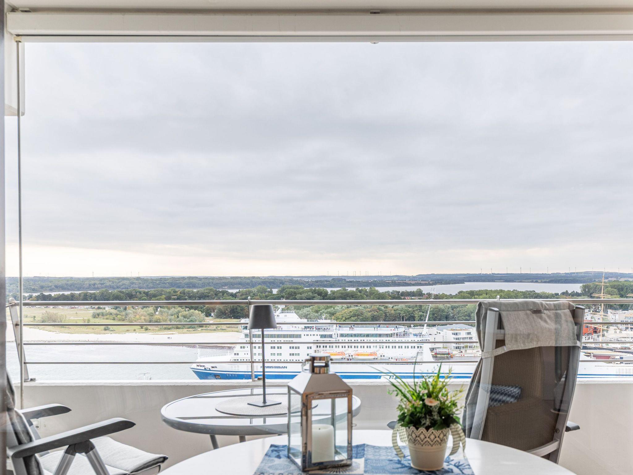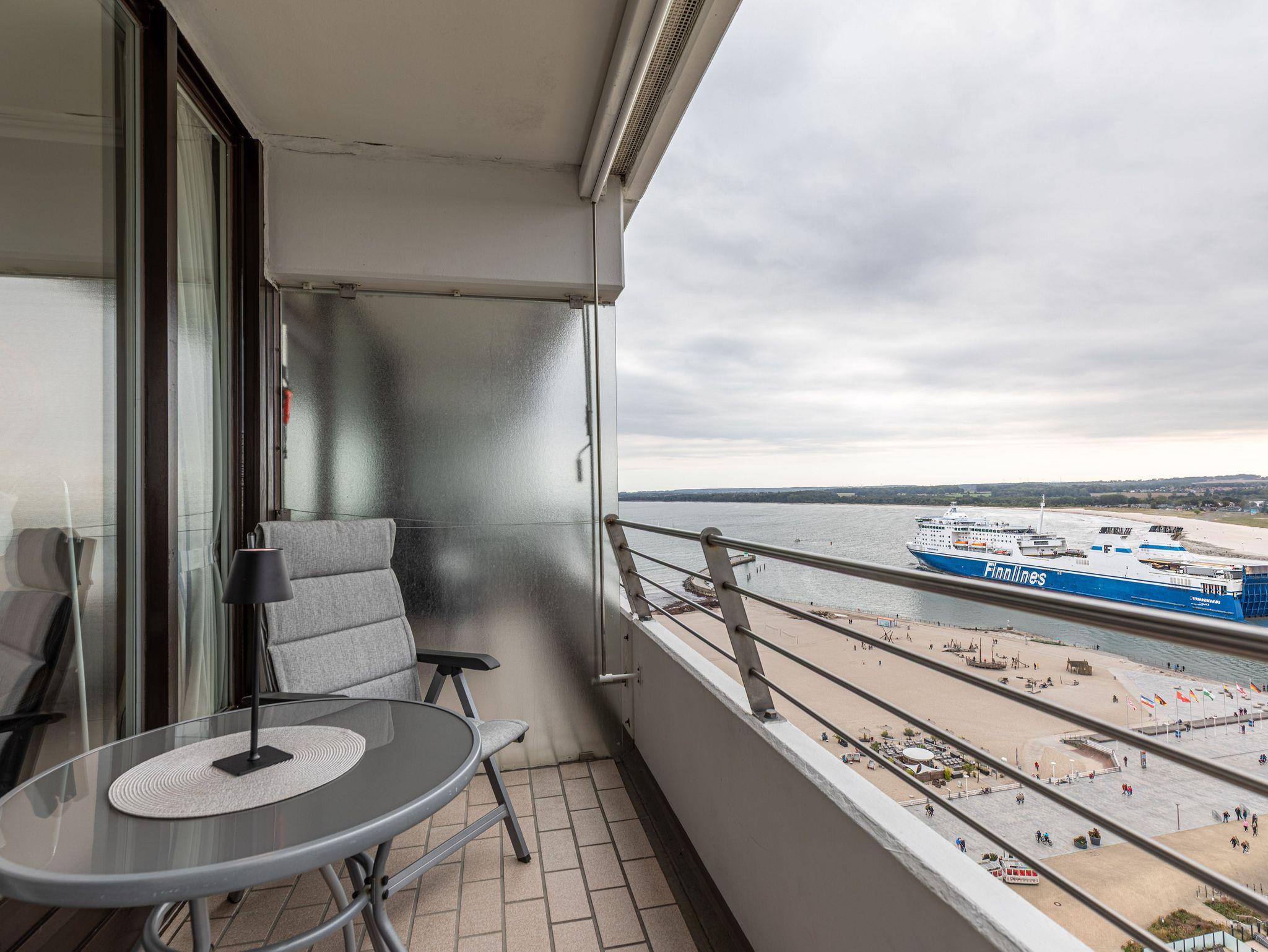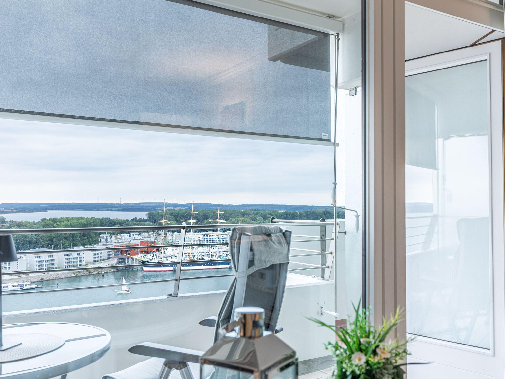 Auf dem Balkon genießen Sie einen traumhaften Blick über die Lübecker Bucht, die Trave, den Priwall mit seinem Naturschutzgebiet und natürlich auf die Viermastbark Passat, ein Fernglas macht das maritime Erlebnis noch intensiver. Die Senkrechtmarkise bietet Ihnen einen optimalen UV-Schutz und weiterhin die perfekte Sicht durch das transparente Gewebe.