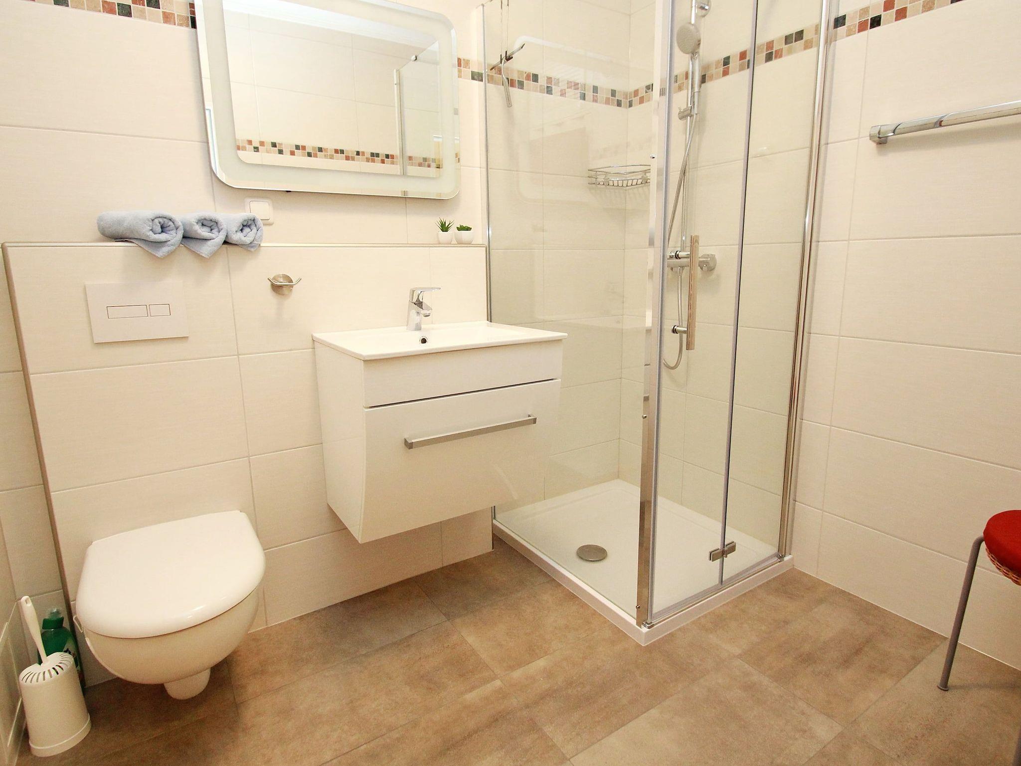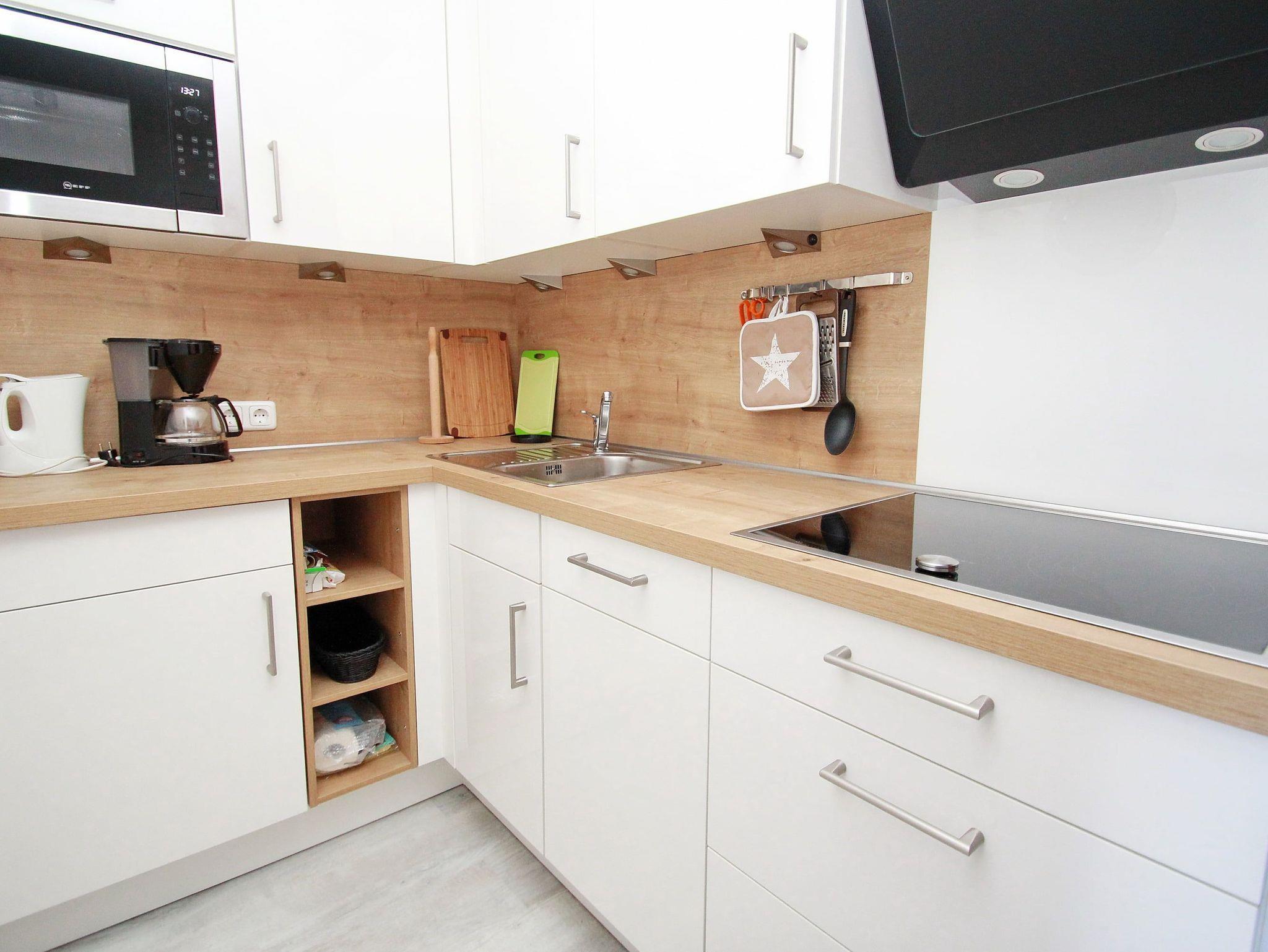 In einer gepflegten, ruhigen Wohnanlage erwartet Sie hier ein sehr schönes Appartement mit viel Komfort für Ihren Urlaub in strandnaher Lage. Der helle, gemütliche Wohnbereich besteht aus einer bequemen Couch mit einem Relaxsessel und einem Tisch. Des Weiteren befinden sich daneben eine Anrichte sowie zwei Einzelschrankbetten (je 90 cm x 190 cm). Gegenüber der Einbauküche steht eine schöne Essecke. Das neuwertige Bad geht separat vom Flur mit Garderobenschrank ab. Durch die Balkontür geht es zur großen, sonnigen Terrasse mit Gartenmöbeln. Hier genießen Sie die frische Seeluft und schauen in die gepflegte Grünanlage. Rundum ein Appartement zum Wohlfühlen.
