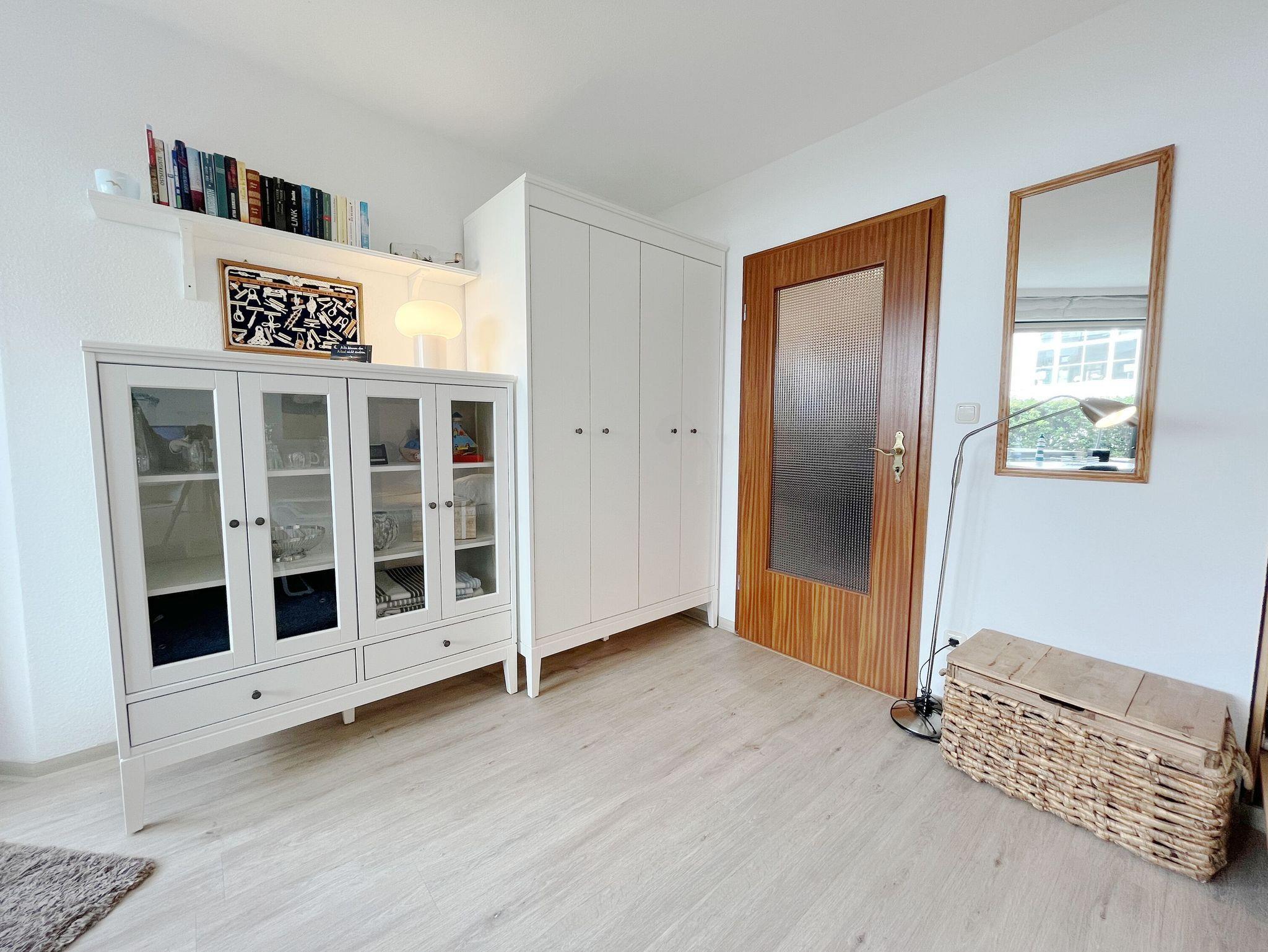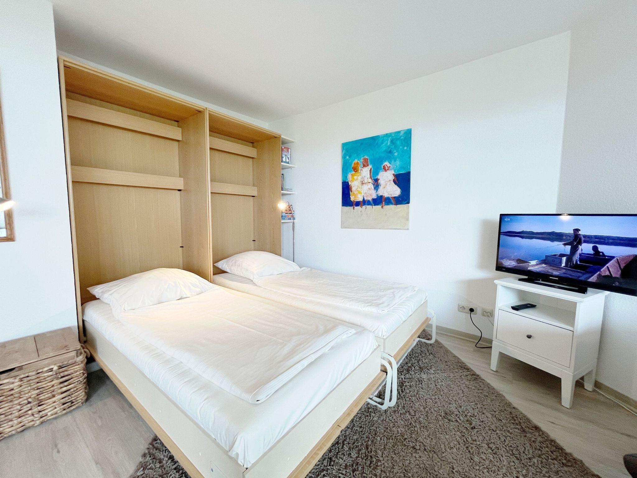Direkt am Strand und dazu noch sehr schön möbliert lädt dieses gemütliche Appartement zu einem erholsamen Urlaubsaufenthalt zu zweit ein. Vom Wohnungseingang gelangen Sie in den Flur mit integrierter Küchenzeile und separat abgehendem Bad. Der behaglich kombinierte Wohn- und Schlafraum ist mit einer Designercouch mit Tisch, einem Sessel sowie einem Esstisch mit Stühlen vor dem Fenster zur Terrasse ausgestattet. Des Weiteren besteht die Einrichtung aus einem bequemen Schrankbett mit zwei nebeneinander integrierten Einzelbetten (je 90 cm x 200 cm) und einer Schrankwand mit Kleiderschrank. Auf der herrlichen Terrasse genießen Sie zu jeder Jahreszeit die gesunde Seeluft. Den Strand sowie die Strandpromenade erreichen Sie durch einen direkten Zugang vom Garten.