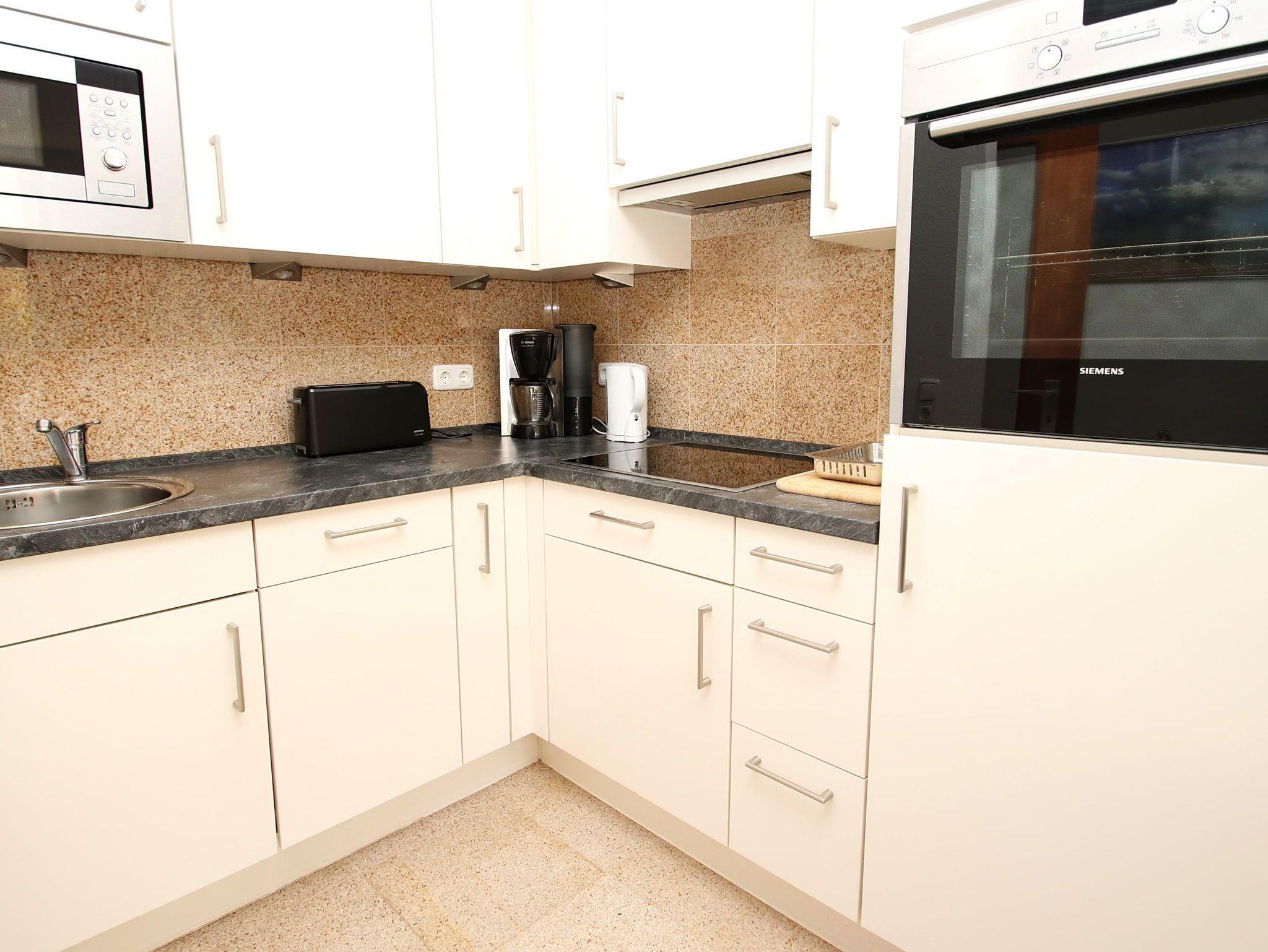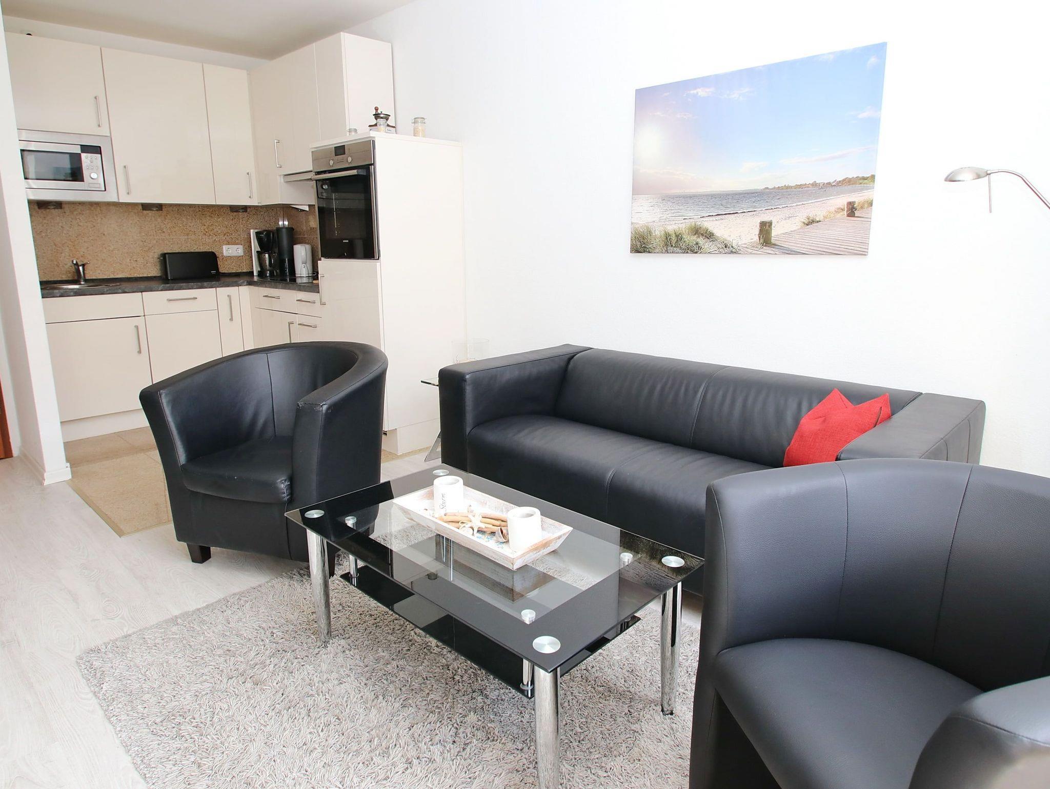 Dieses Appartement besticht mit seiner ruhigen, zentralen und strandnahen Lage in der Kaiserallee. Im Flurbereich, von dem links das Duschbad und rechts das erste Schlafzimmer abgeht, befindet sich ein kleiner und ein etwas größerer Einbauschrank. In dem ersten Schlafzimmer erwartet sie ein bequemes Doppelbett (140 cm x 200 cm) und ein kleiner TV mit DVD-Player. Gerade aus gelangen Sie direkt in den offenen, hellen Wohnbereich, der mit einer gemütlichen dreiteiligen Couchgarnitur, einer Essecke am Fenster und einer modernen Einbauküche ausgestattet ist. Das zweite, vom Wohnbereich abgehende, Schlafzimmer verfügt über ein komfortables Einzelbett (90 cm x 200 cm) und einen Kleiderschrank. Der sonnige Südbalkon lädt zum Verweilen ein.