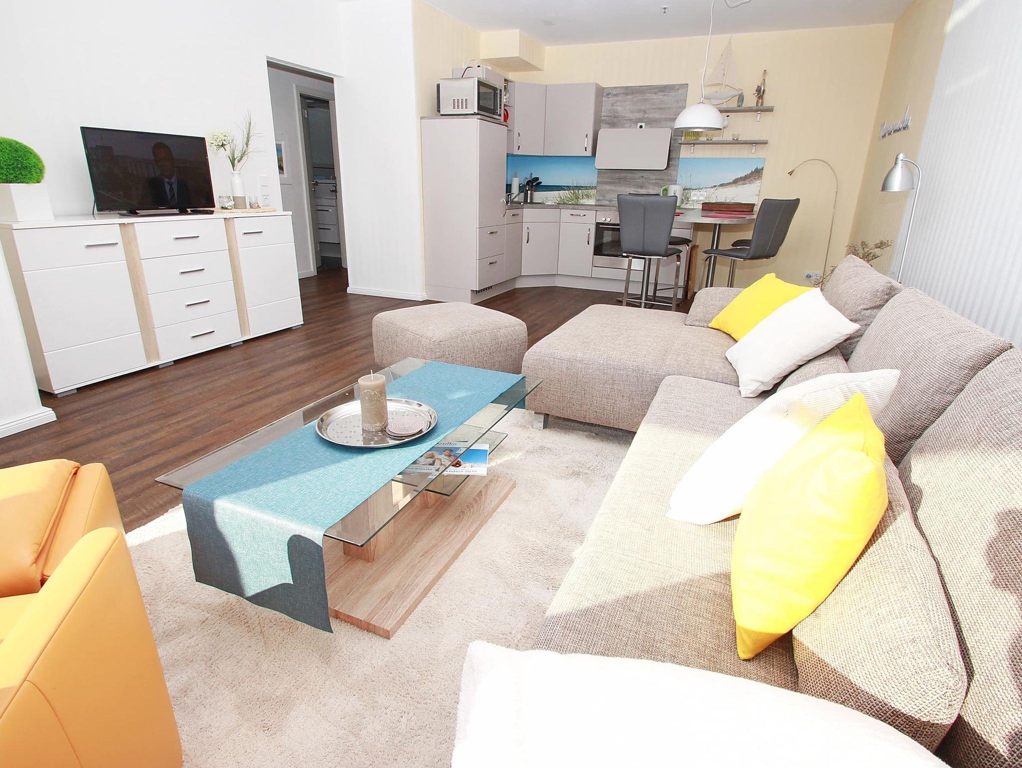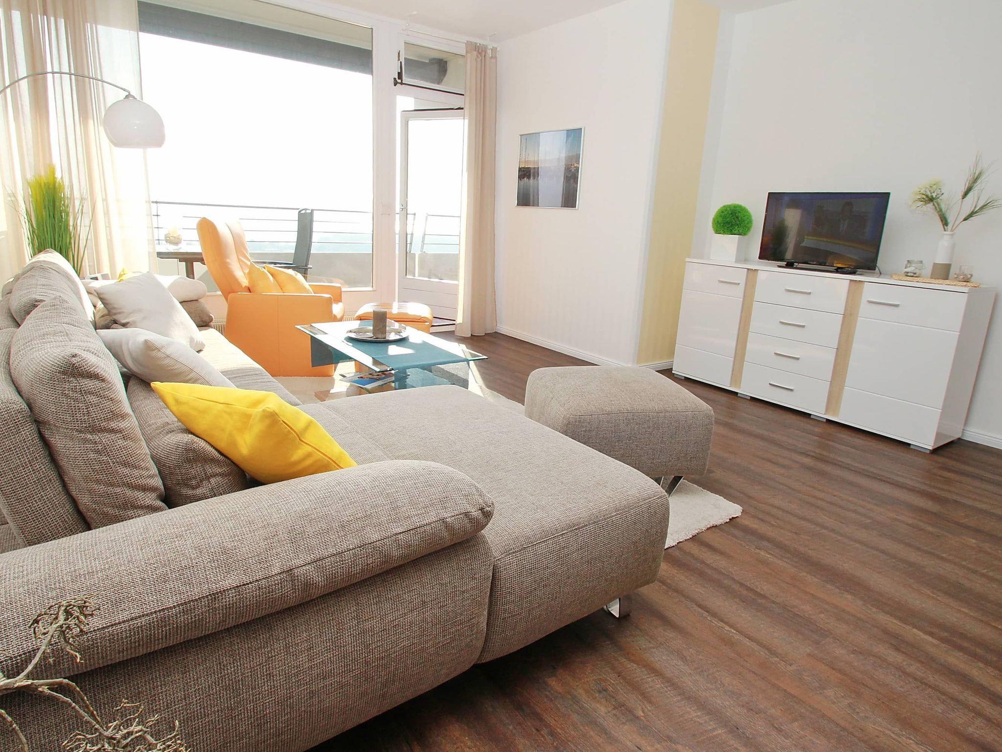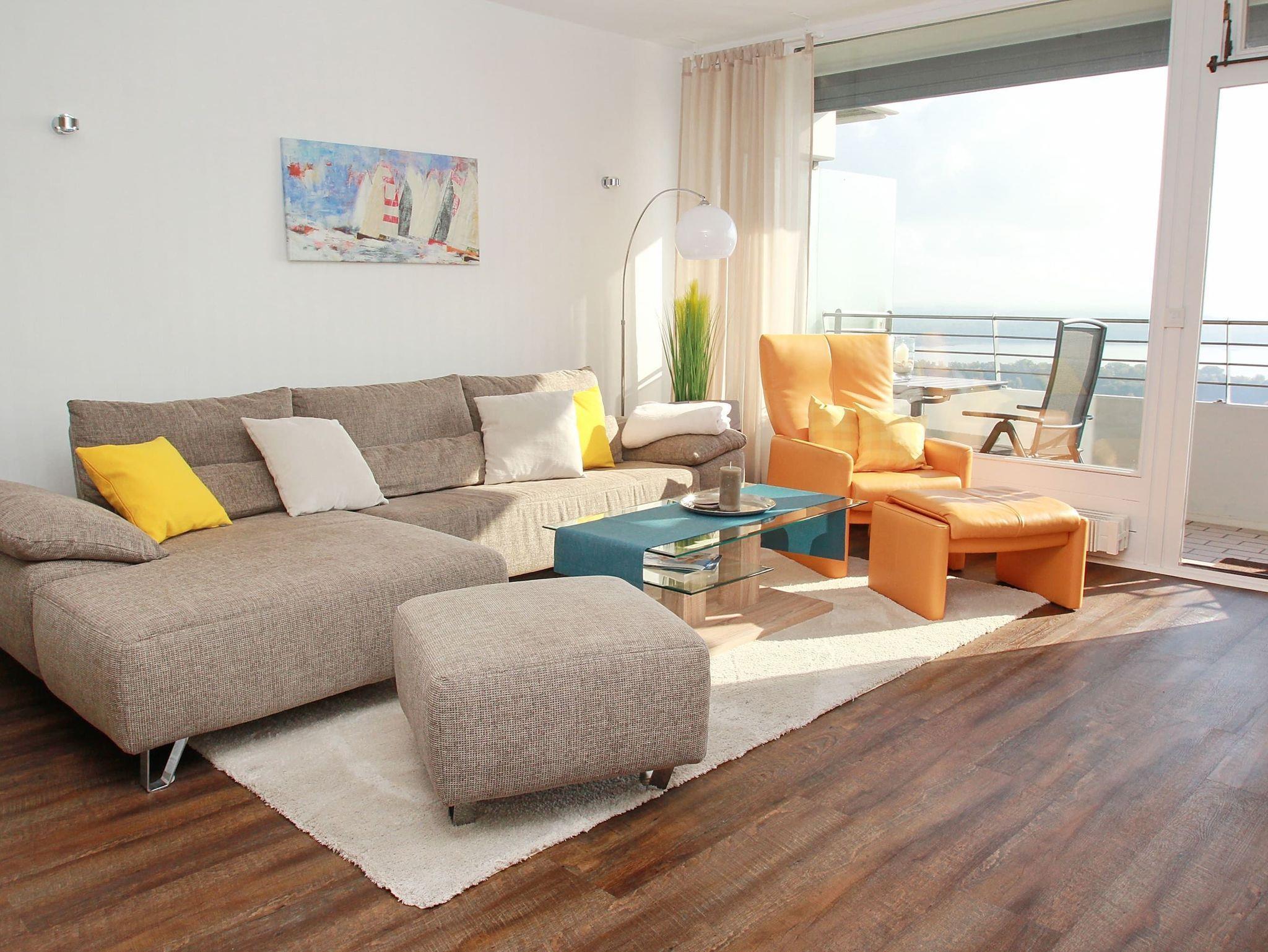 In diesem exklusiven Appartement, in dem der Wohlfühlcharakter garantiert ist, finden Sie eine sehr hochwertige Einrichtung vor. Im hellen Wohnzimmer erwartet Sie eine moderne, offene Küche mit integriertem Tresen und Hochstühlen. Die gemütliche Couch mit Ottomane und der Relaxsessel ergänzen den schönen Wohnbereich. Im Schlafzimmer stehen ein bequemes Doppelbett (2x 90 cm x 200 cm) und ein großzügiger Kleiderschrank. Das Duschbad, das Sie vom Flur erreichen, ist in warmen Farben gehalten. Die sehr geschmackvoll eingerichtete Wohneinheit lässt keine Wünsche offen und ist mit Designfußboden ausgestattet. Von beiden Wohnräumen haben Sie Zugang zum Balkon und genießen hier einen fantastischen Blick auf die Trave mit ein- und ausfahrendem Schiffsverkehr.