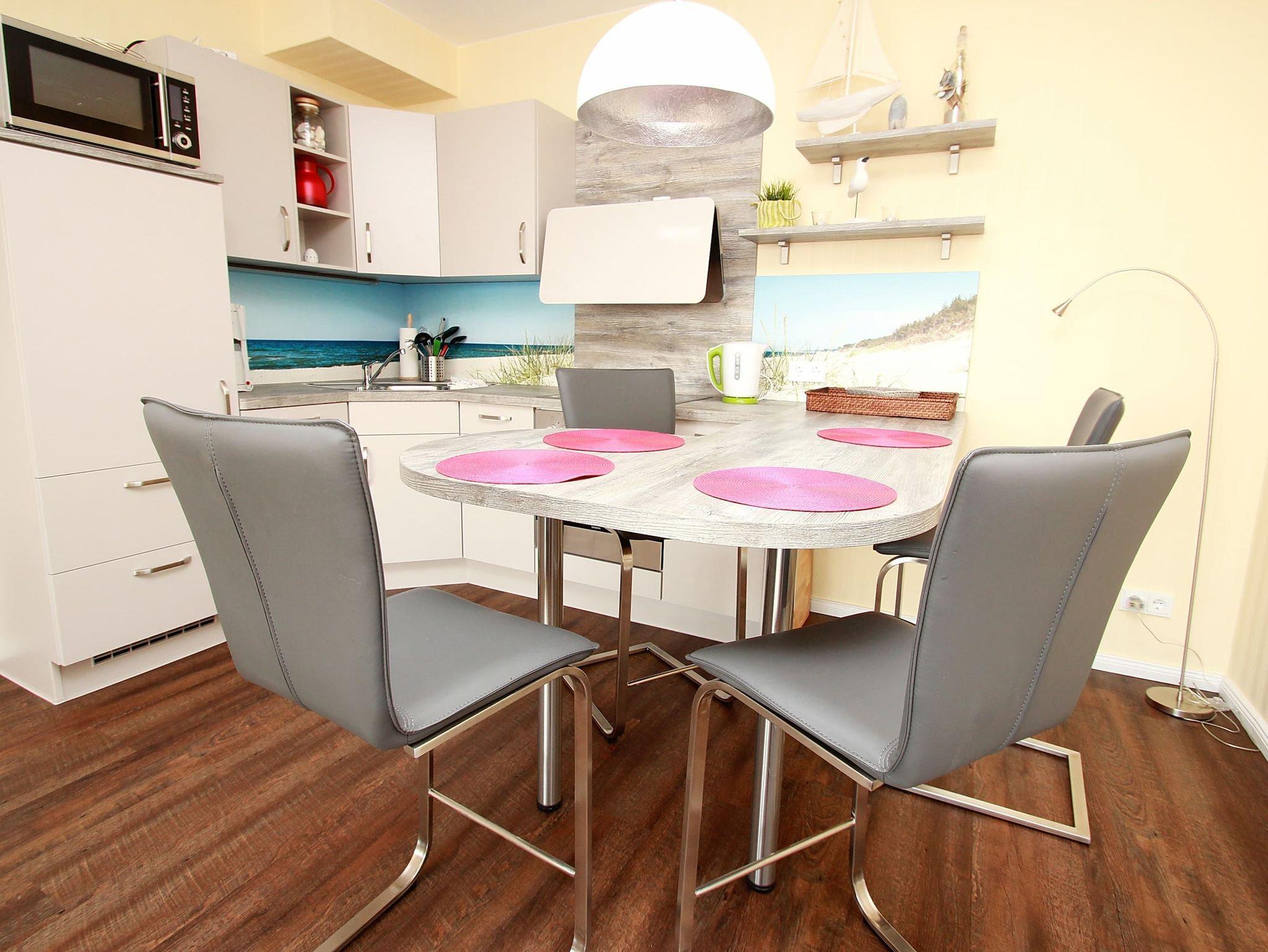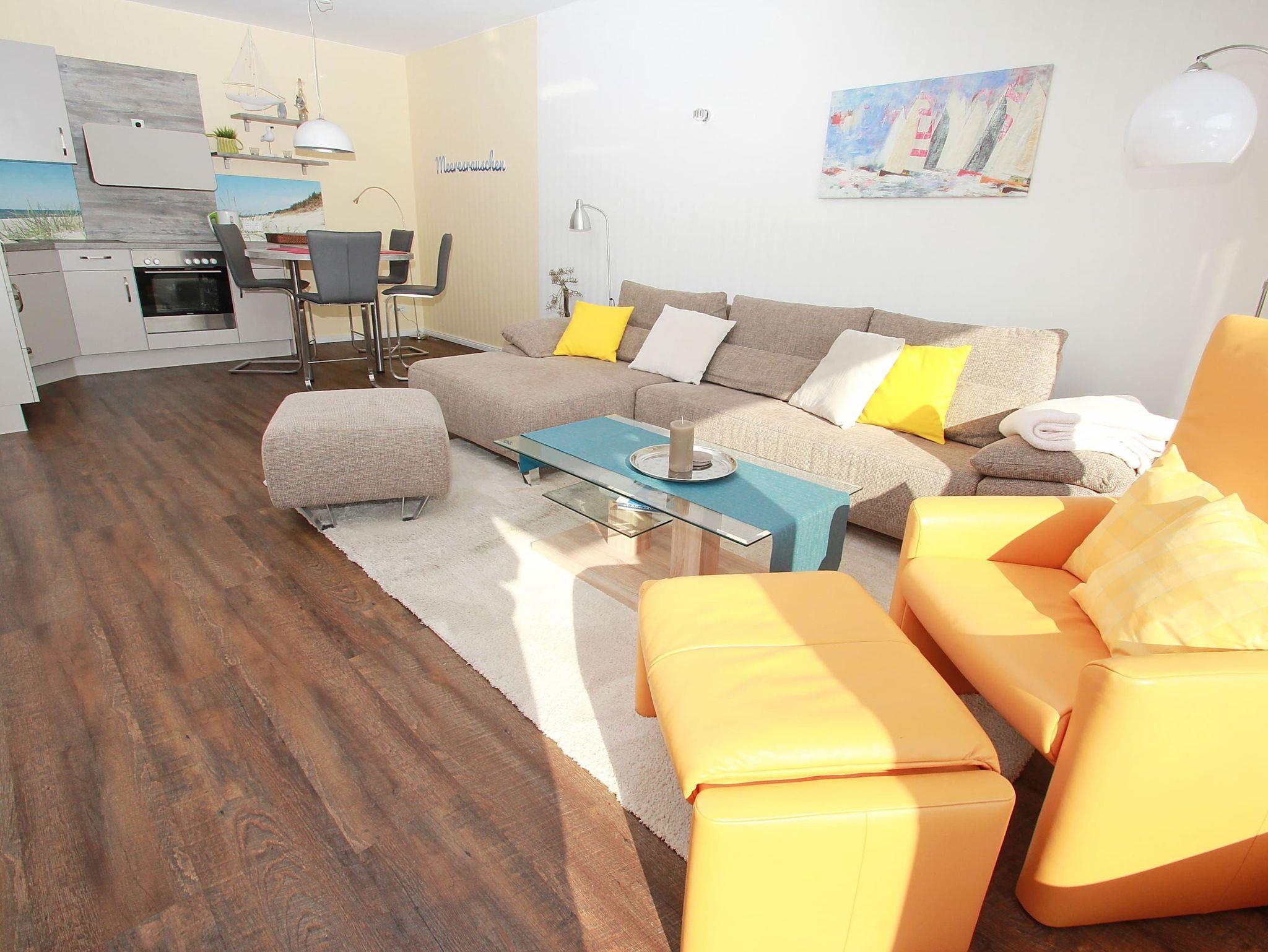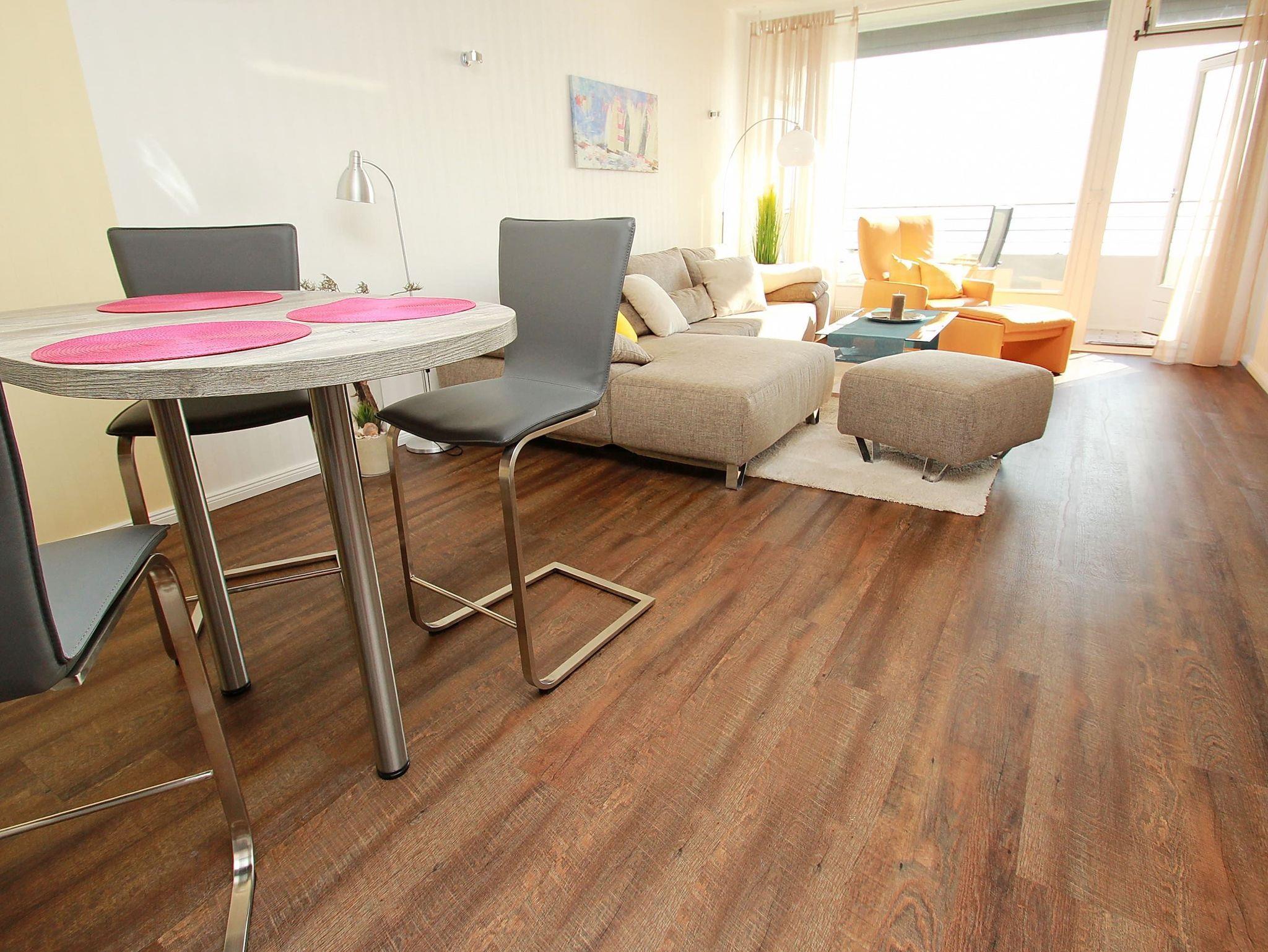 In diesem exklusiven Appartement, in dem der Wohlfühlcharakter garantiert ist, finden Sie eine sehr hochwertige Einrichtung vor. Im hellen Wohnzimmer erwartet Sie eine moderne, offene Küche mit integriertem Tresen und Hochstühlen. Die gemütliche Couch mit Ottomane und der Relaxsessel ergänzen den schönen Wohnbereich. Im Schlafzimmer stehen ein bequemes Doppelbett (2x 90 cm x 200 cm) und ein großzügiger Kleiderschrank. Das Duschbad, das Sie vom Flur erreichen, ist in warmen Farben gehalten. Die sehr geschmackvoll eingerichtete Wohneinheit lässt keine Wünsche offen und ist mit Designfußboden ausgestattet. Von beiden Wohnräumen haben Sie Zugang zum Balkon und genießen hier einen fantastischen Blick auf die Trave mit ein- und ausfahrendem Schiffsverkehr.