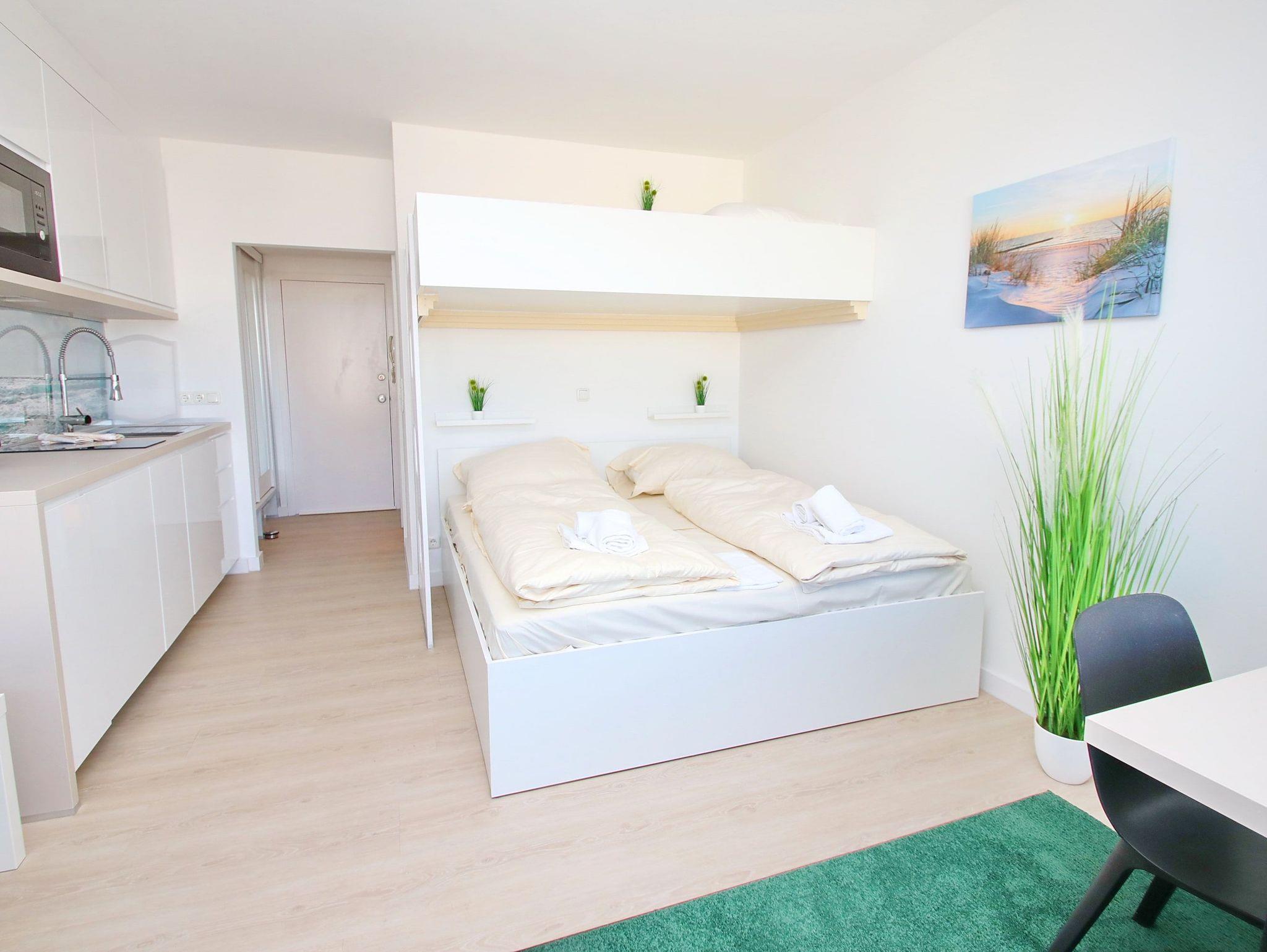 Dieses hochwertige und in 2022 komplett erneuerte Apartment entspricht vielen Ansprüchen und lädt von Anfang an zum Wohlfühlen ein. Der helle Wohnraum besteht aus einem komfortablen Doppel- ( 180 x 200 cm ) und einem Hochbett ( 120 x 200 cm ). Des Weiteren gehören zu der geschmackvollen Einrichtung eine Essecke mit Stühlen, einer Sitzbank und einer Coach. Ein großzügiger Kleiderschrank befindet sich direkt im Eingangsbereich. Der gesamte Wohnbereich ist mit einem Vinylboden in Holzoptik ausgestattet. Die moderne und große Küche ist ebenfalls im Wohnbereich integriert. Das moderne Duschbad erreichen Sie vom Flur. Diese fantastische Wohnung bietet ideale Voraussetzungen für einen erholsamen Urlaub. Überall wird ausgeklügelte, separat steuerbare Lichttechnik eingesetzt. Kostenloses WLAN und Smart TV sind natürlich auch vorhanden. Diese Wohnung im 1. Stock zeichnet sich durch kurze Wege im Haus und der besonders ruhigen Lage / Ausrichtung aus. Vom Balkon genießen Sie einen direkten Blick auf den Park und einen Teilmeerblick auf den Strand und die Ostsee mit den ein- und auslaufenden Schiffen.