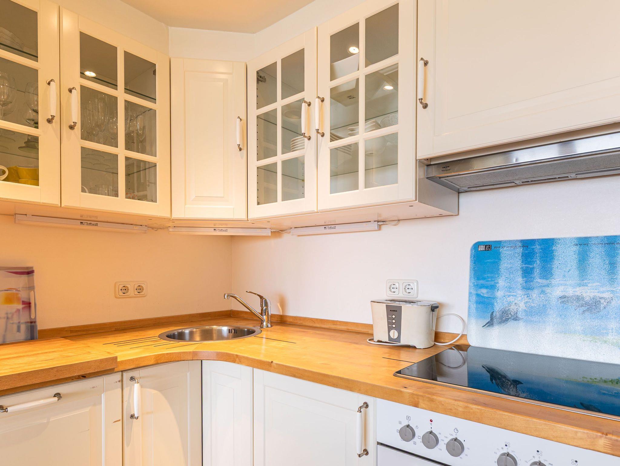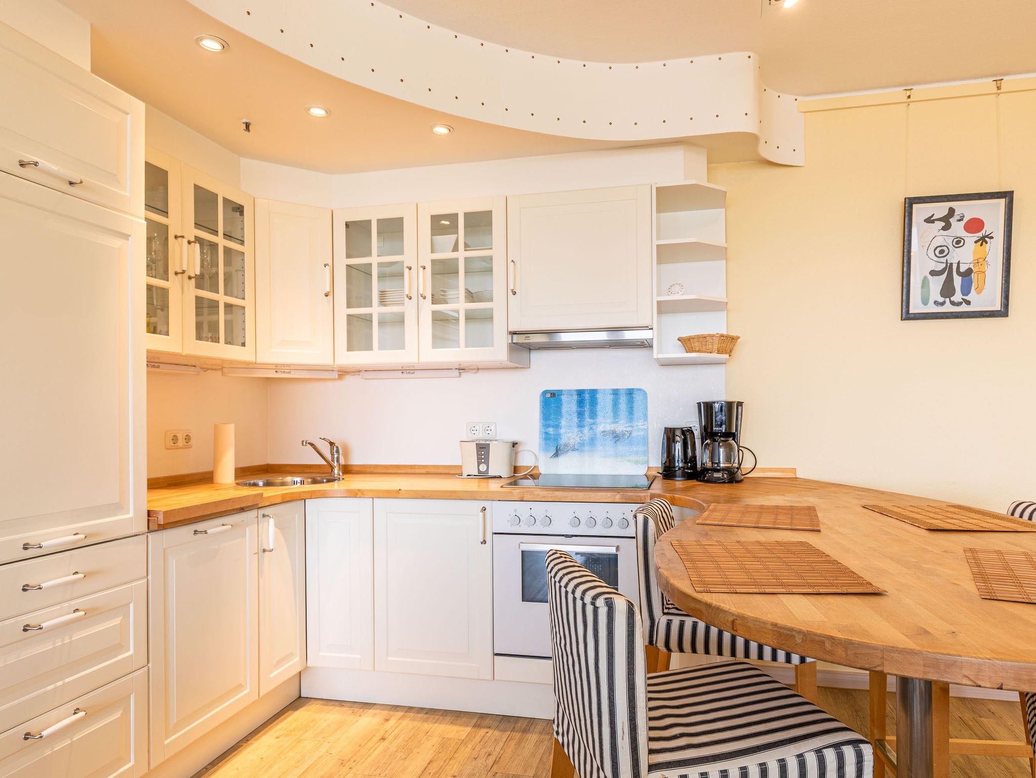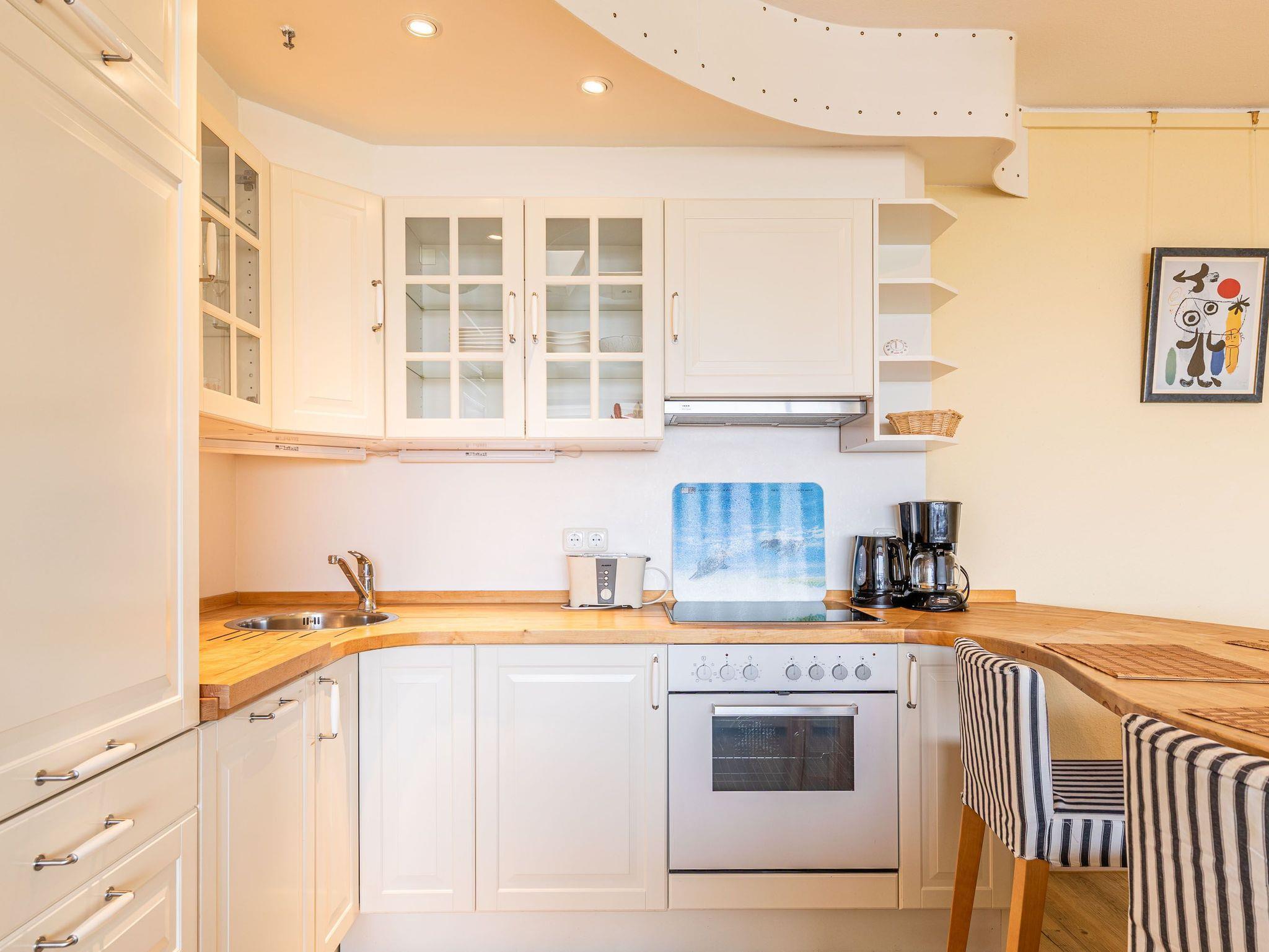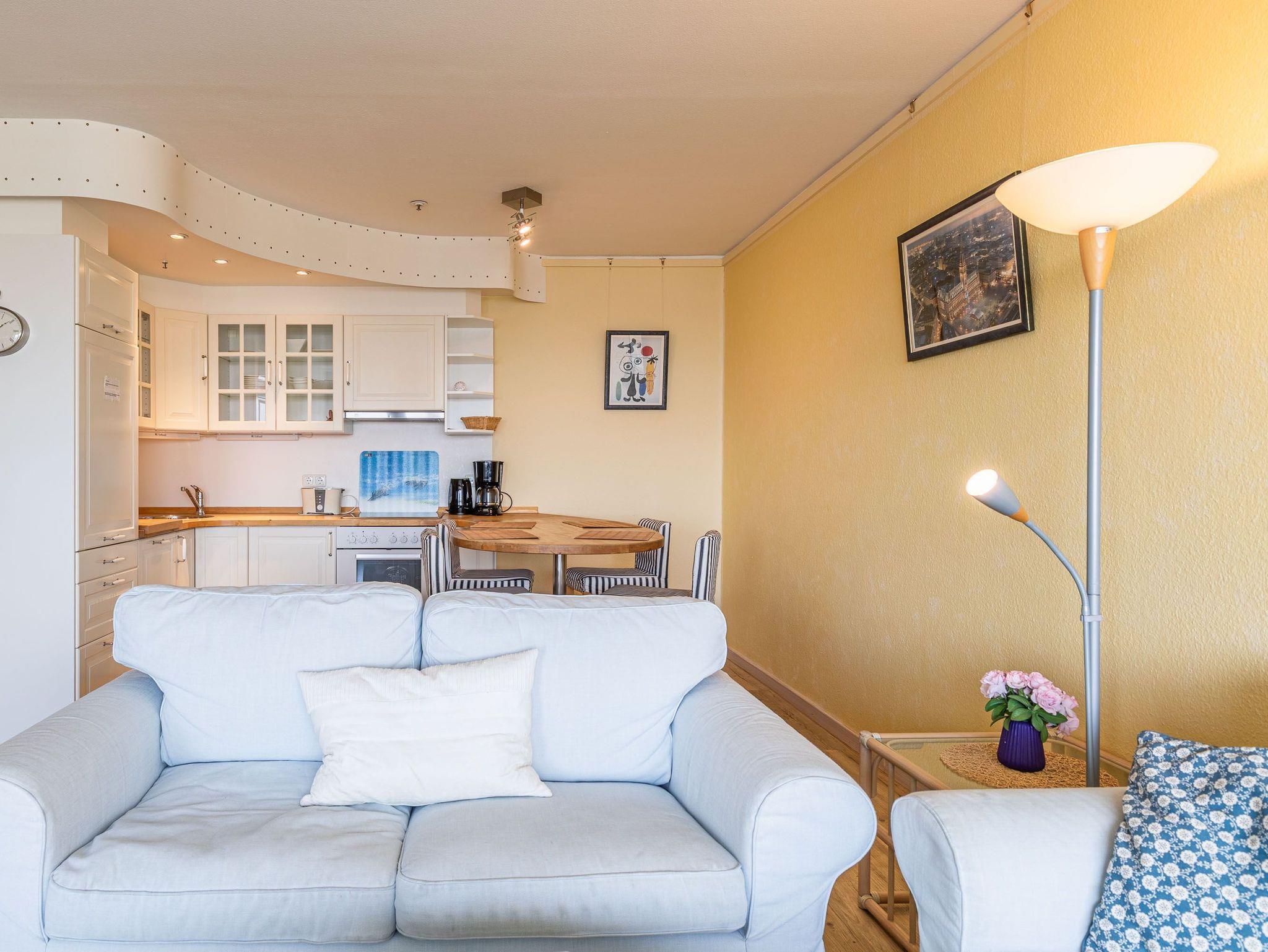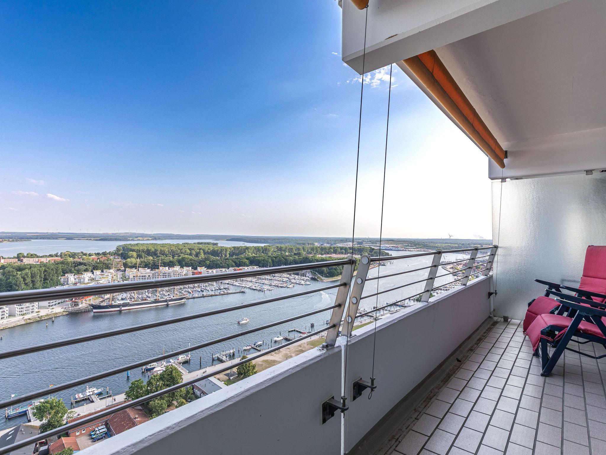 Dieses freundliche Appartement in traumhafter Lage hat eine ausgefallene und angenehme Einrichtung. Im hellen Wohnzimmer erwartet Sie eine offene Einbauküche mit Tresen und maritimen Hochstühlen. In der anderen Wohnraumhälfte befinden sich eine gemütliche zweiteilige Couchgarnitur mit einer Ottomane und einem Beistelltisch vor dem Fenster sowie ein antiker Vitrinenschrank. Im Schlafzimmer stehen ein bequemes Doppelbett (2x 90 cm x 200 cm) und ein schöner Kleiderschrank. Das moderne Bad geht vom Flur ab. Von beiden Wohnräumen haben Sie Zugang zum großen Balkon und genießen hier einen herrlichen Panoramablick direkt auf die Trave mit ein- und ausfahrendem Schiffsverkehr, auf die Lübecker Bucht und zum Hafen.