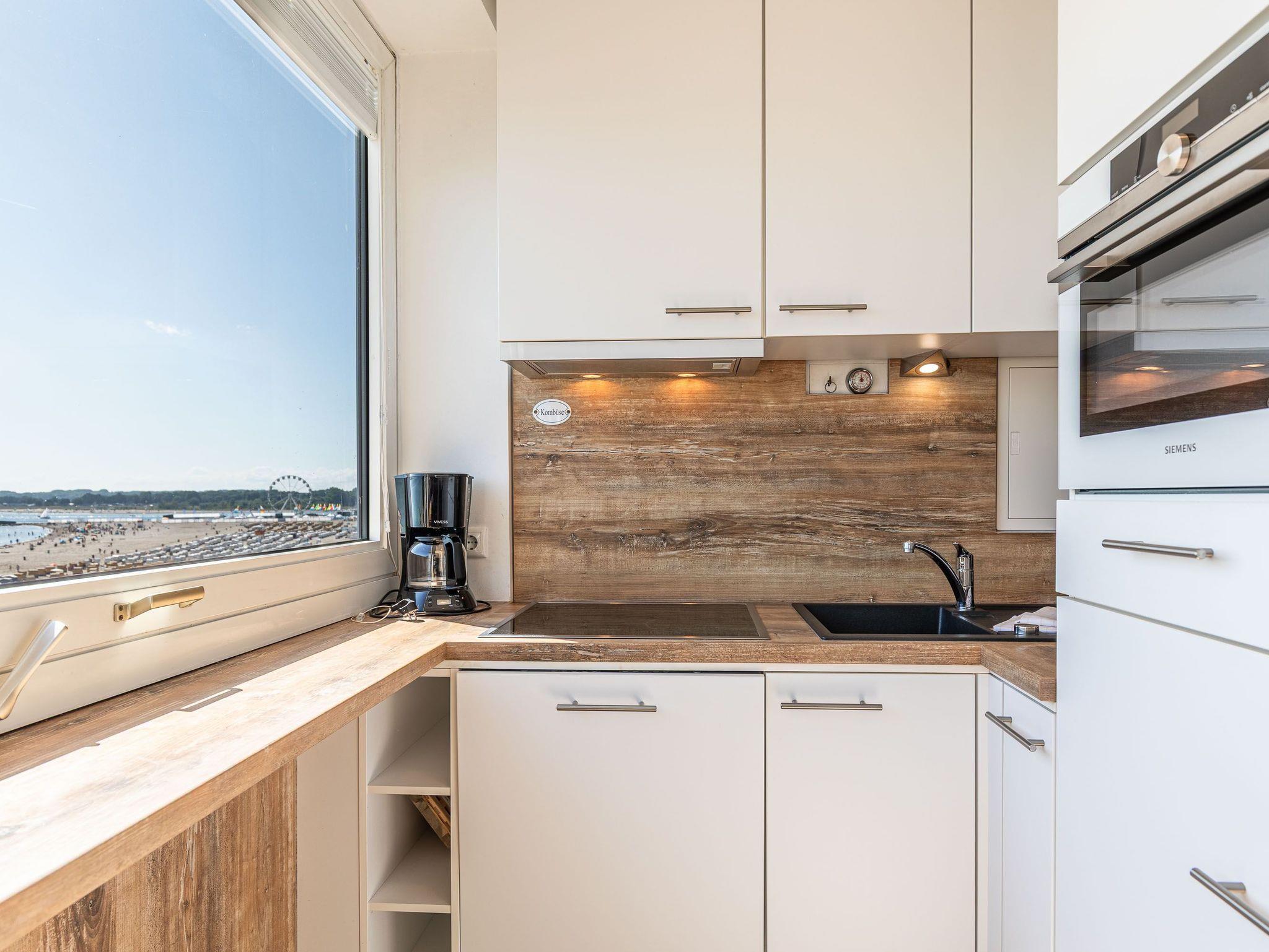 Genießen Sie pures Ostseeflair in der ersten Reihe. Dieses direkt am Strand gelegene Appartement mit Zugang zur Strandpromenade ist modern und geschmackvoll eingerichtet. In diesem sonnendurchfluteten Appartement befinden sich ein Doppelschrankbett (2x 70 cm x 200 cm) und ein Hochtisch mit bequemen Barstühlen. Im Eingangsbereich steht Ihnen ein großer Kleider- und Abstellschrank zur Verfügung. Eine kleine Kommode, sowie eine sehr gemütliche Couch mit Couchtisch runden die liebevoll gestaltete Einrichtung ab. Das Duschbad geht vom Flur ab. Von der offenen Küche, von der Wohnung und dem sonnigen Balkon erleben Sie den uneingeschränkten Panoramablick direkt über den Strand und die gesamte Lübecker Bucht.