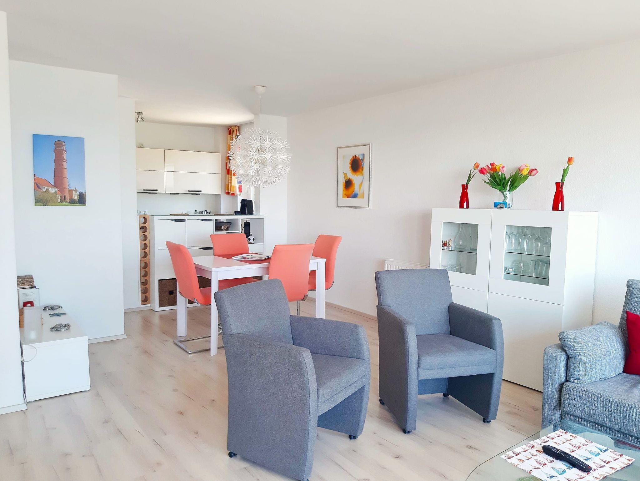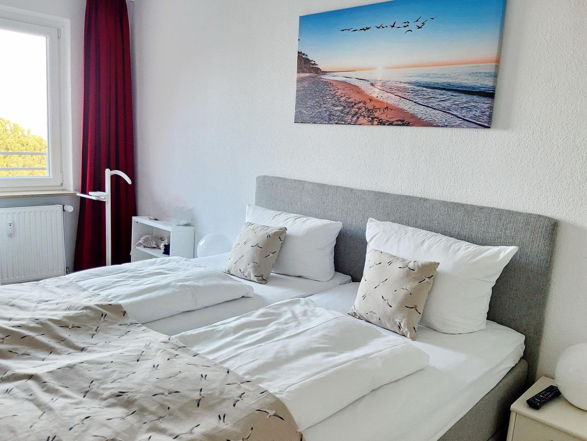 Ihr Urlaub am Strand. Diese großzügige und geschmackvoll eingerichtete 2-Zimmer-Wohnung liegt am Strand sowie an der Liegewiese und bietet Ihnen alle Voraussetzungen für einen erholsamen Familienurlaub an der Ostsee. Im Wohnzimmer, dieser hell eingerichteten und modern ausgestatteten Ferienwohnung, finden Sie ein gemütliches Sofa mit Schlaffunktion, sowie 2 elegante Sessel. Die offene und komfortabel bestückte Küche mit kleinem Tresen zum Wohnzimmer, verfügt über einen modernen 4-Flammen-Herd sowie über einen Geschirrspüler. Im Wohnbereich befindet sich zudem die Essecke bestehend aus einem Tisch und 4 Stühlen. Ihr Schlafzimmer verfügt über ein großzügiges und bequemes Boxspringbett und ein Kleiderschrank sowie einen TV. Das moderne Duschbad mit Eckdusche geht vom Flur ab. Vom großen Balkon können Sie ganztägig das bunte Treiben auf dem Wasser sowie an der Strandpromenade beobachten.