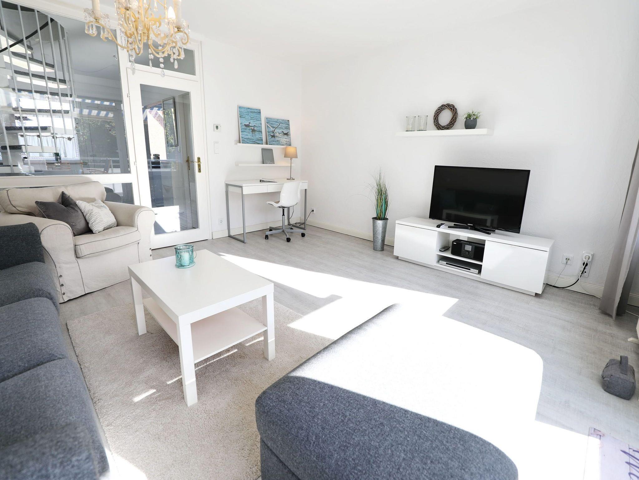 Stylisch eingerichtet auf insgesamt 70 m² befindet sich in dieser Ferienwohnung alles, was man sich für einen entspannten Familien-Urlaub in Travemünde wünscht. Die offen gestaltete Maisonette-Wohnung in ruhiger Wohnlage bietet Ihnen einen Ort der Erholung und Entspannung. Drei Zimmer mit separaten Schlafbereichen, Balkon und Küche bieten Platz für bis zu fünf Gästen. In der unteren Ebene befindet sich der Wohnbereich mit einer gemütlichen Couch, einem bequemen Sessel mit Fußhocker sowie einem großen TV. Vom Wohnzimmer gelangen Sie auch auf dem Balkon mit Blick in die Grünanlage. Im Eingangsbereich der Ferienwohnung befindet sich das Esszimmer mit moderner Küche sowie ein Gäste-WC. Über eine Wendeltreppe gelangen Sie in die obere Etage mit zwei separaten Schlafzimmern. In dem großen Schlafzimmer steht ein gemütliches Doppelbett (180x200) sowie ein Einbauschrank mit viel Stauraum. Das kleine Schlafzimmer verfügt zum einen über ein bequemes Doppelbett (140x200) als auch ein Einzelbett (80x200). Das Badezimmer mit Dusche befindet sich ebenfalls in der oberen Etage.