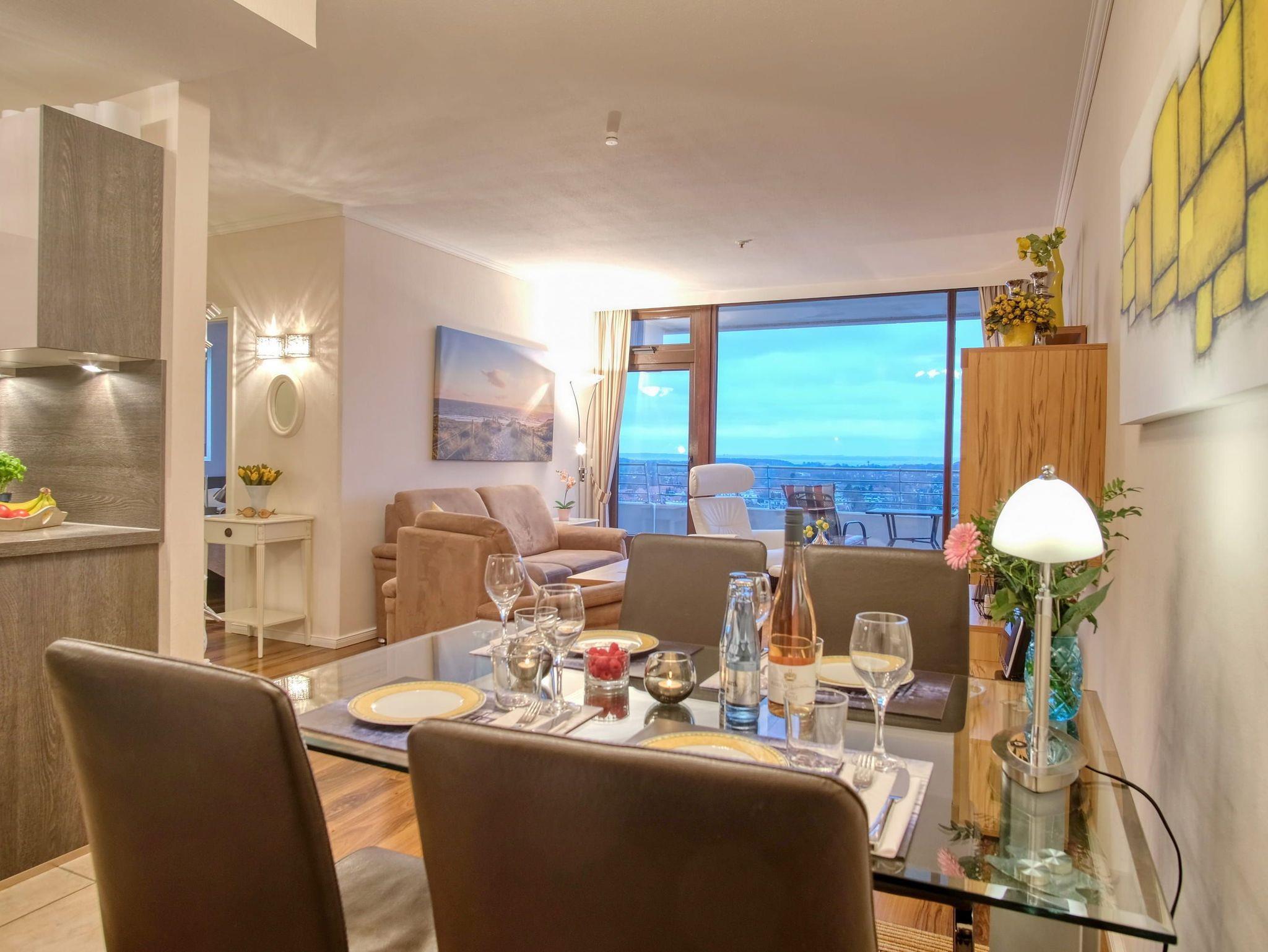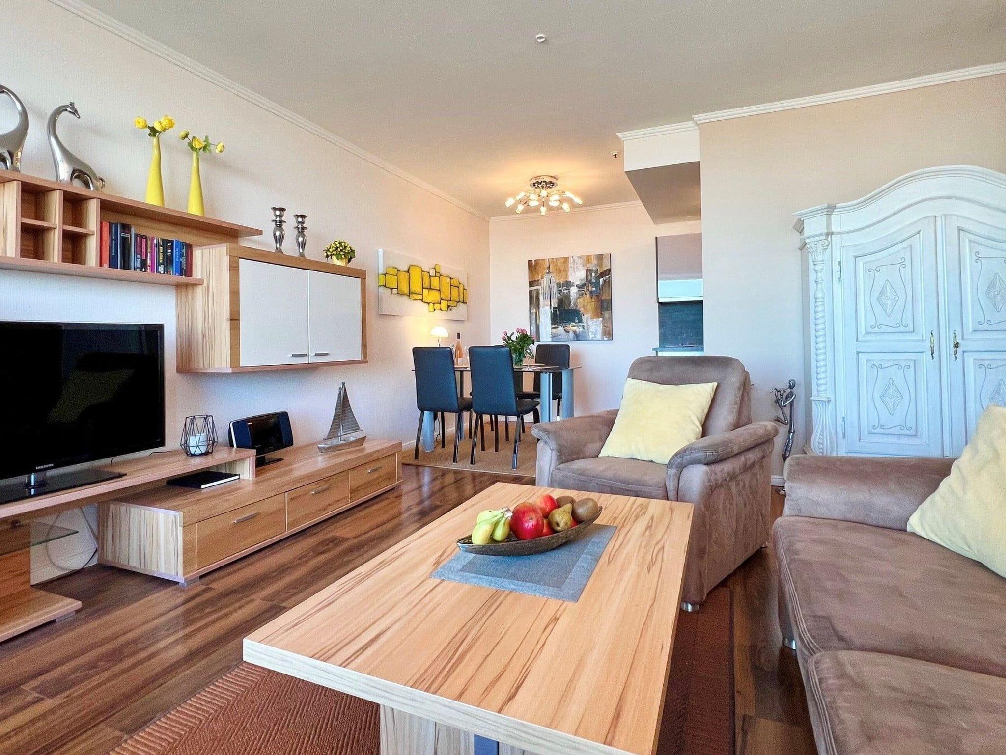 Dieses elegante, exklusive Appartement entspricht höchsten Ansprüchen und lädt sofort zum Wohlfühlen ein. Im sehr geschmackvoll eingerichteten Wohnbereich befinden sich eine gemütliche zweiteilige Couchgarnitur mit Tisch, eine moderne Vitrinen Wohnwand und eine Essecke neben der neuen Küche. Des Weiteren befindet sich separat in der Wohnraumnische eine hochwertiges Doppelbett (140 cm x 200 cm). Im schönen Schlafzimmer stehen ein bequemes Doppelbett (2x 90 cm x 200 cm) und ein großzügiger Kleiderschrank. Das moderne, helle Duschbad geht vom Flur ab. Schicke Accessoires verleihen diesem farblich abgestimmten Appartement ein ganz besonderes Ambiente. Den großen Balkon erreichen Sie von beiden Zimmern. Hier genießen Sie einen fantastischen Blick auf den Strand und die Lübecker Bucht.