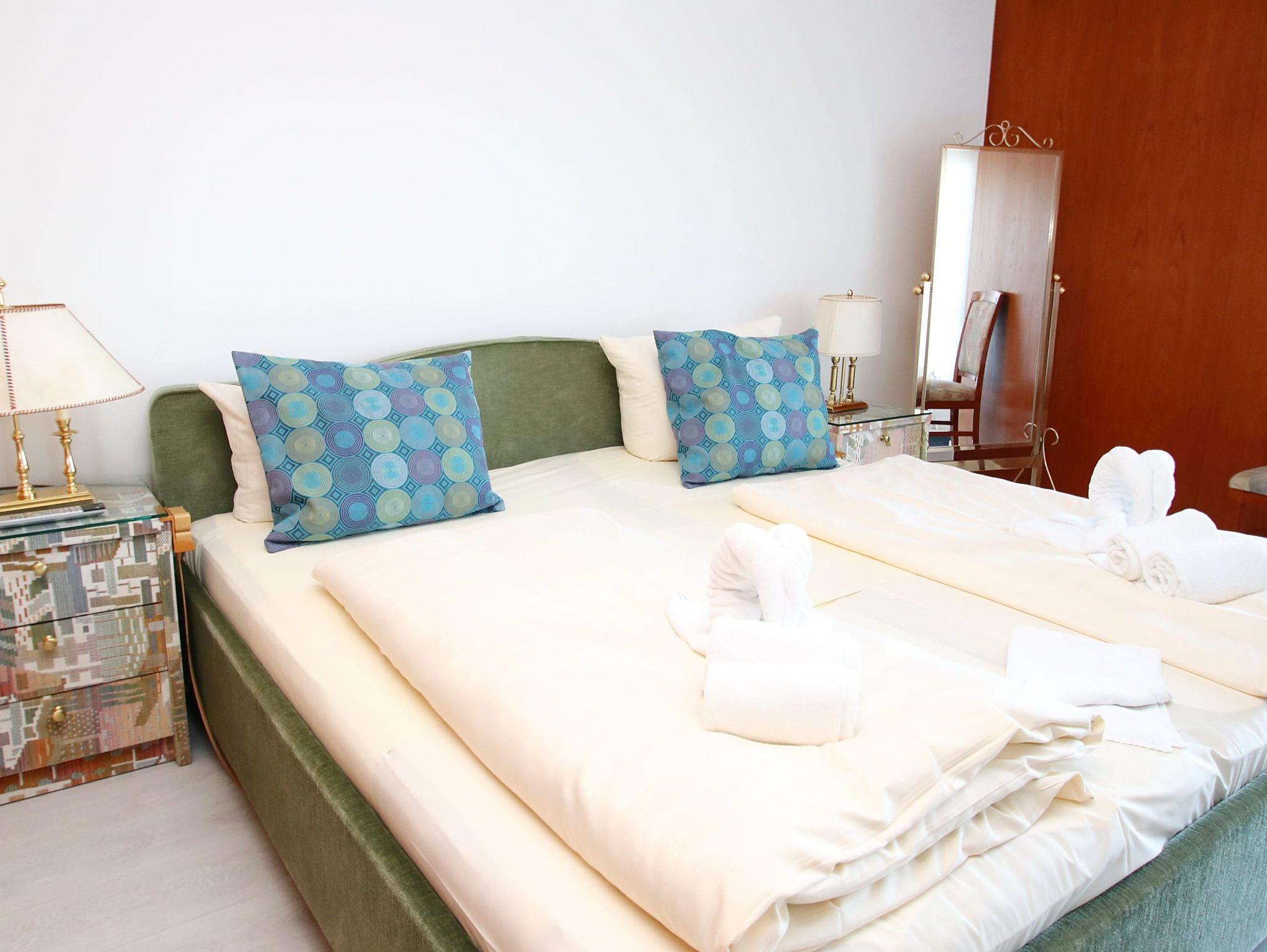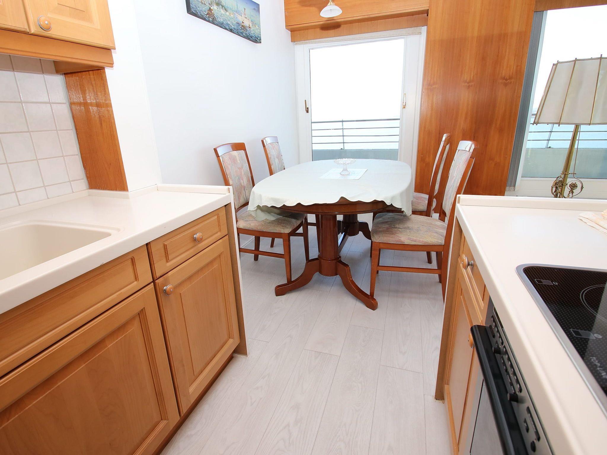 Highlight dieser komfortablen Ferienwohnung ist die traumhafte ost-süd-west ausgerichtete Lage mit Blick zum Strand und zur Ostsee sowie auf die Trave mit ein- und ausfahrendem Schiffsverkehr. Der großzügige Wohnraum besteht aus einer bequemen Rundcouch mit Tisch, einem Relaxsessel und Vitrinenschränken. Die Wohnung wurde 2025 komplett neu möbliert. Ein weiteres Highlight ist das moderne WLAN TV mit über 300 HD Sendern davon 70 Pay TV Sendern und Netflix HD. Des Weiteren finden Sie, neben der offenen Einbauküche (Durchreiche wurde 2021 entfernt), eine Essecke vor. Im hellen Schlafzimmer stehen ein Doppelbett (2x 100 cm x 200 cm) und ein großer Einbauschrank. Das weitere Schlafzimmer ist mit einem bequemen Doppelbett (2x 100 cm x 200 cm) und einem Kleiderschrank ausgestattet. Das Bad, welches vom Flur abgeht, ist 2021 modernisiert worden. Den überdimensionalen Eckbalkon zur Ostsee und zur Trave erreichen Sie von allen Wohnräumen, um den tollen Panoramablick zu genießen.