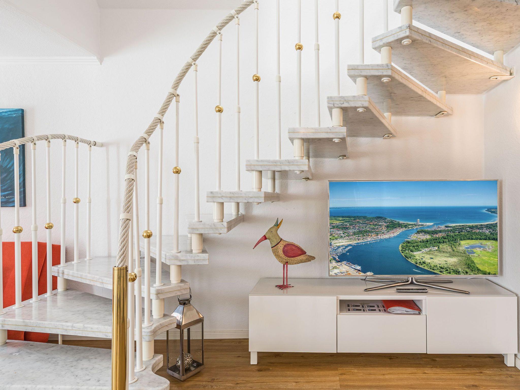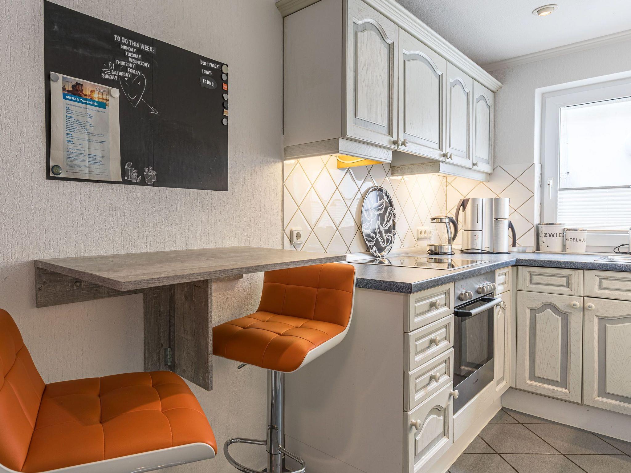 Das behagliche Wohnzimmer ist mit einer Couchgarnitur, einem Tisch und einer Anrichte ausgestattet und lädt zu gemütlichen Abenden ein. Die hochwertige Küche mit Geschirrspüler und Mikrowelle ist direkt vom geräumigen Flur aus erreichbar. Im Obergeschoss befinden sich das moderne Duschvollbad/WC sowie das schöne Schlafzimmer mit großem Kleiderschrank. Zusätzlich steht im Erdgeschoss ein Gäste-WC zur Verfügung.